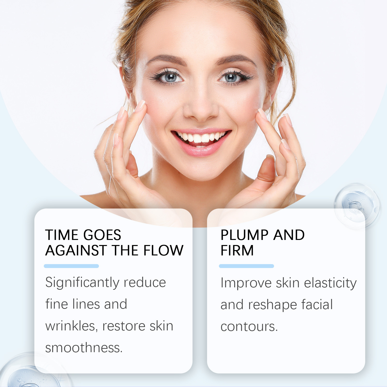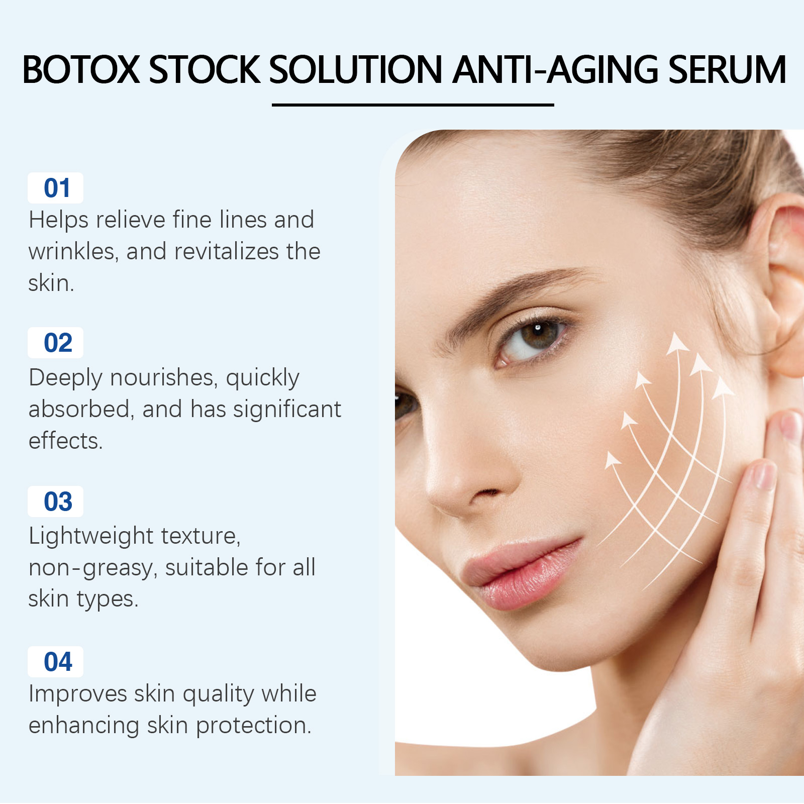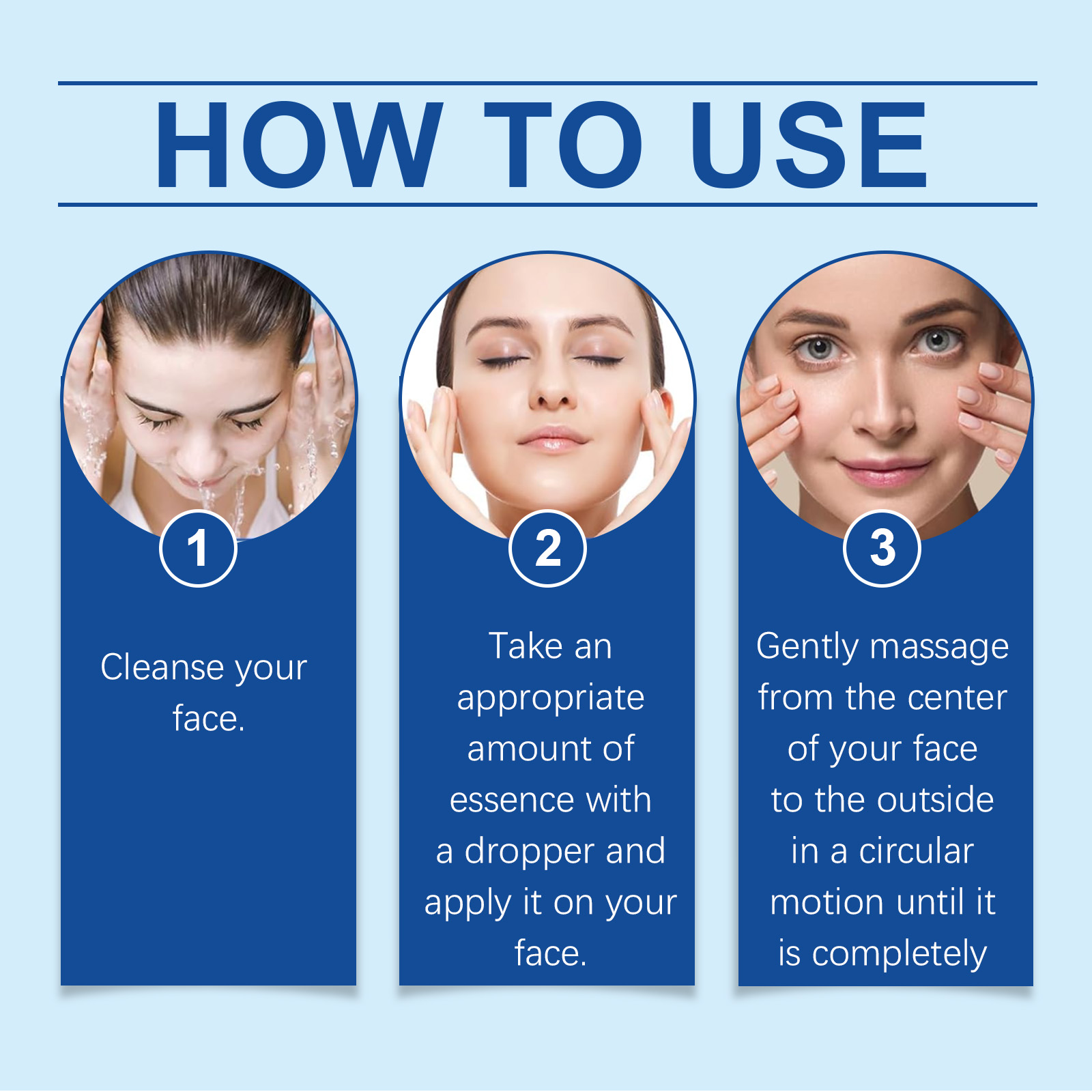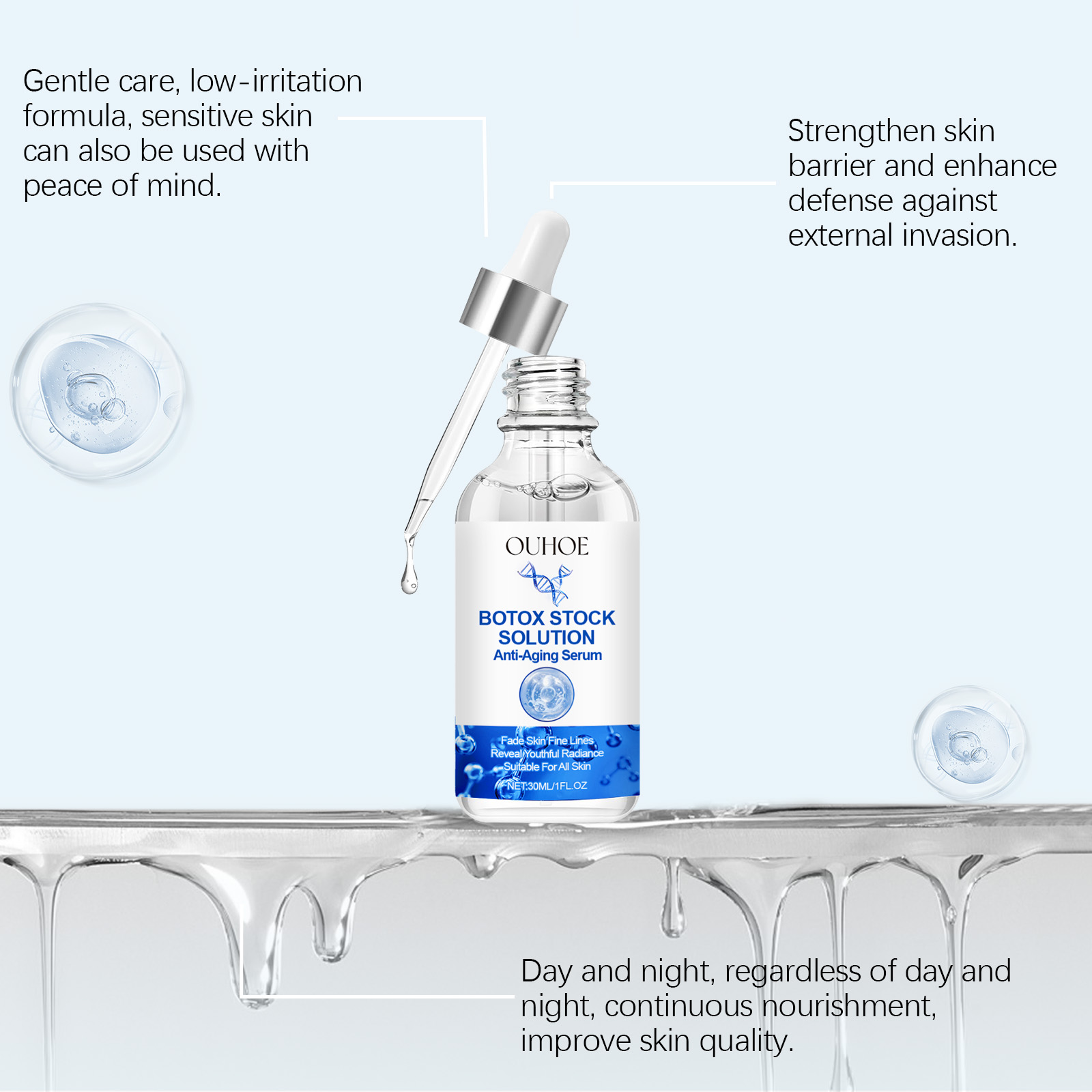 Our facial essence contains nicotinamide and vitamin C. It can deeply hydrate, lock in moisture for a long time, and make the skin plump and bright. Lock in moisture throughout the day, keep the skin tender, smooth and bid farewell to dryness. Its usage method is very simple: Clean your face, take an appropriate amount of essence with a dropper and apply it to your face. Gently massage in circular motions from the center of the face to the outside until it is completely done. And it can improve skin elasticity and reshape facial contours.