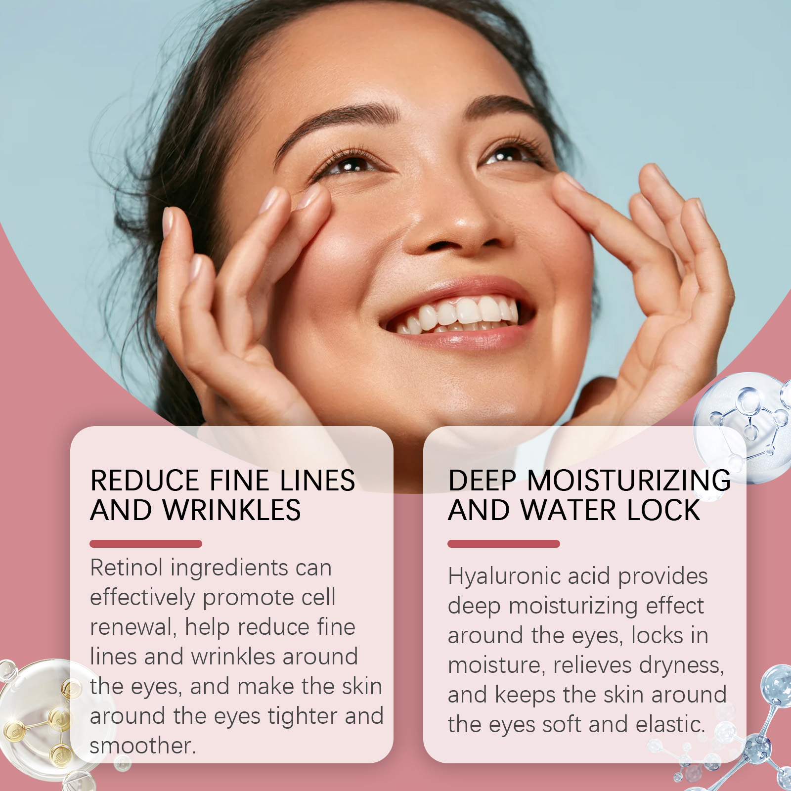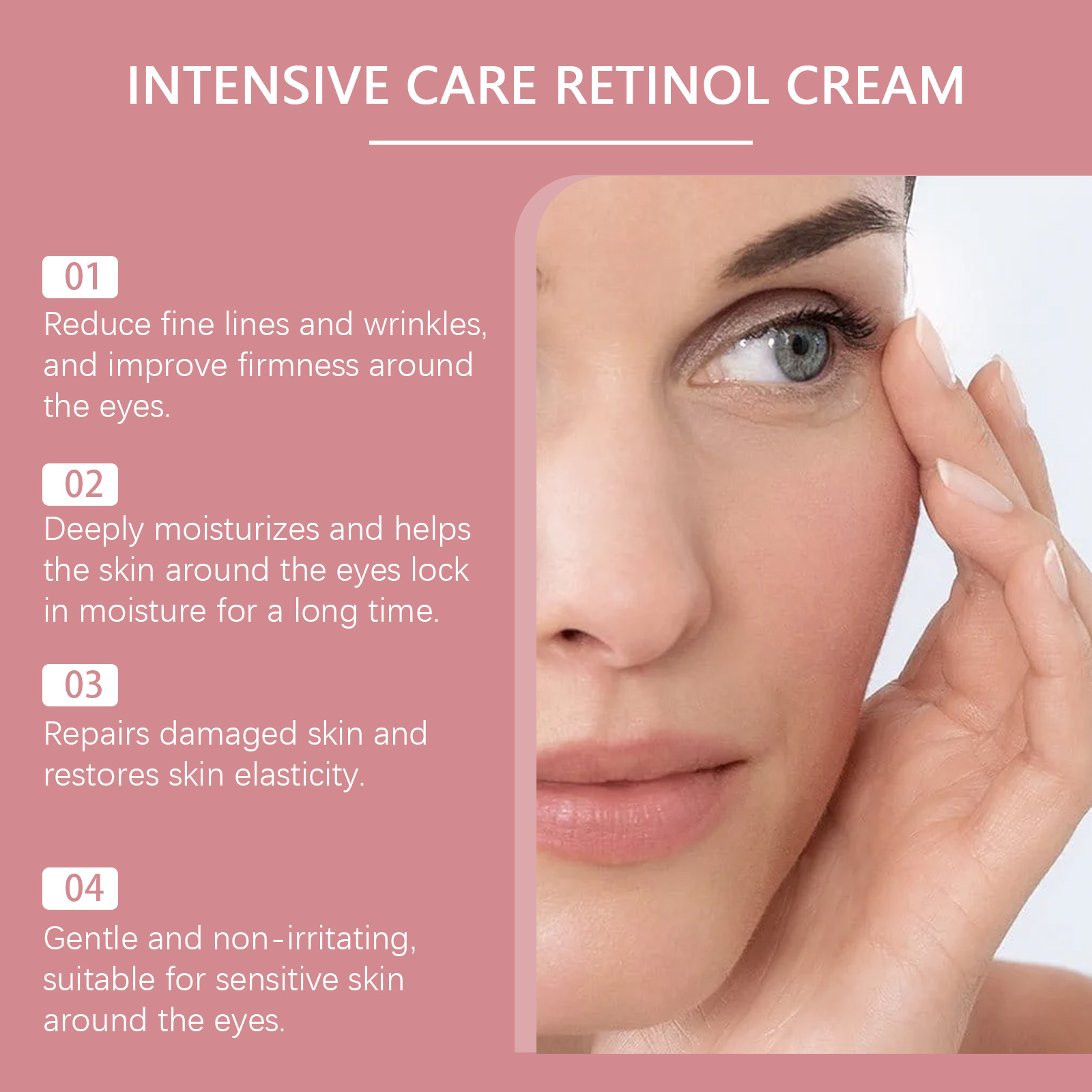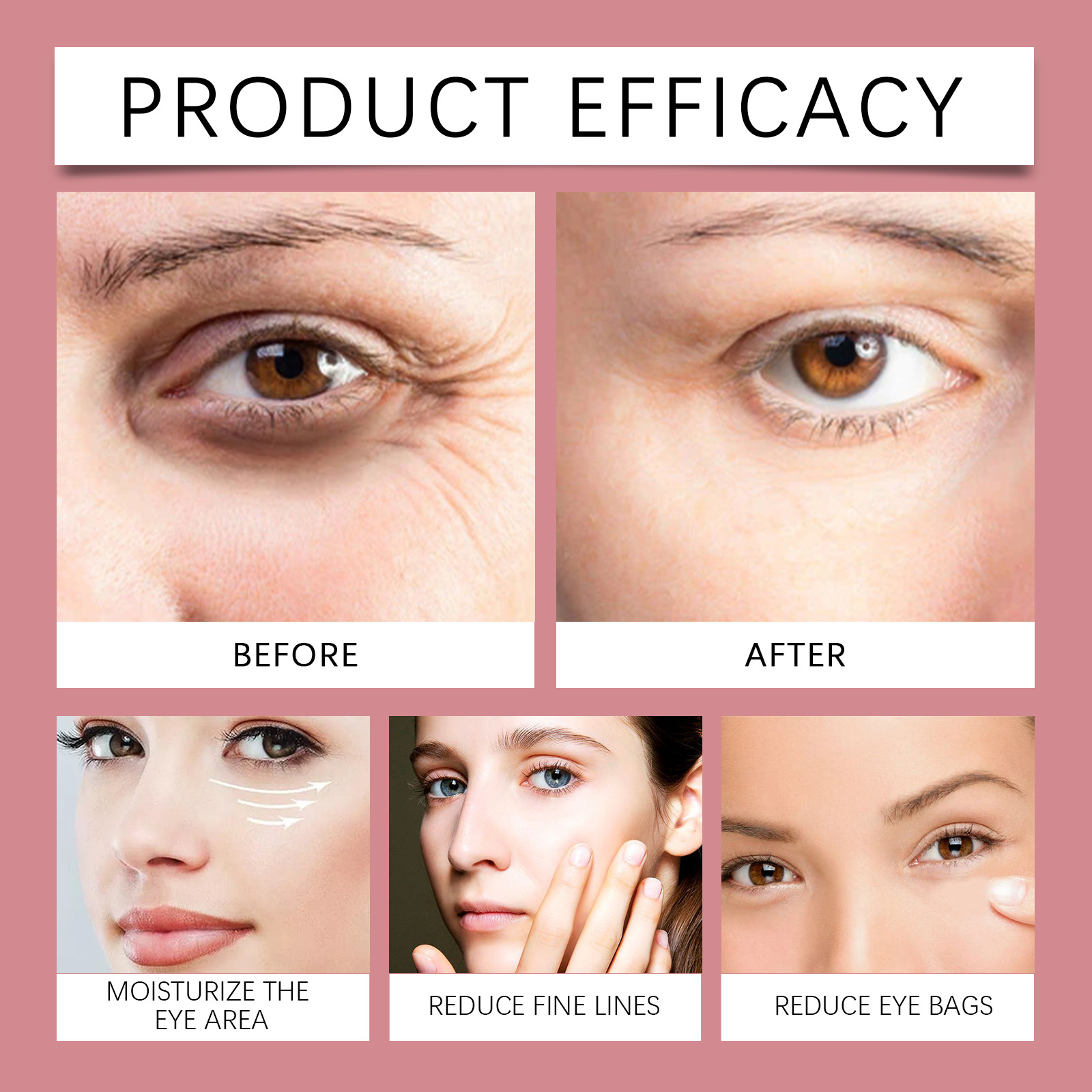 Our firming eye cream contains allantoin, vitamin E(tocopherol). It provides a deep moisturizing effect around the eyes, locks in moisture, relieves dryness and keeps skin soft and elastic around the eyes. Its application is simple: clean the skin around the eyes and keep it dry. Apply appropriate amount of this product to the skin around the eyes, gently massage until absorbed. It can also improve the skin's self-repair ability and enhance the health of the skin around the eyes.