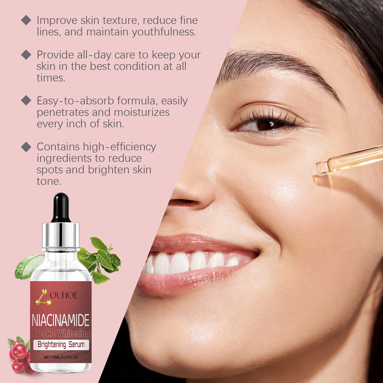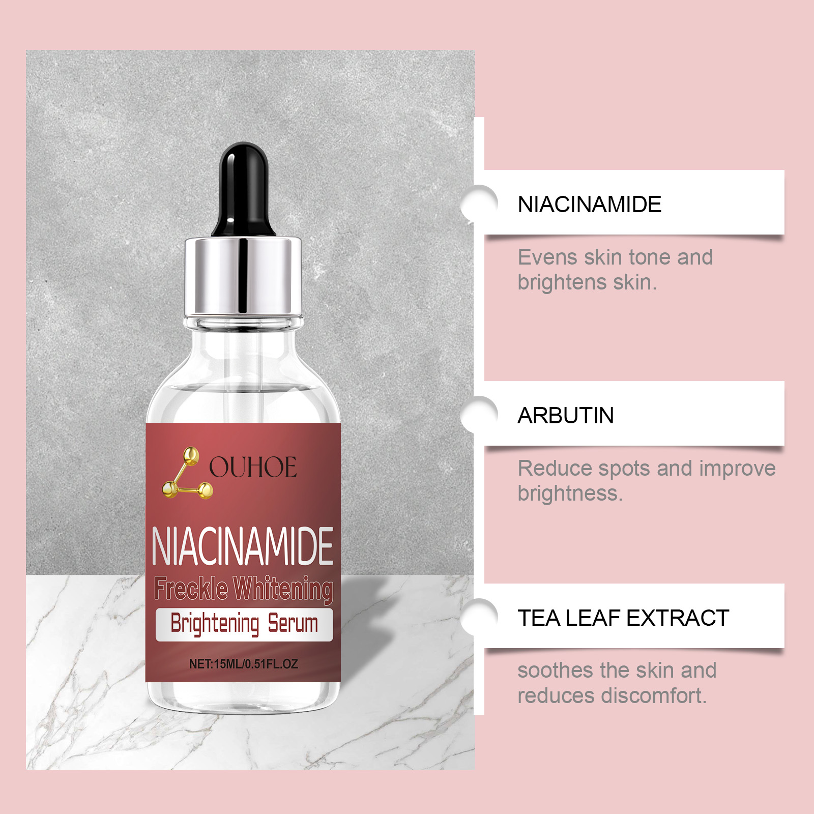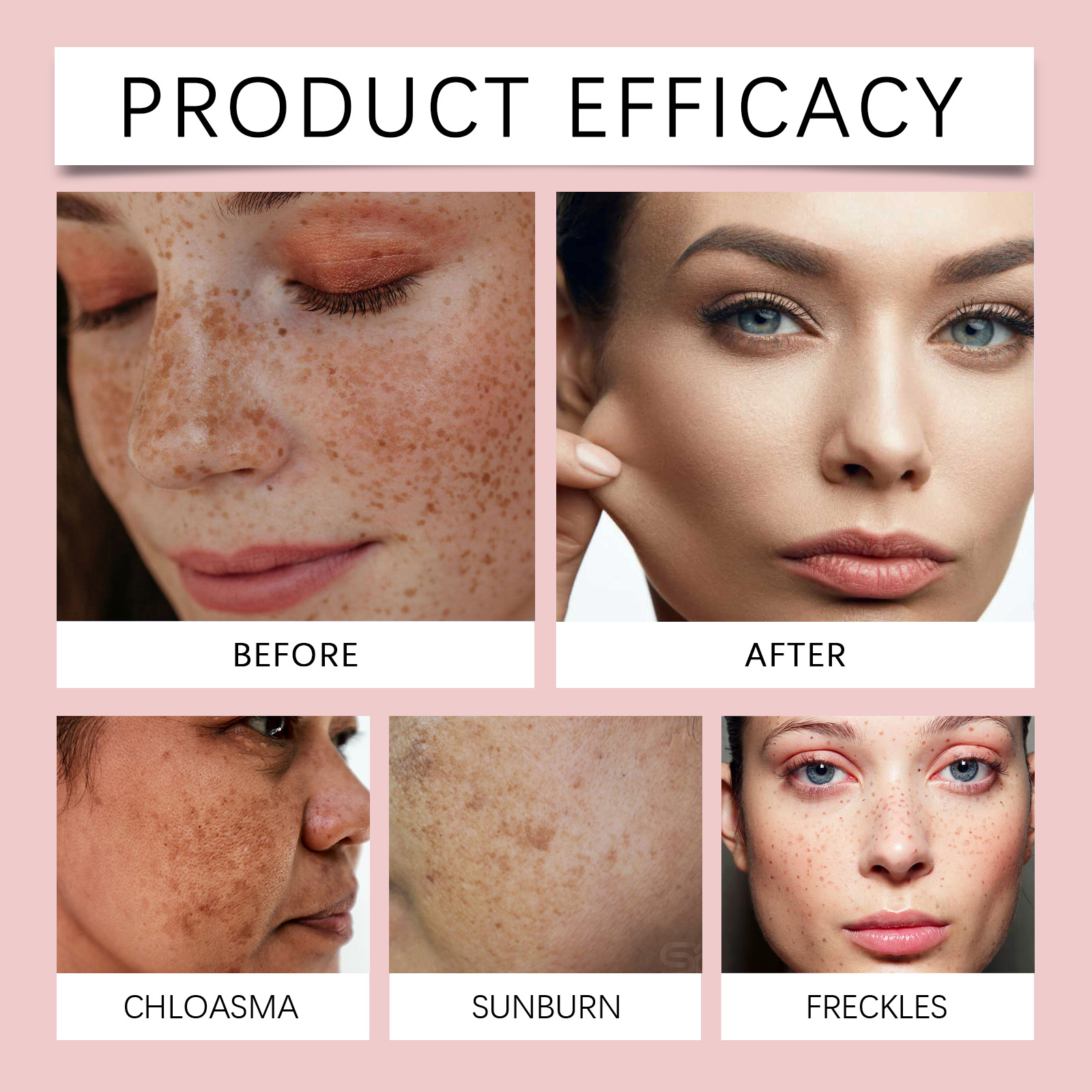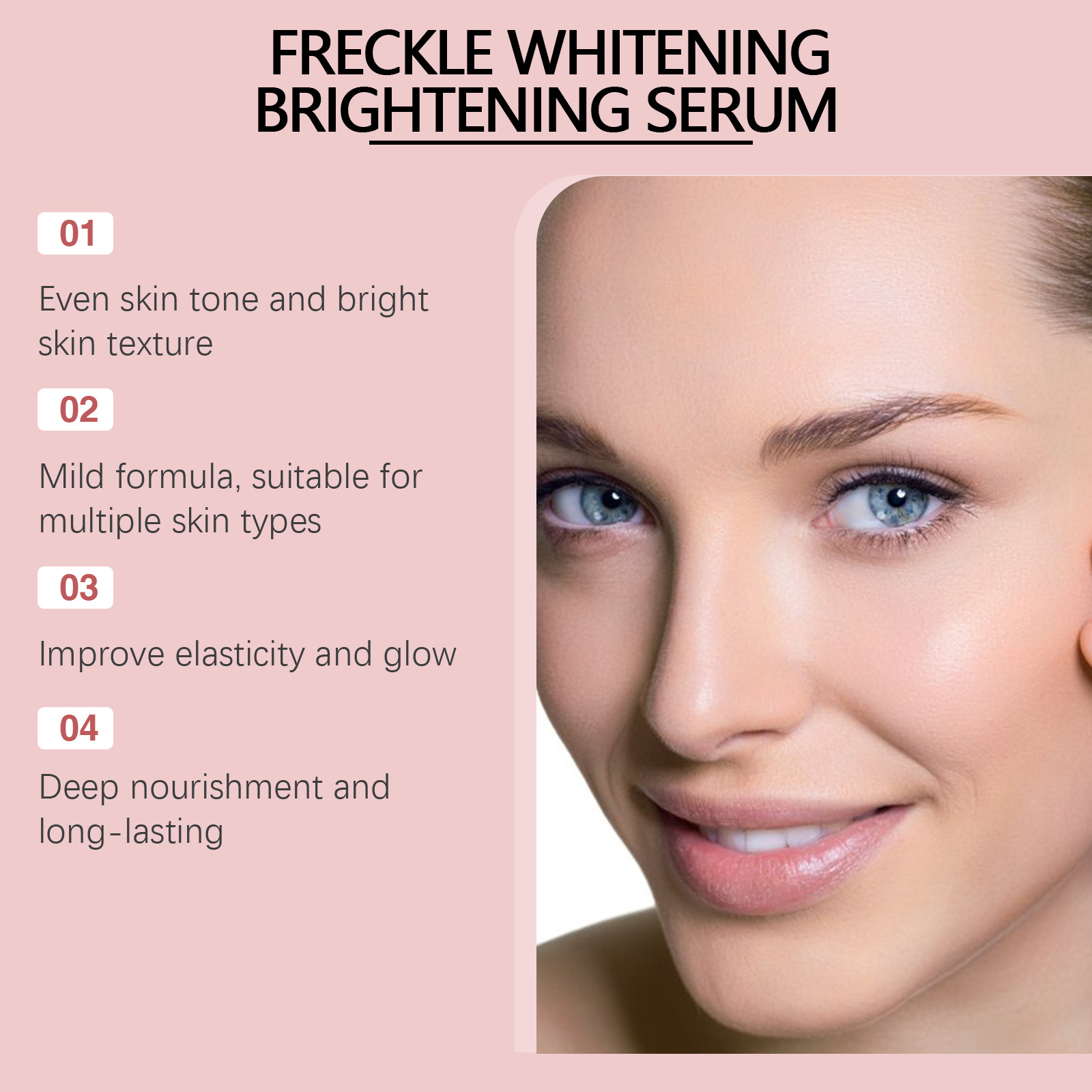 Our Freckle Whitening Brightening Serum contains Niacinamide, Arbutin, Camellia Sinensis Leaf Extract. It improves skin, reduces fine lines, maintains youthful vitality and provides all-day care to keep your skin looking its best at all times. Its use method is very simple: clean the facial skin, keep dry, apply appropriate amount of this product evenly on the face, gently massage until completely absorbed. It can even out skin tone, lighten skin tone, reduce spots, soothe skin and reduce discomfort.