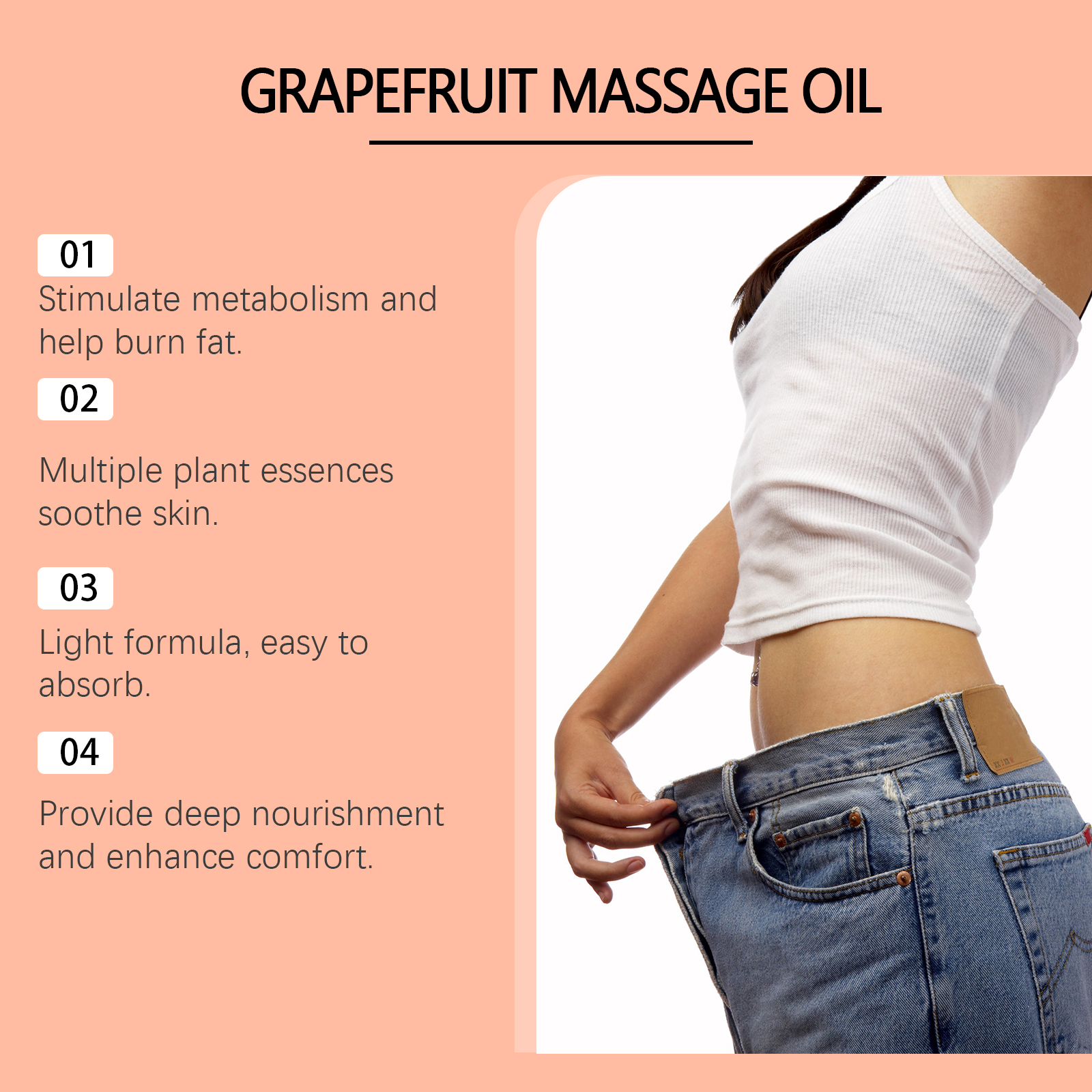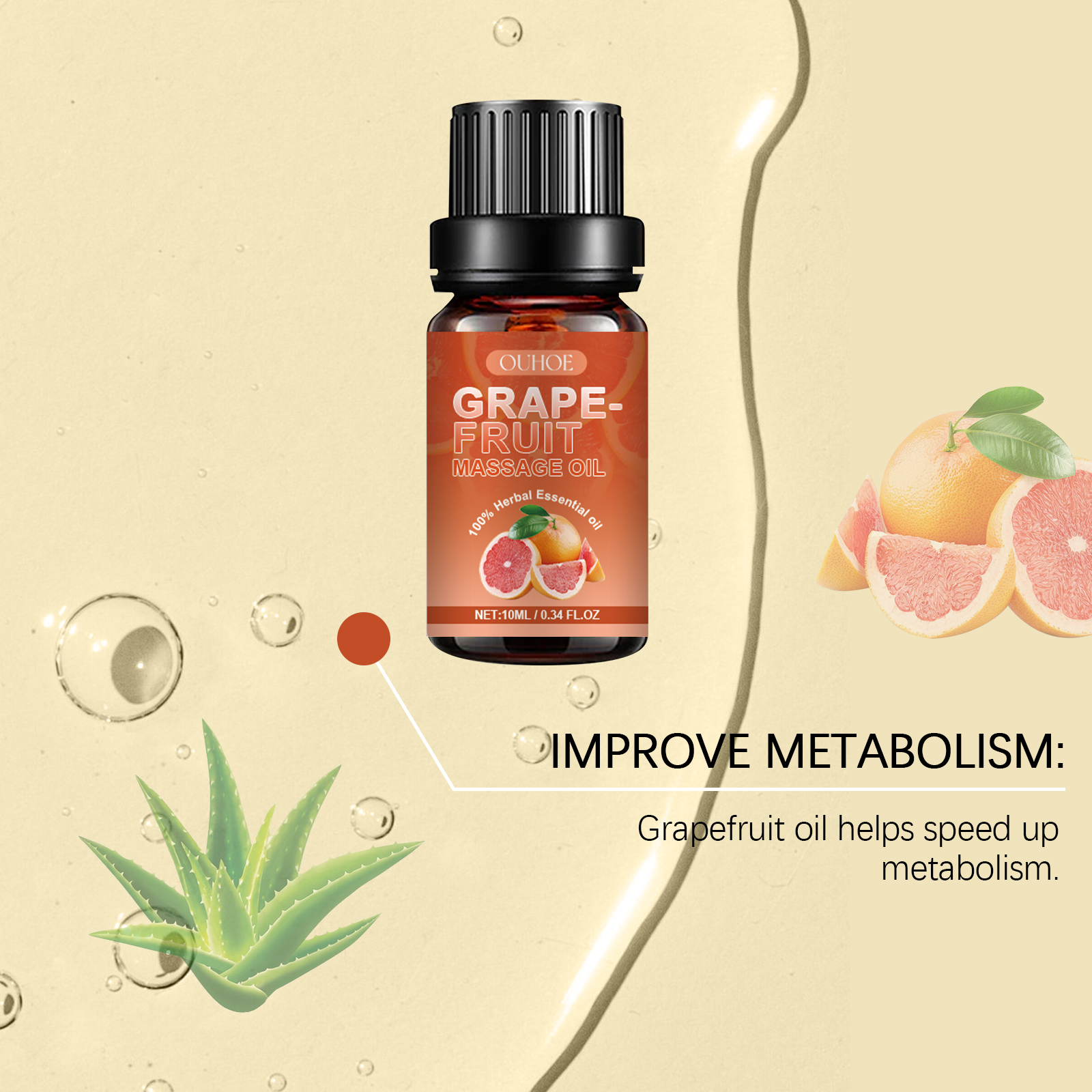 Our grapefruit massage oil contains coffee extract, aloe vera extract. It can boost metabolism and help burn fat. Its use method is very simple: clean the navel and the surrounding skin, keep the skin dry, take an appropriate amount of essential oil, evenly apply to the abdomen skin, massage in a circular motion, starting from the navel, moving clockwise outward to promote blood circulation and the absorption of essential oil. And can provide deep nutrition, enhance comfort.