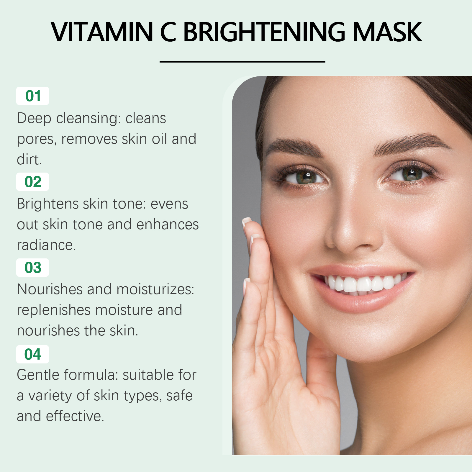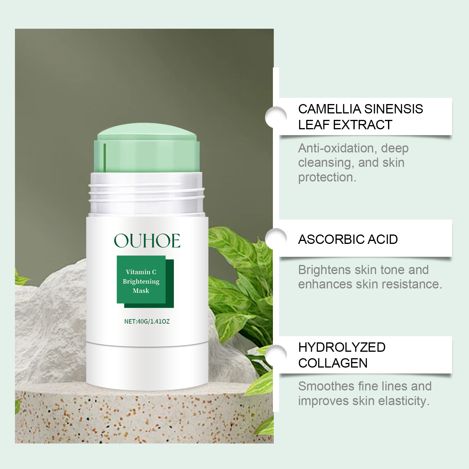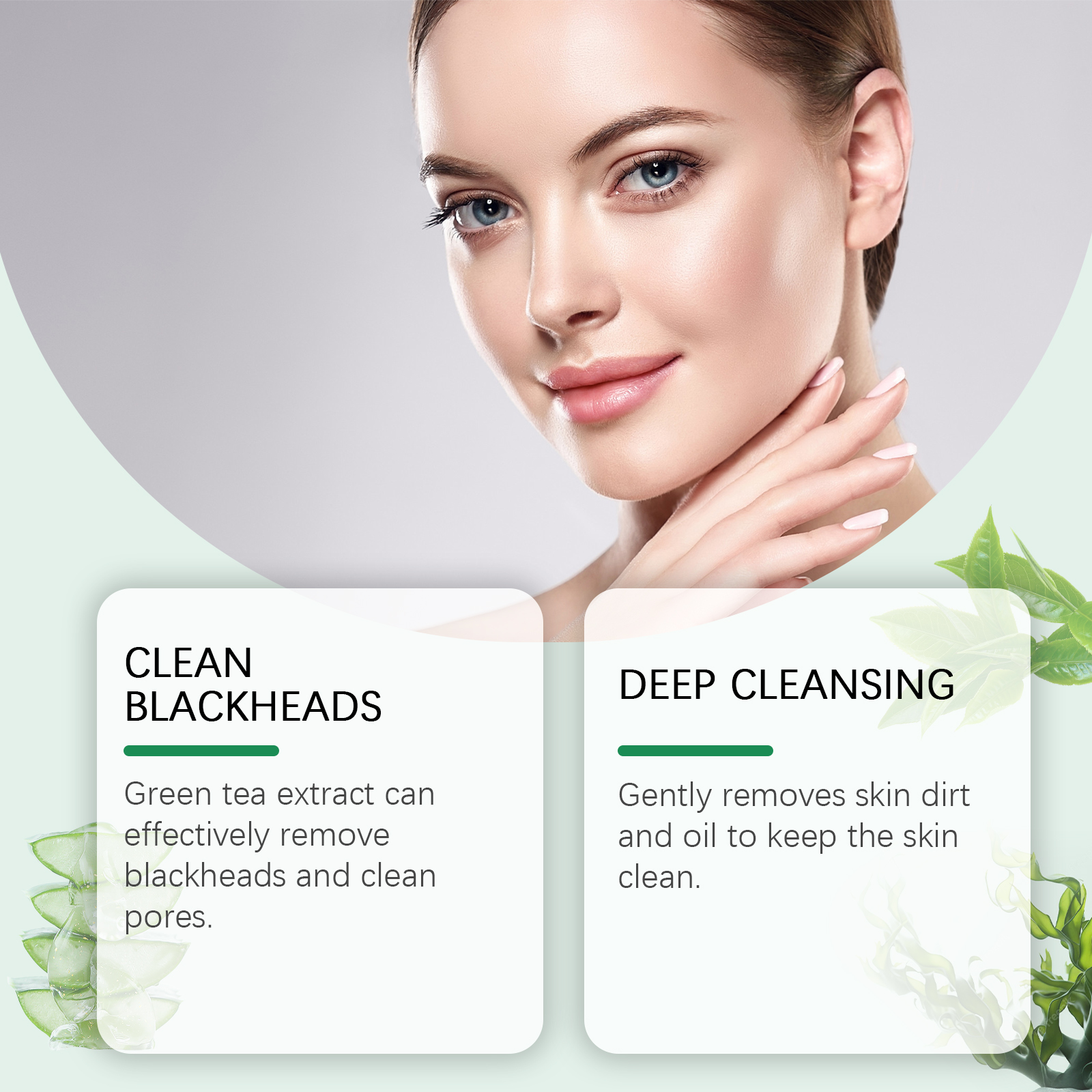 Our Green Tea Cleansing solid mask contains green tea extract, vitamin C, aloe vera leaf extract of Curacao. It can effectively remove blackheads and clean pores. Gently remove skin dirt and keep skin clean. Its application is simple: 1. Rotate the mask and apply it to the face. 2. Apply evenly on face for 10-15 minutes. 3. Dry after. Rinse with water. Aloe Vera and hydrolyzed collagen replenish skin moisture and nourish skin.