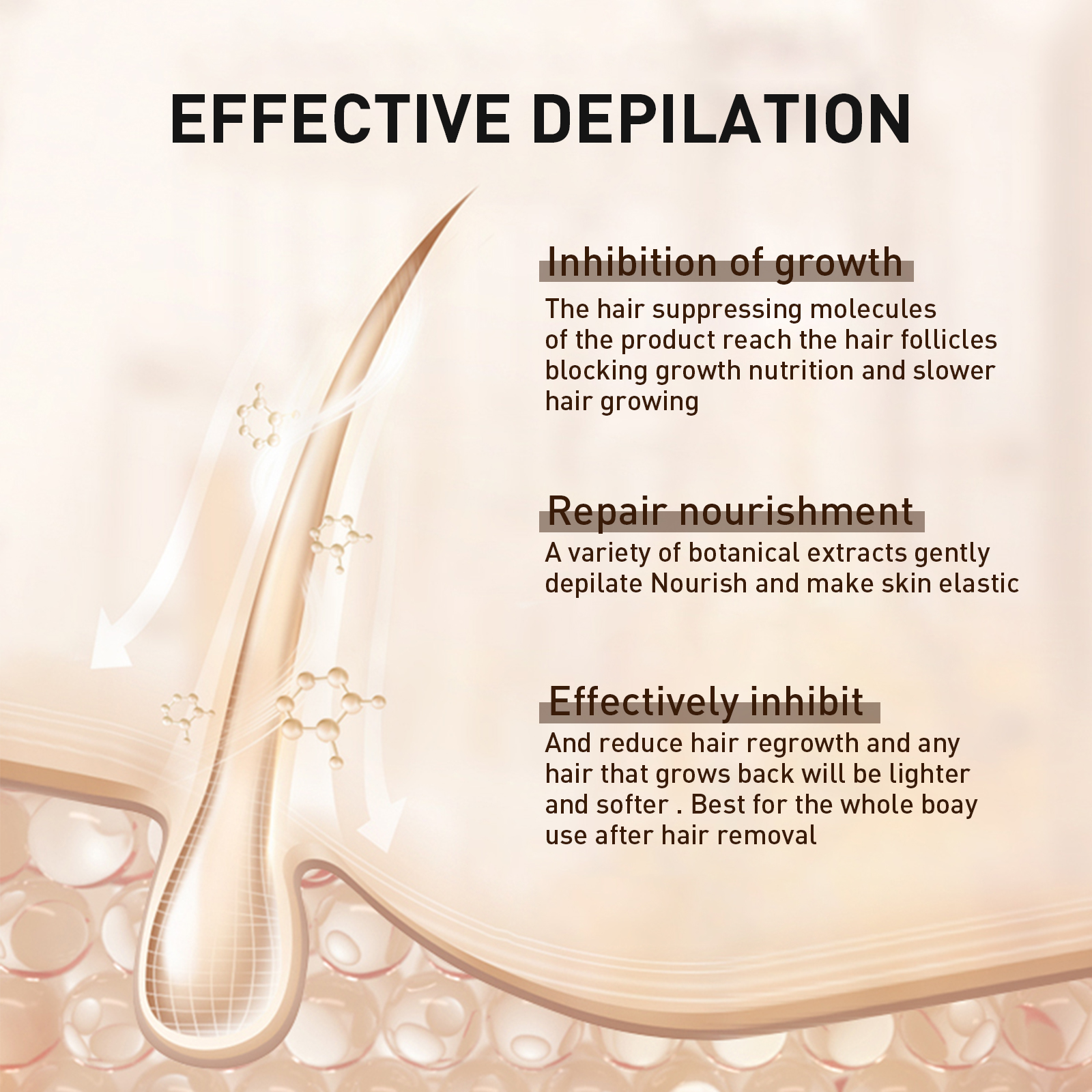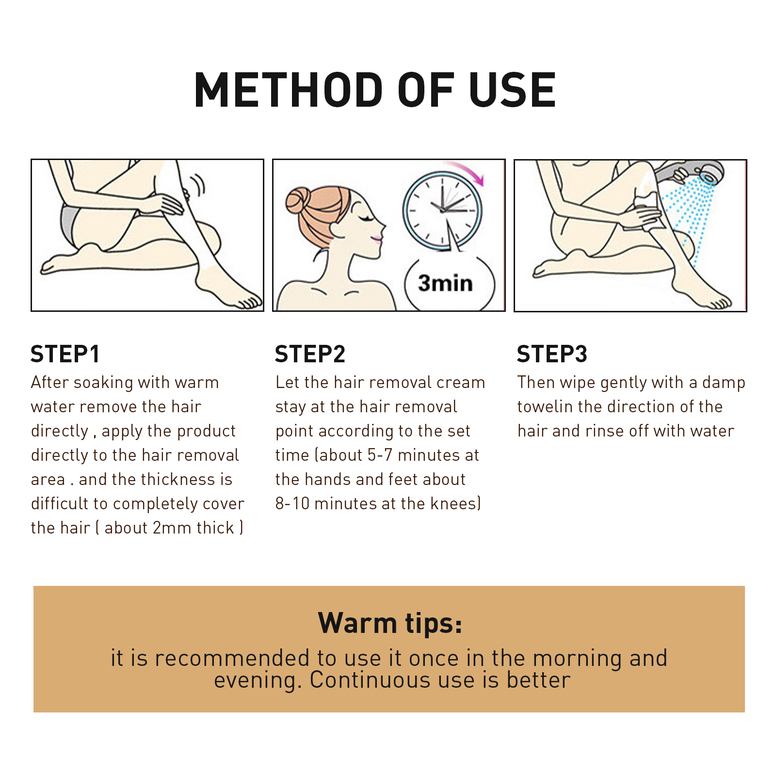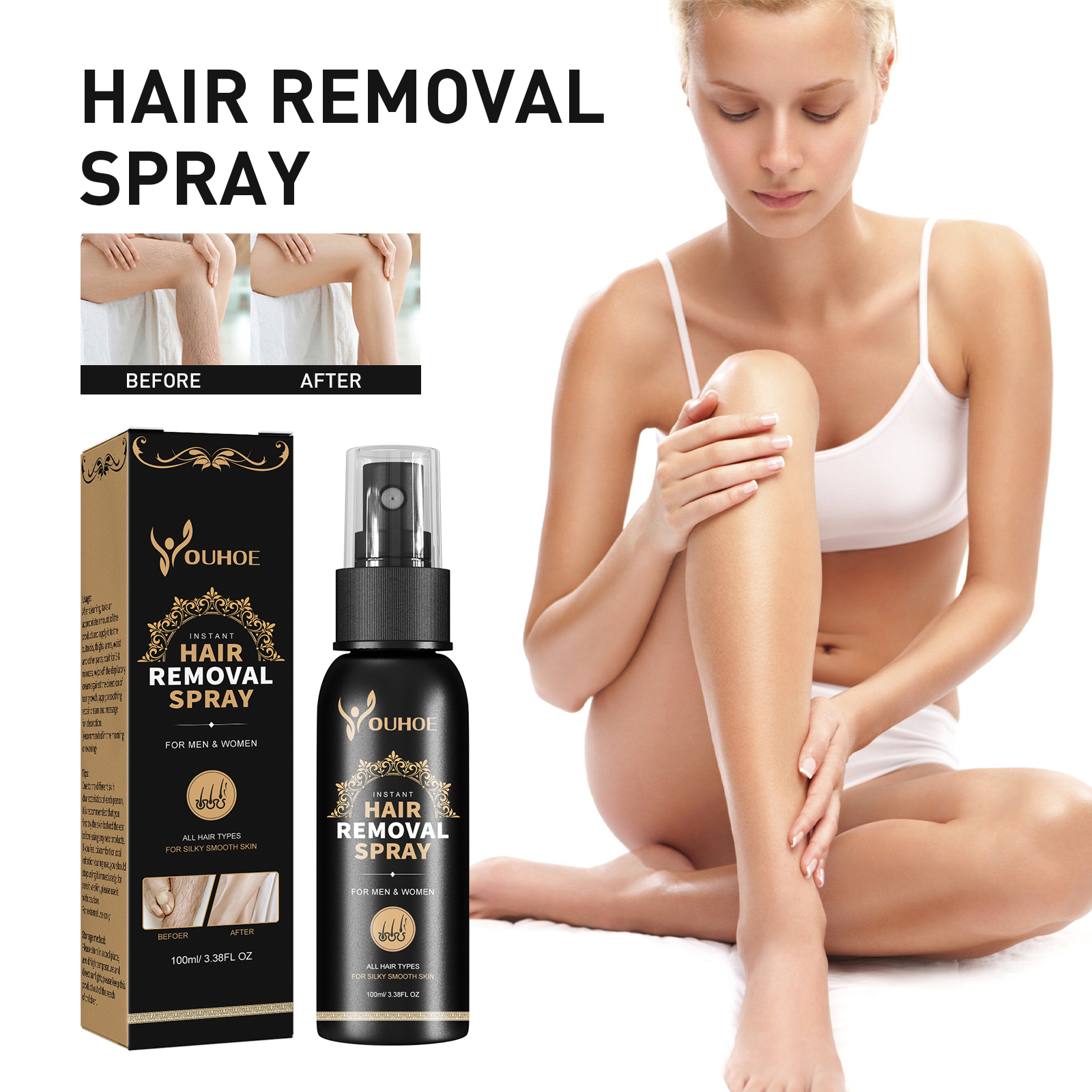 Our hair removal spray contains licorice extract, tea extract and chrysanthemum extract. It can block hair follicle growth nutrients and slow hair growth, repair nutrients and a variety of plant extracts, gentle hair removal nourishes, makes the skin elastic, and effectively inhibits and reduces hair regeneration. Its use is very simple: first soak in warm water, apply the product directly to the hair removal area. Let the hair removal cream stay on the hair removal point, about 5-7 minutes on the hands and feet (8-10 minutes on the knees), and then gently wipe with a wet towel along the direction of the hair, and finally rinse with water. After use, it helps to remove hair from the hair root, adjust the hair trend, remove body hair, easy and smooth hair removal, and leave your skin clean and beautiful.