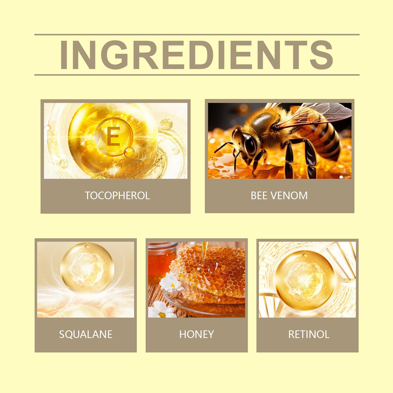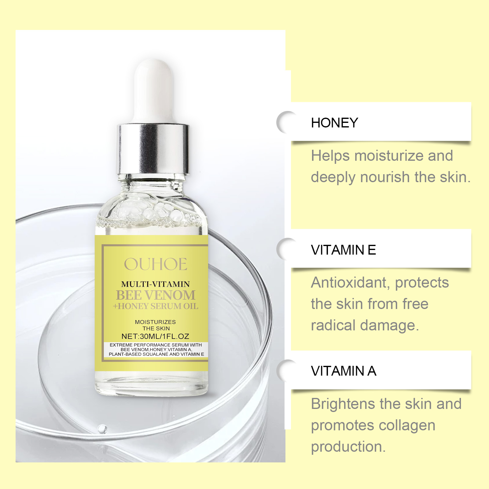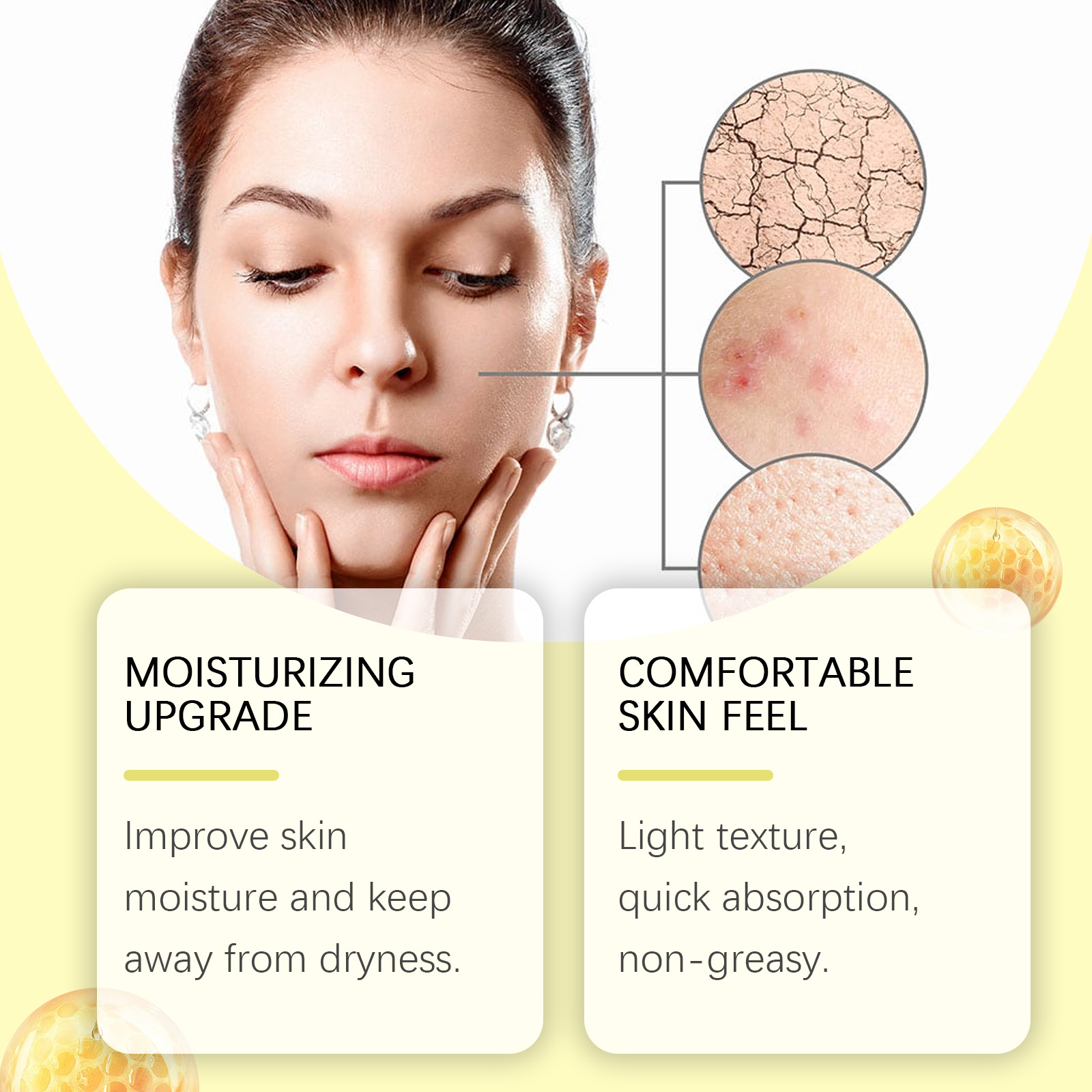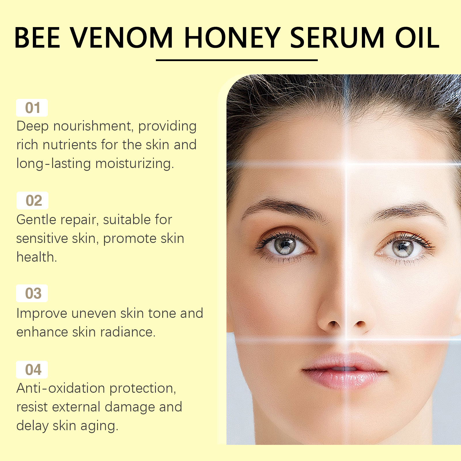 Our honey essence oil contains bee venom and squalane. It increases skin elasticity and reduces fine lines. It can relieve skin discomfort, strengthen skin barrier, restore skin softness and rejuvenate skin. Its use method is very simple: wash the face, keep dry, apply appropriate amount of this product evenly on the face skin, and then gently massage in circles to promote absorption. And can improve skin moisture and keep dry.