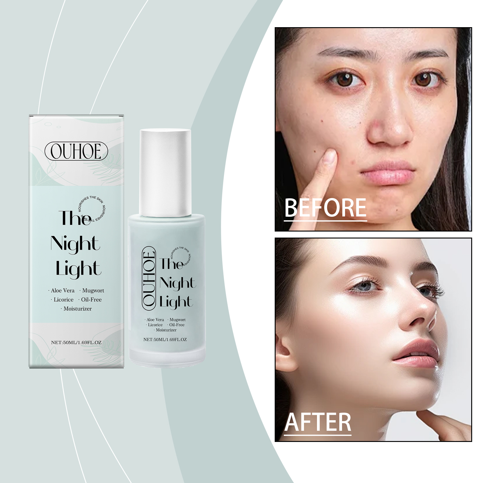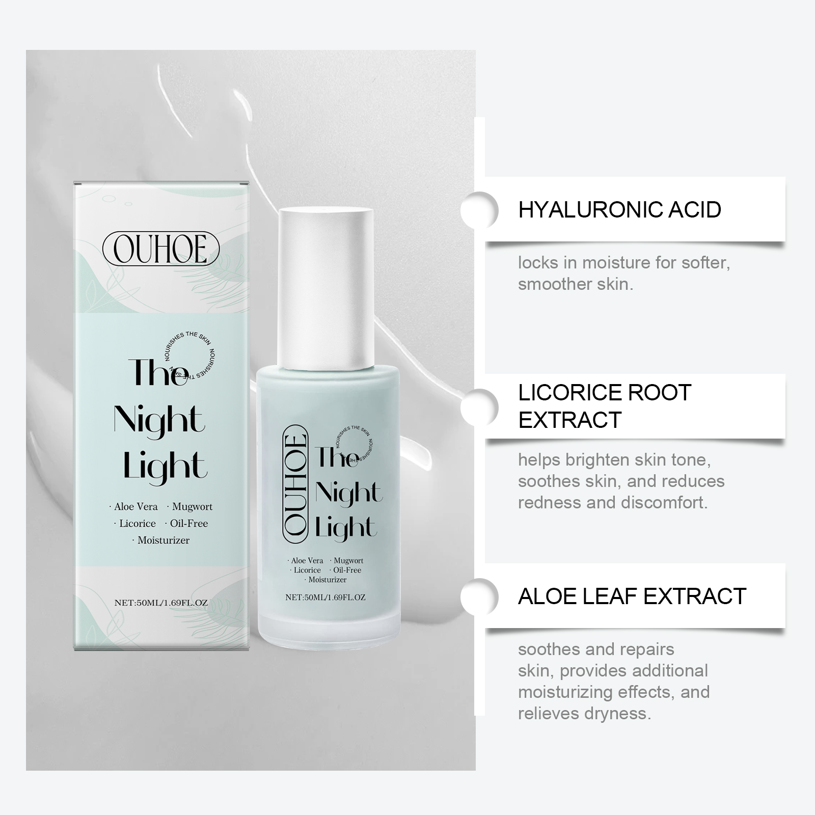 Our hyaluronic acid moisturizing lotion contains aloe leaf extract and wormwood extract. It can improve the texture of the skin, making the skin smooth as silk in the morning. The application method is very simple: wash your face before going to bed, take an appropriate amount of the cream and apply it evenly on your face, gently massage in circular motions to promote absorption. Moreover, it has strong water absorption, a light texture, quick penetration, and is not greasy.