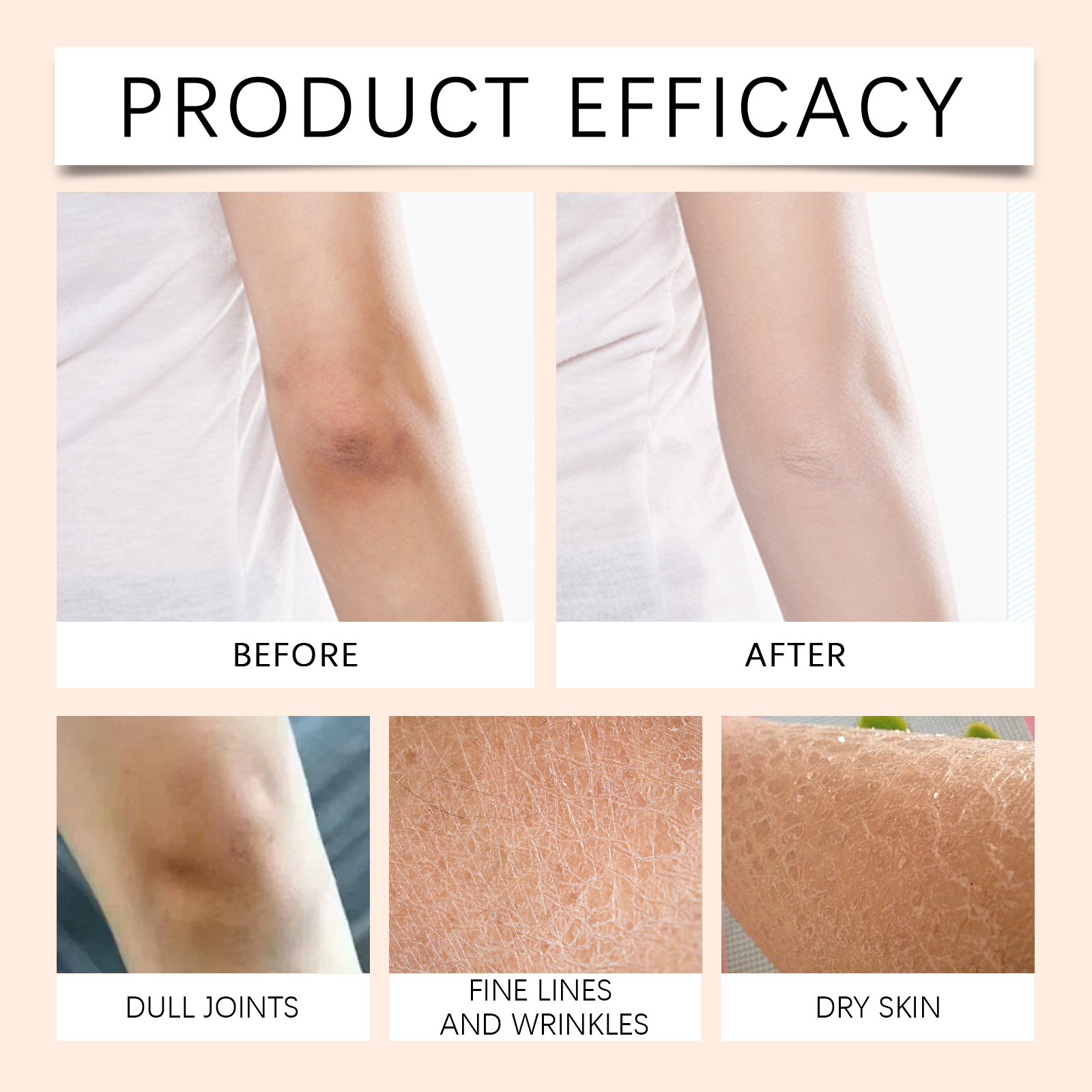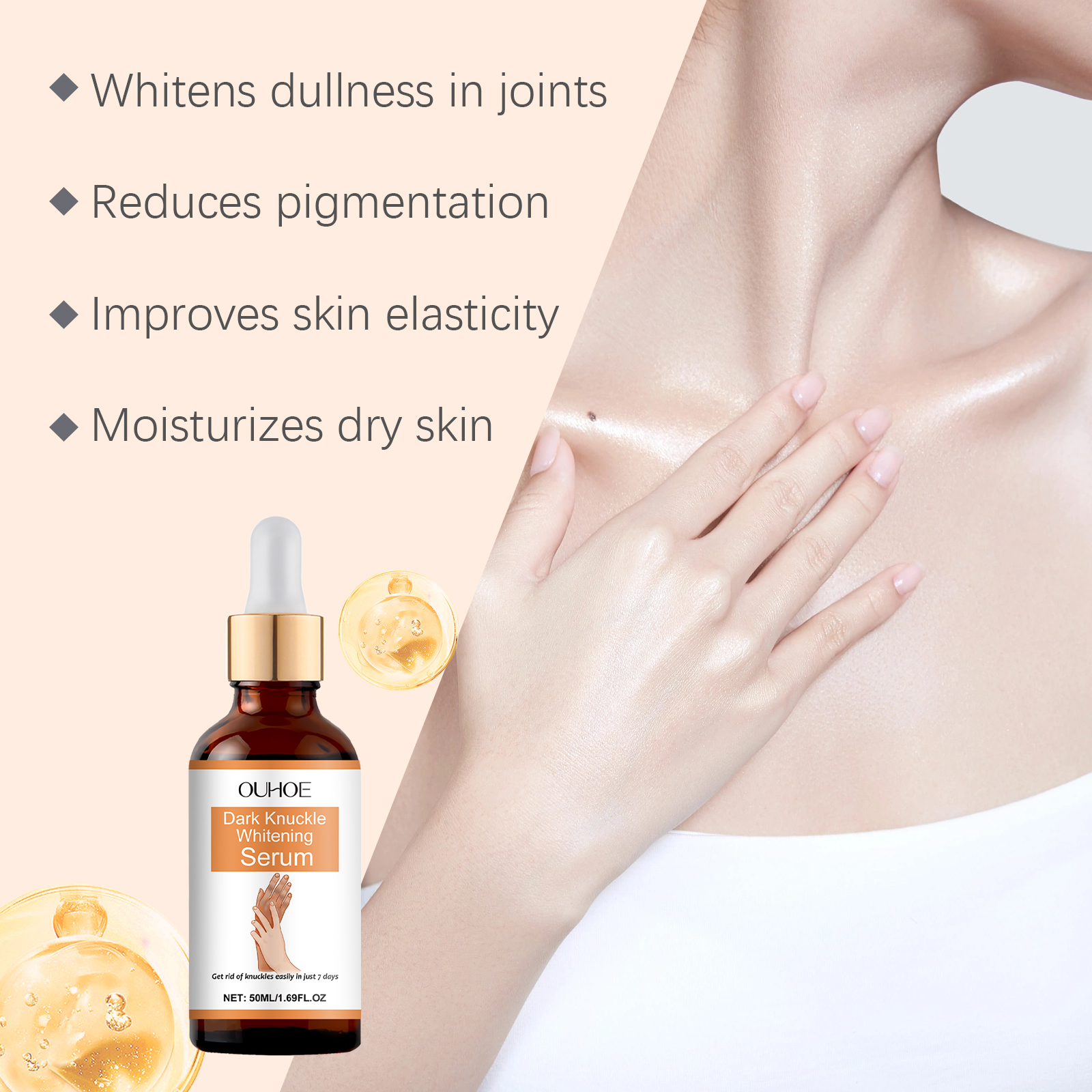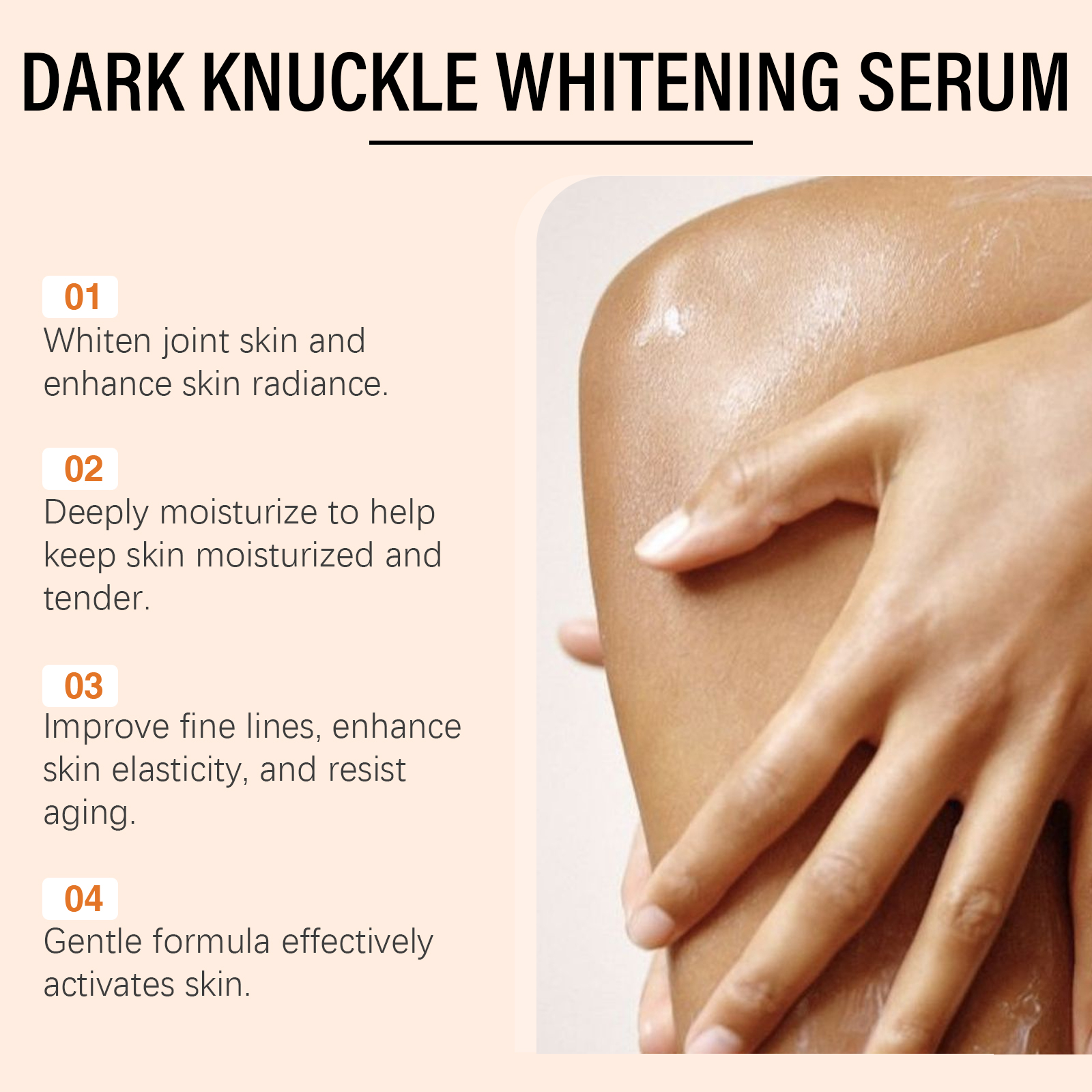 Our joint skin care serum contains glycerin, vitamin E (tocopherol). It can activate skin cell regeneration, enhance the health and vitality of the skin in the joint area, improve turbidity, and restore skin luster. Its application method is very simple: clean the skin, keep the skin dry, apply appropriate amount of this product on the skin of the joints such as hands, knees, ankles, gently massage until absorbed. And can promote skin regeneration, improve skin elasticity helps to reduce joint fine lines and wrinkles, delay skin aging.