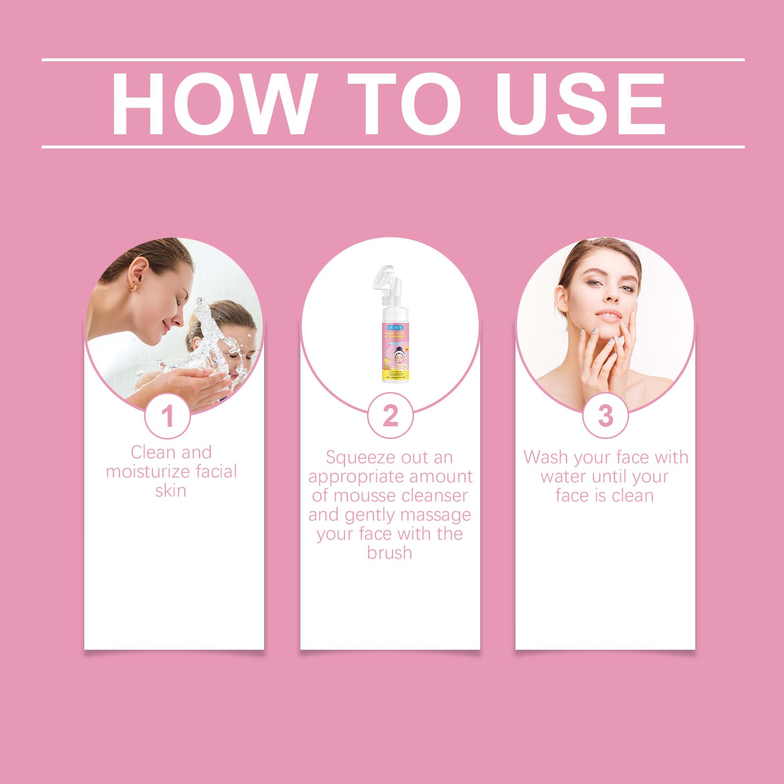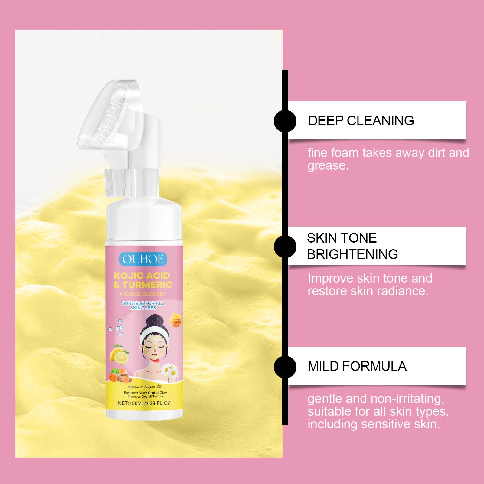 Our kojic acid turmeric Mousse cleanser contains turmeric extract, kojic acid and chamomile extract. It can moisturize the skin for a long time and keep the moisture balance; Moisturize and retain water, keeping skin hydrated after cleansing. Its application method is simple: 1. Clean and moisturize the facial skin; 2. Squeeze out proper amount of mousse cleanser and gently massage the face with a brush; 3. Wash your face with clean water until it is clean. Repair damaged skin and restore skin health. Speed up the removal of dead skin cells and boost metabolism. Glow and enhance skin confidence.