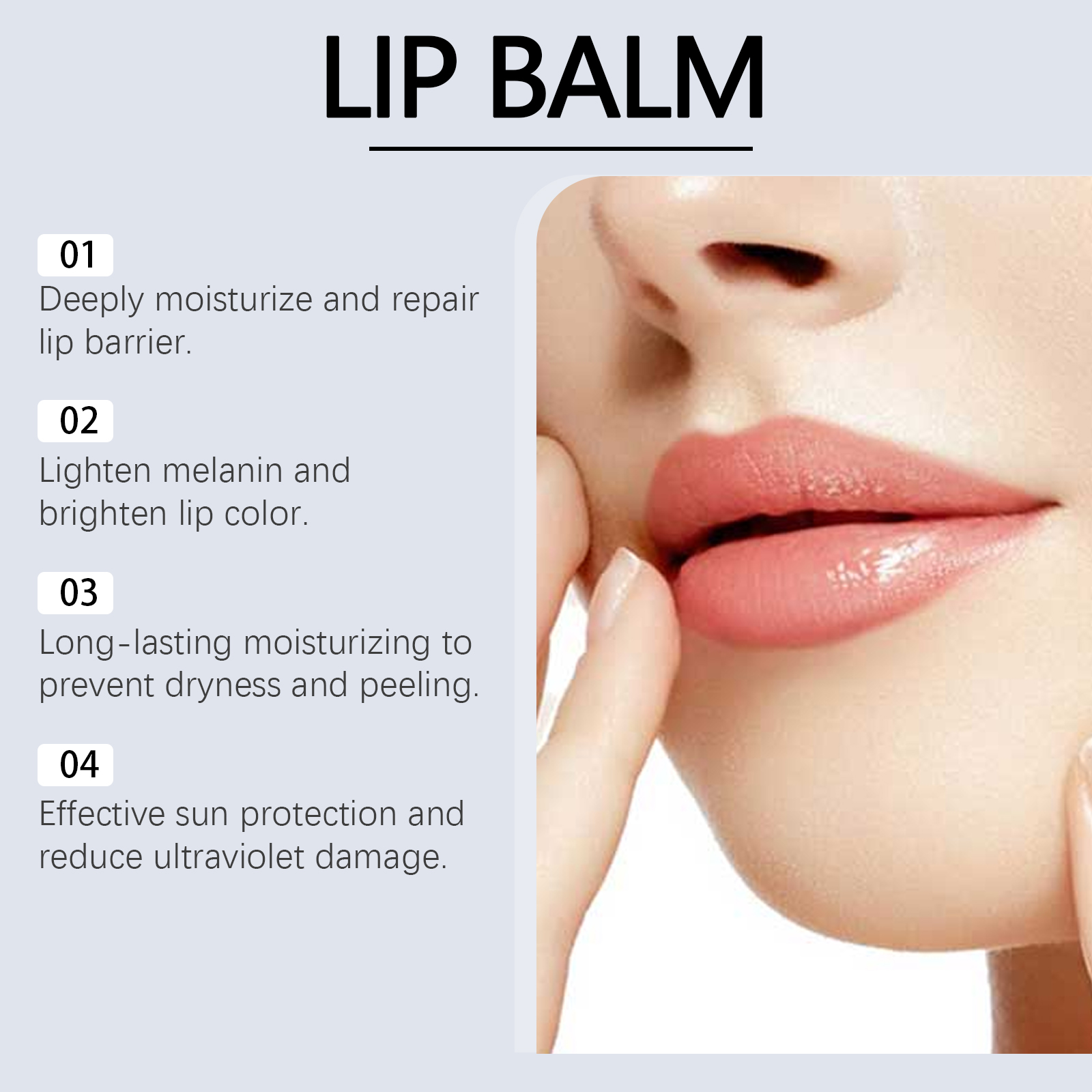 Our lip balms contain beeswax and nicotinamide. It deeply moisturizes and keeps lips soft and smooth. The unique formula locks in moisture and provides long-lasting moisture throughout the day to avoid chapped lips. Its use method is very simple: thoroughly clean the skin of the lips, and first wipe off the appropriate amount of this product evenly apply to the skin area of the lips. It also contains titanium dioxide, which effectively blocks UV rays and protects the delicate skin of lips.