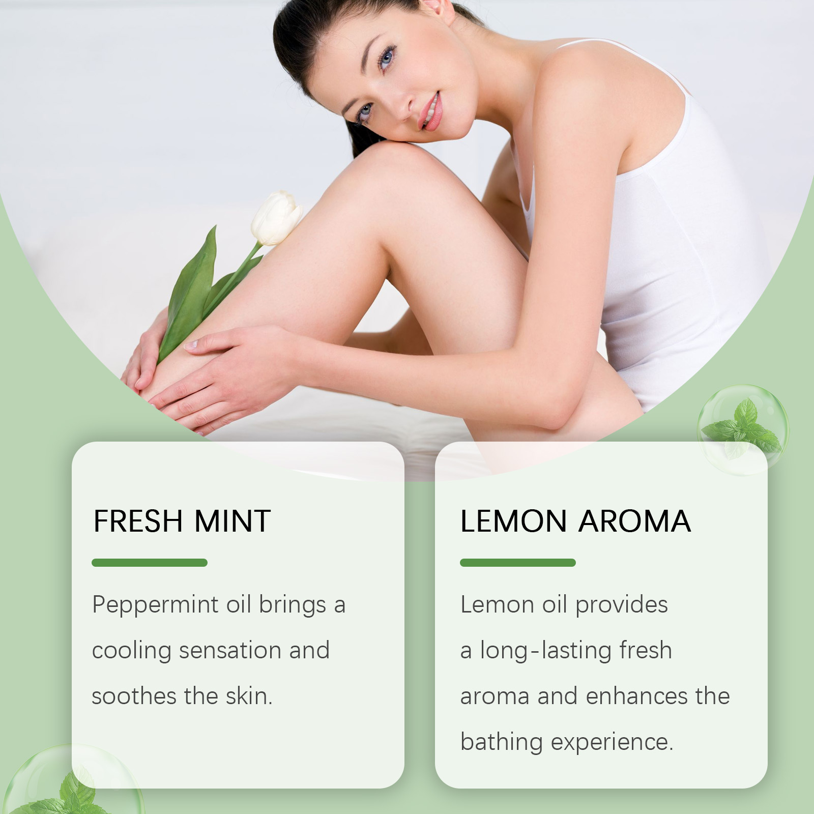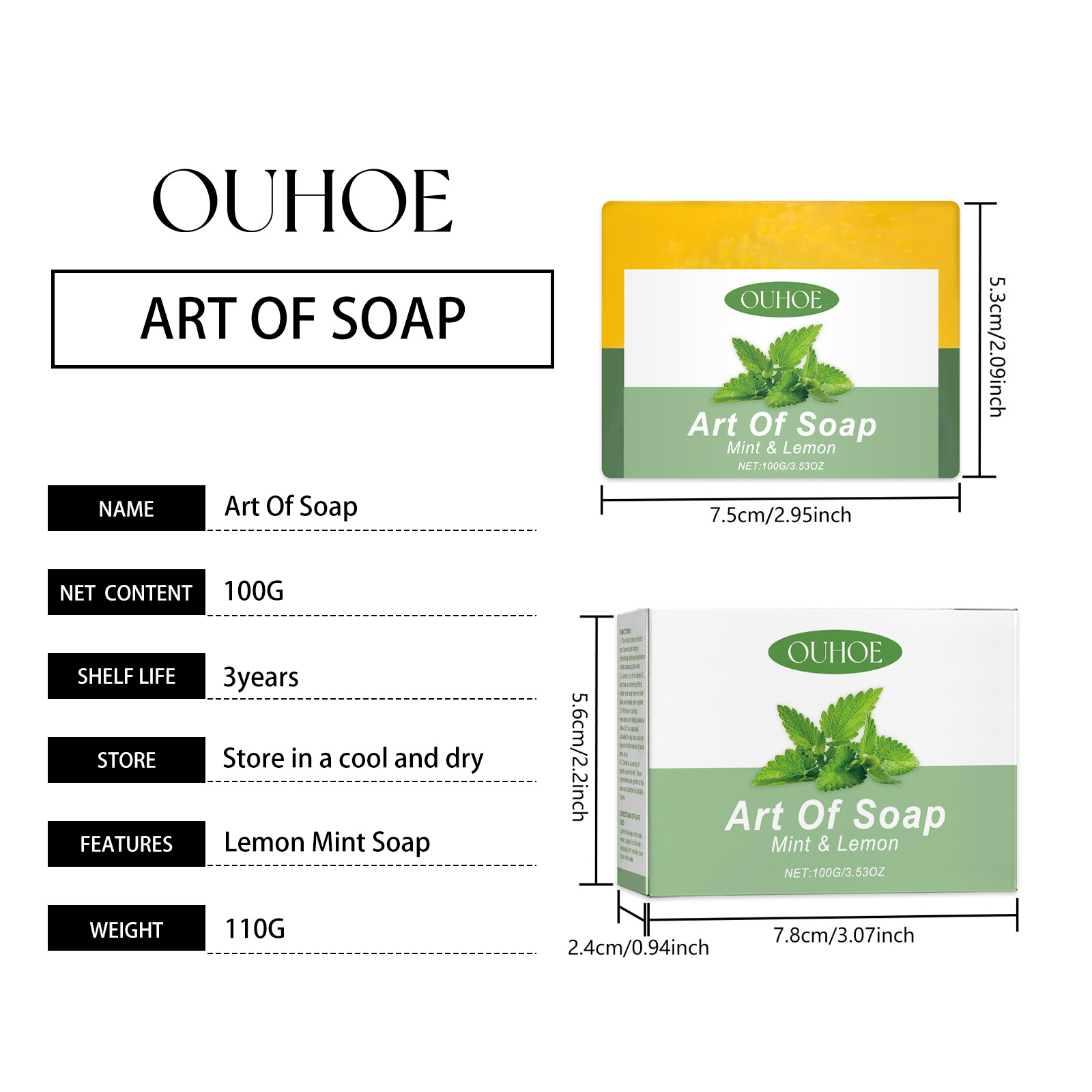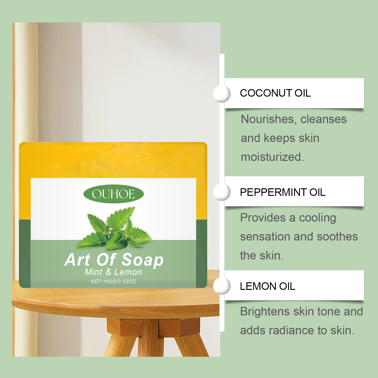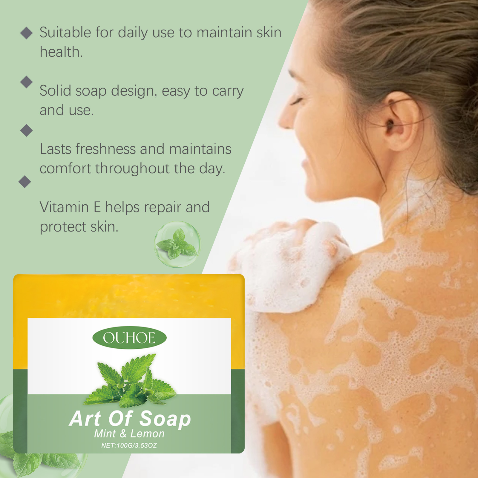 Our mint lemon solid soap contains lemon oil, vitamin E. It cools and soothes the skin. Its use method is very simple: first, lather the soap with clean water, then apply it to the skin and massage for 1 minute. Finally, rinse it off with clean water. And can deeply moisturize, improve dry skin. Lemons are rich in vitamin C, which has whitening properties that can help improve skin tone and make skin brighter.