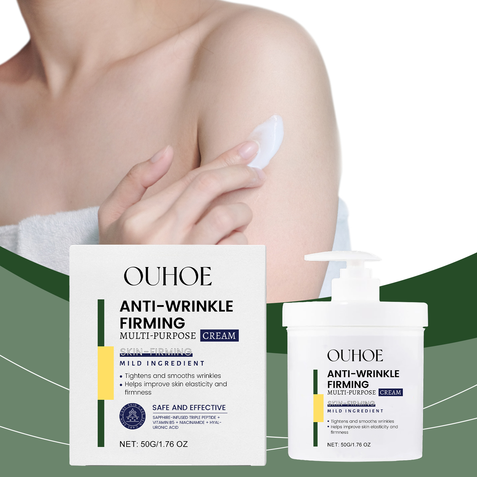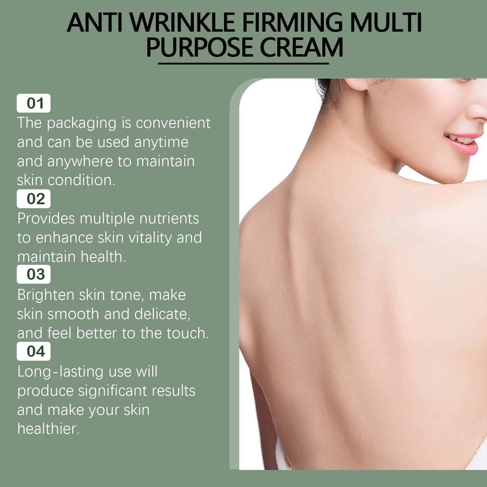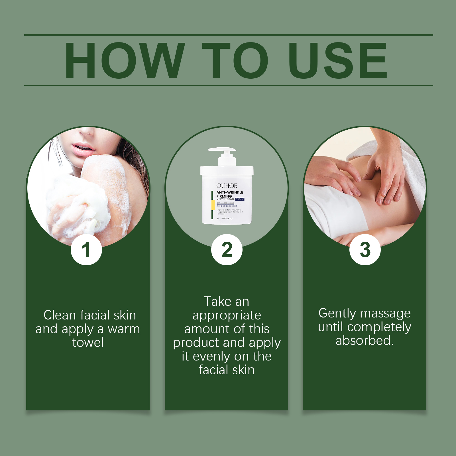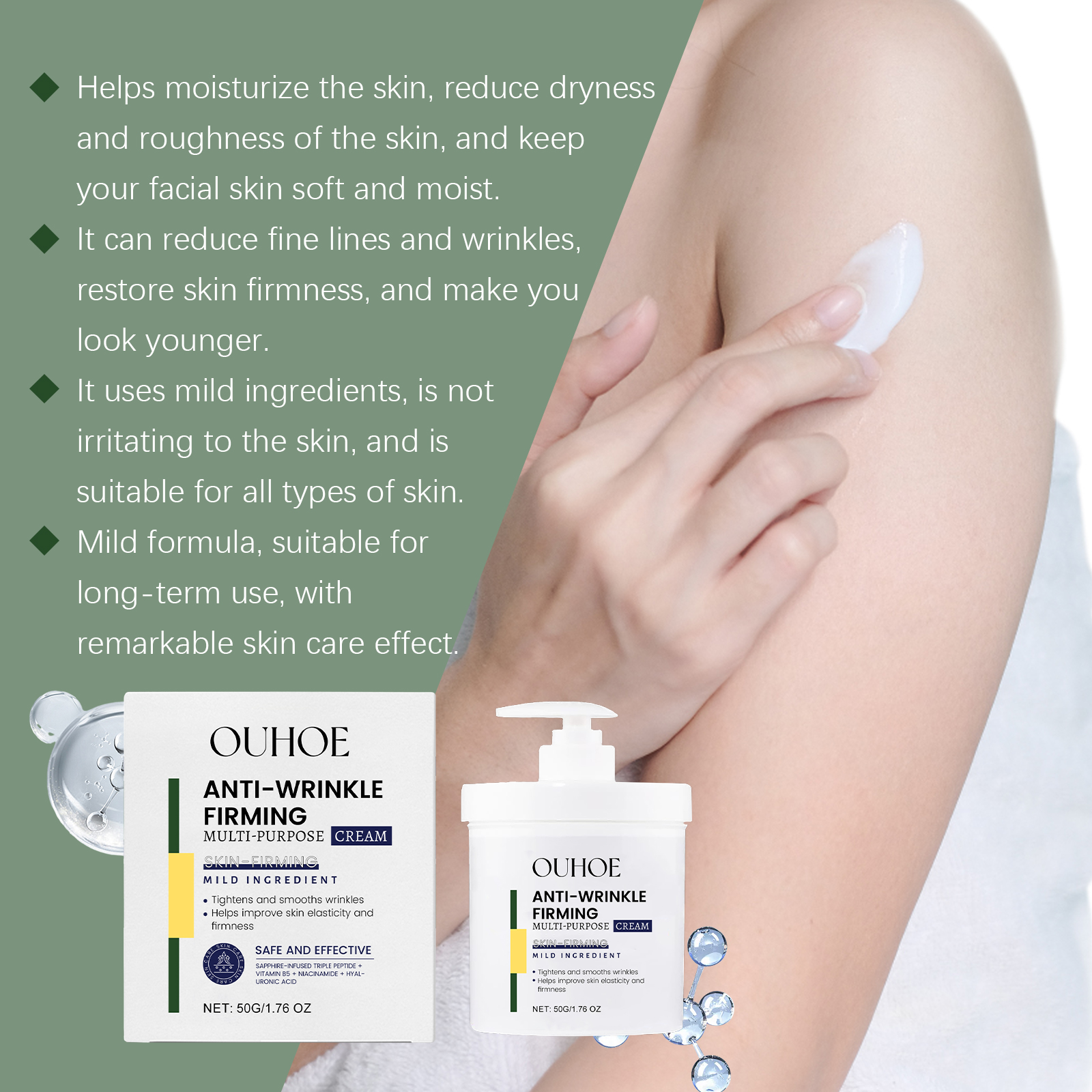 Our deep moisturizing firming anti-wrinkle cream contains hyaluronic acid, collagen. It can resist the damage of the external environment to the skin and keep the youthful luster. Its application method is very simple: clean facial skin, apply a warm towel, evenly apply appropriate amount of this product to facial skin, gently massage until completely absorbed. And can effectively improve skin firmness, reduce fine lines.