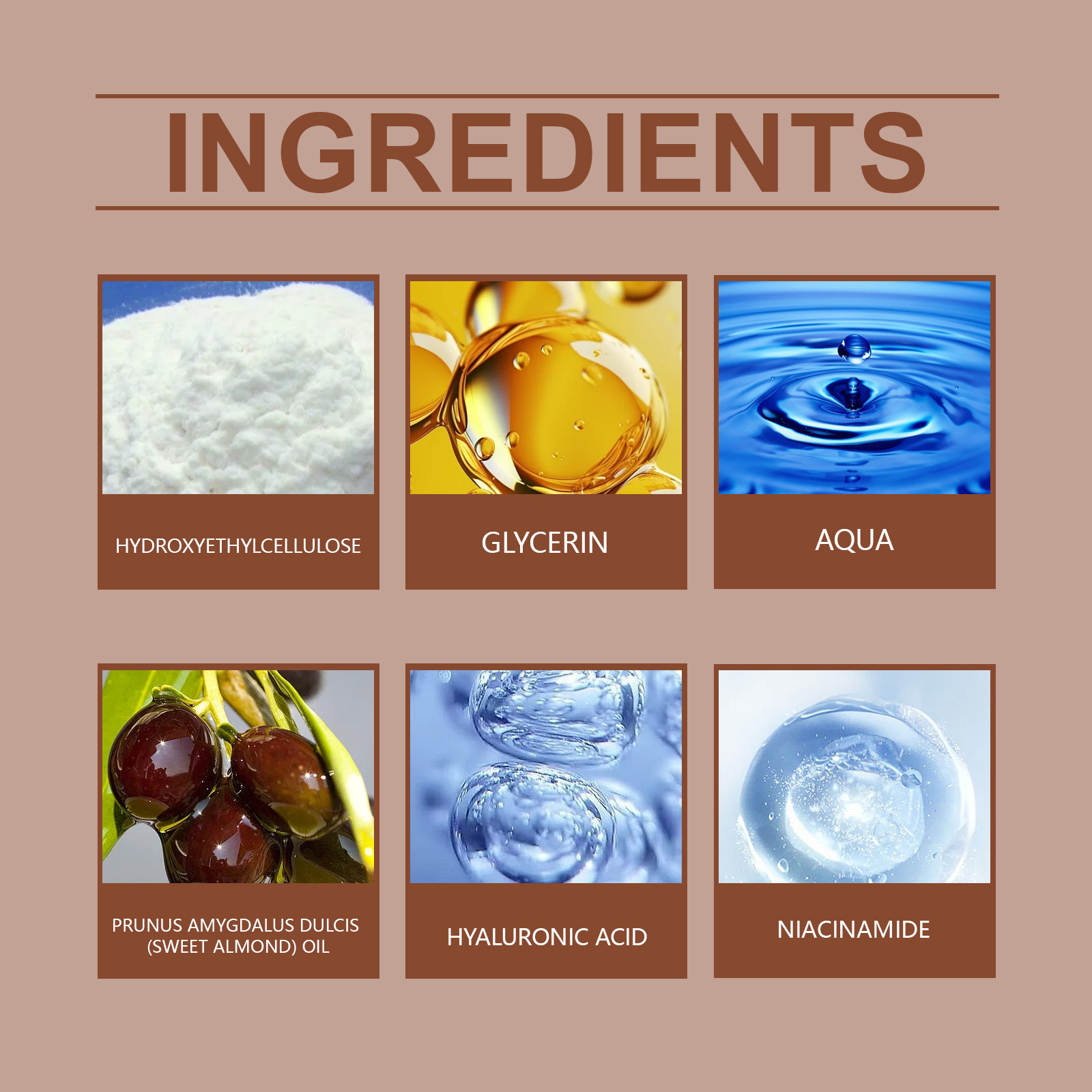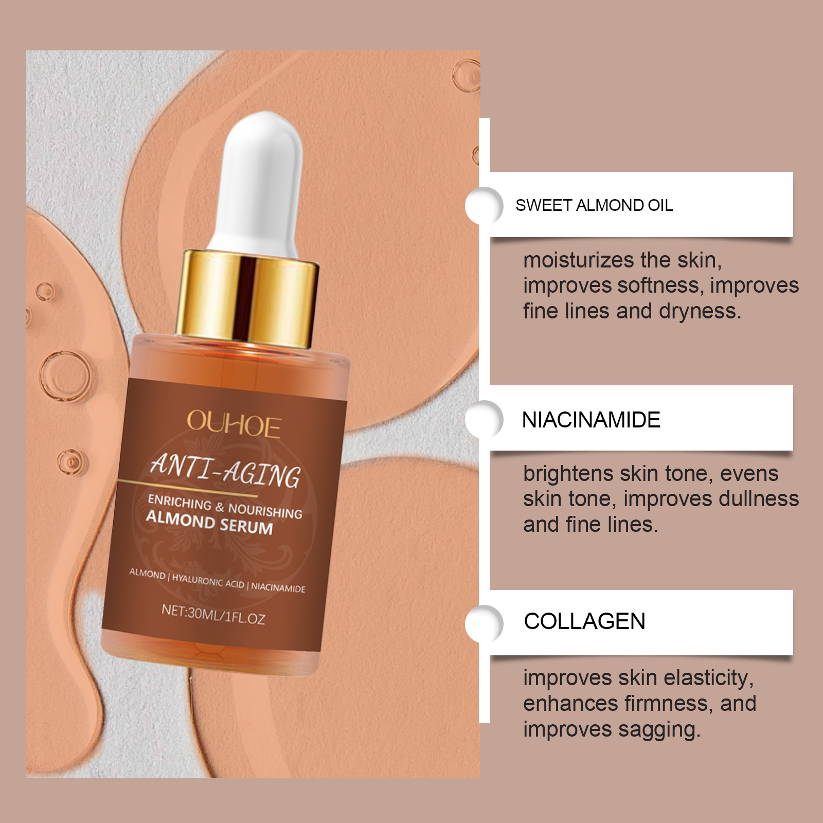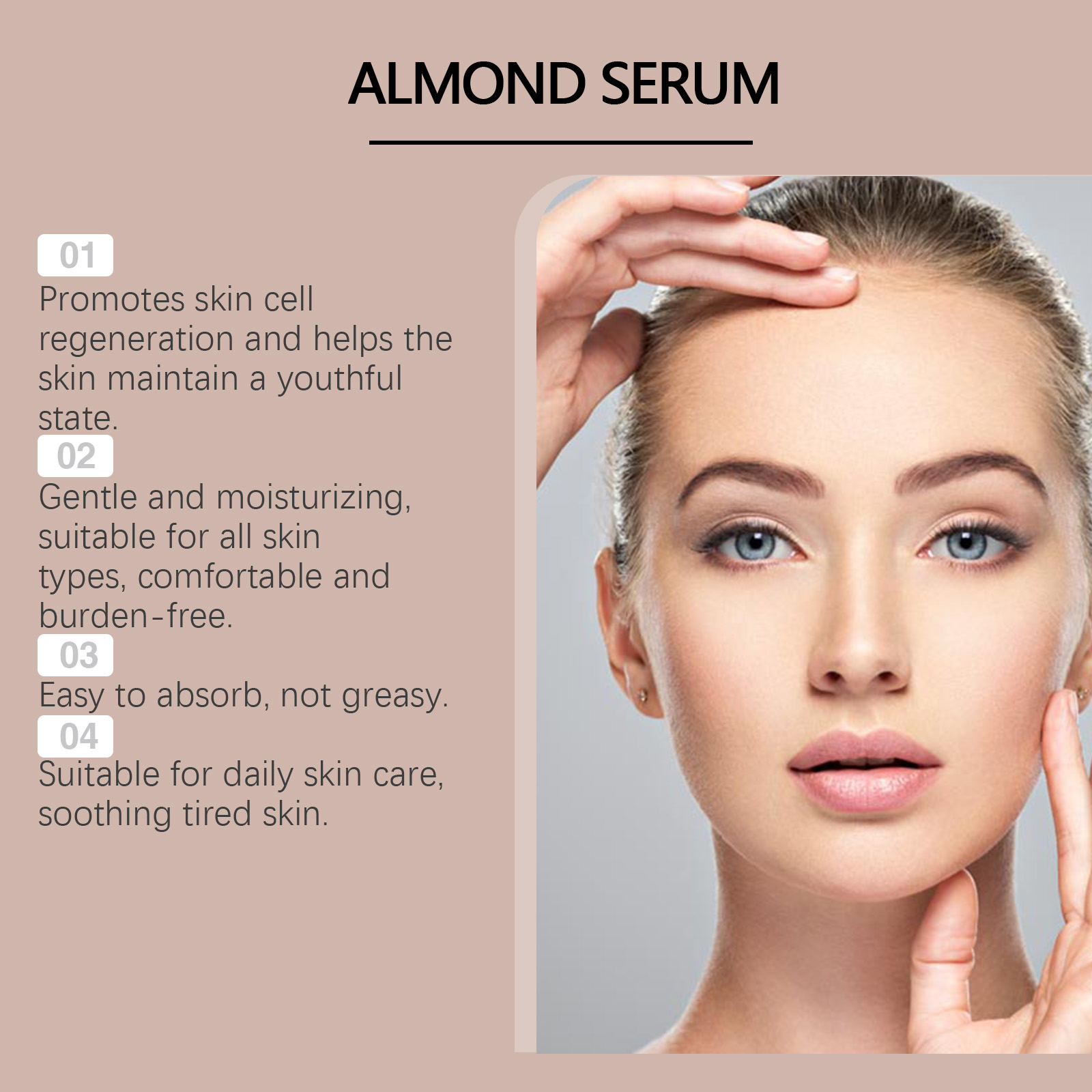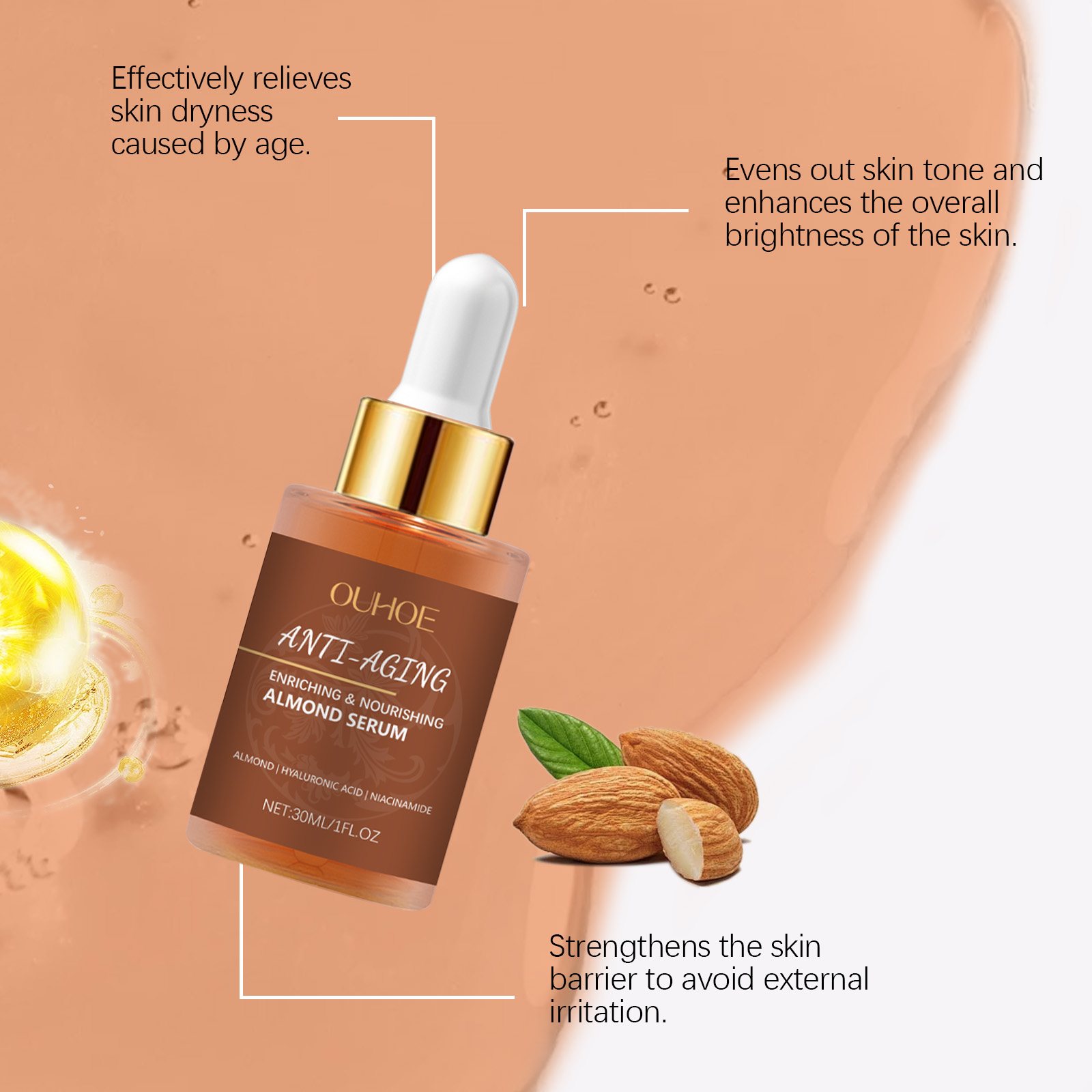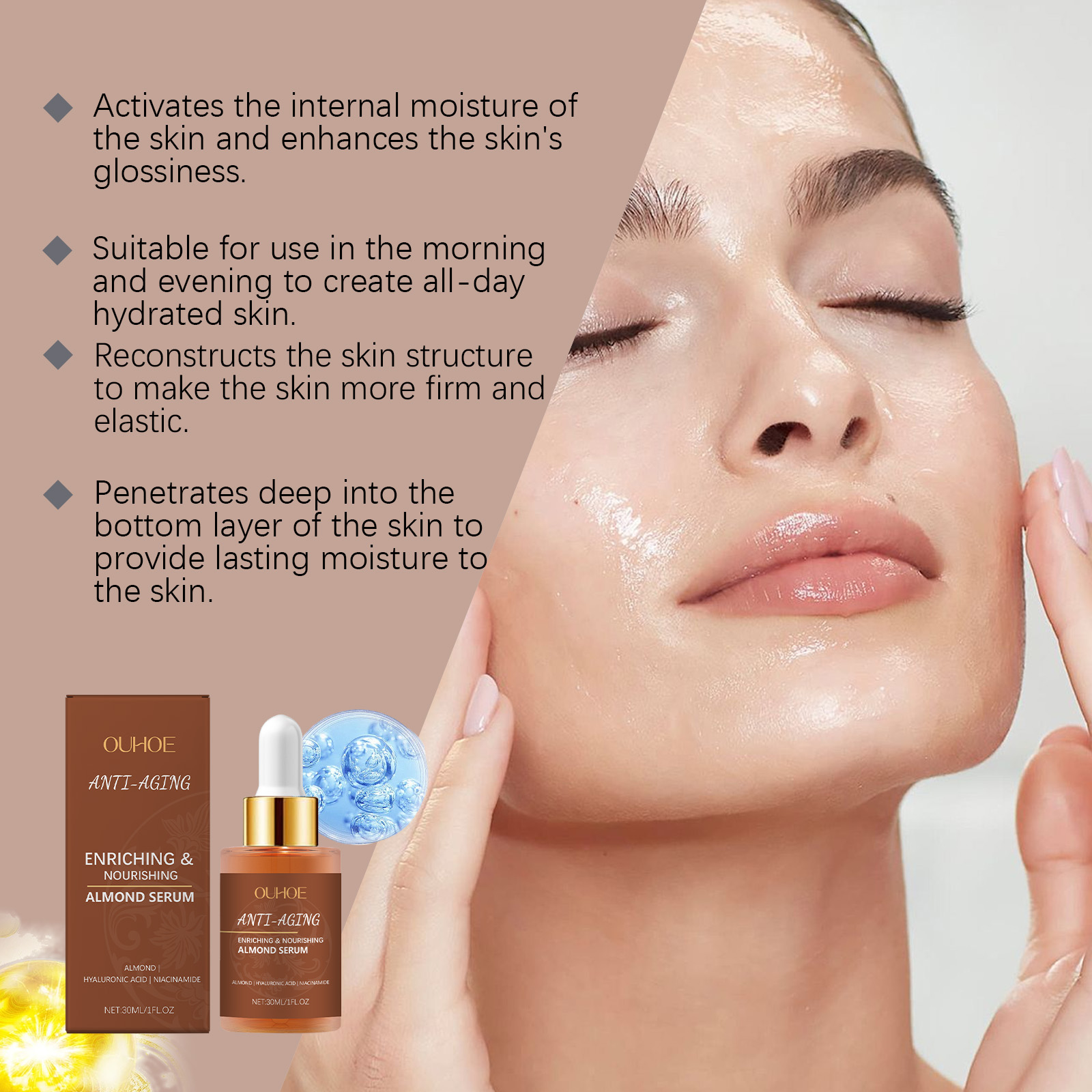Our moisturizing serum contains glycerin and hydroxyethyl cellulose. It can help tighten the skin, restore elasticity and improve relaxation. Deep nourishing, leaves skin soft and smooth. The way to use it is simple: clean the skin. Apply appropriate amount of the product evenly on the face and gently massage to promote absorption. And can improve the roughness, refine the texture, make the skin shining, full of vitality.