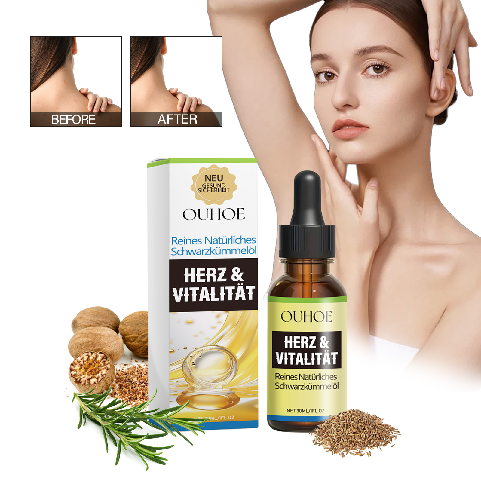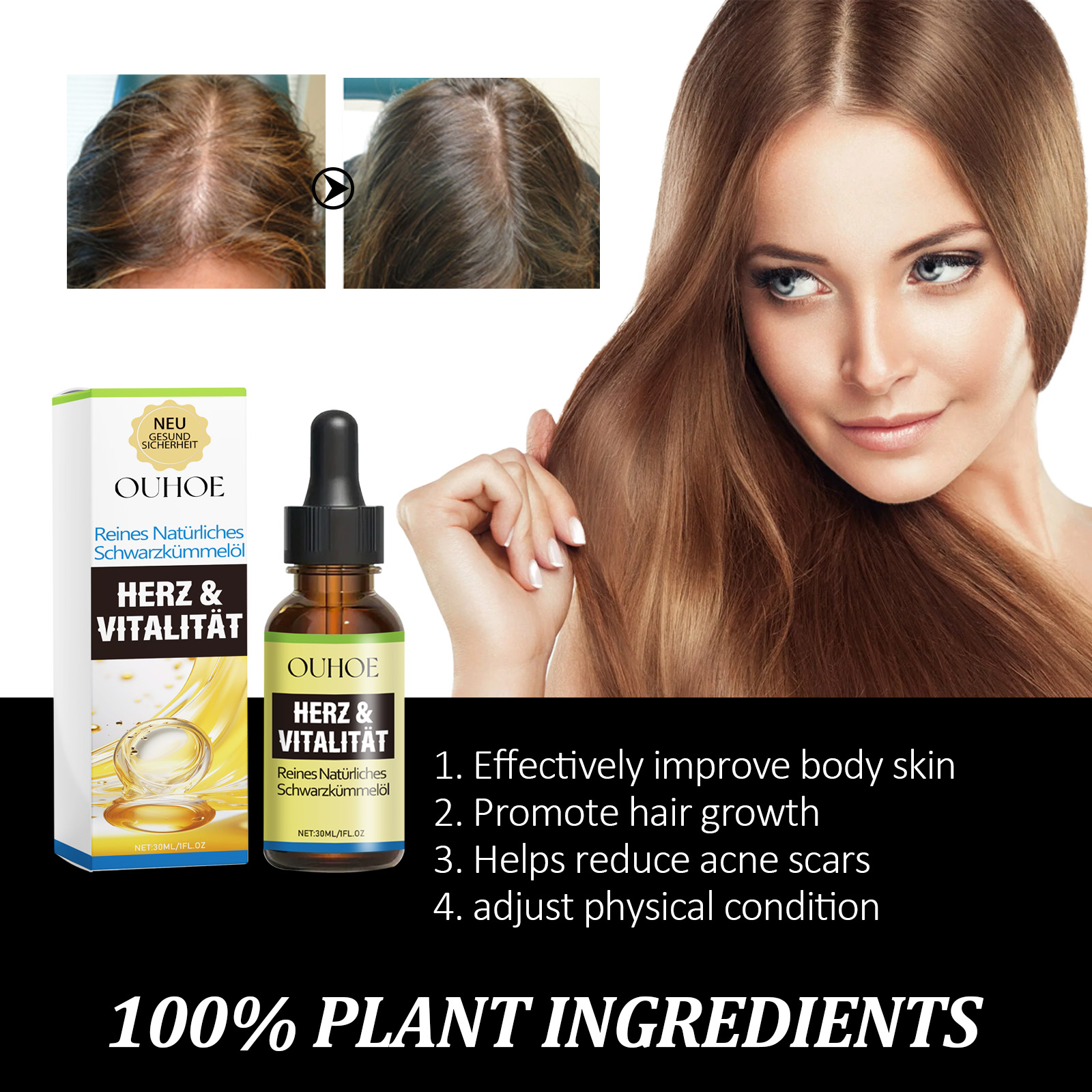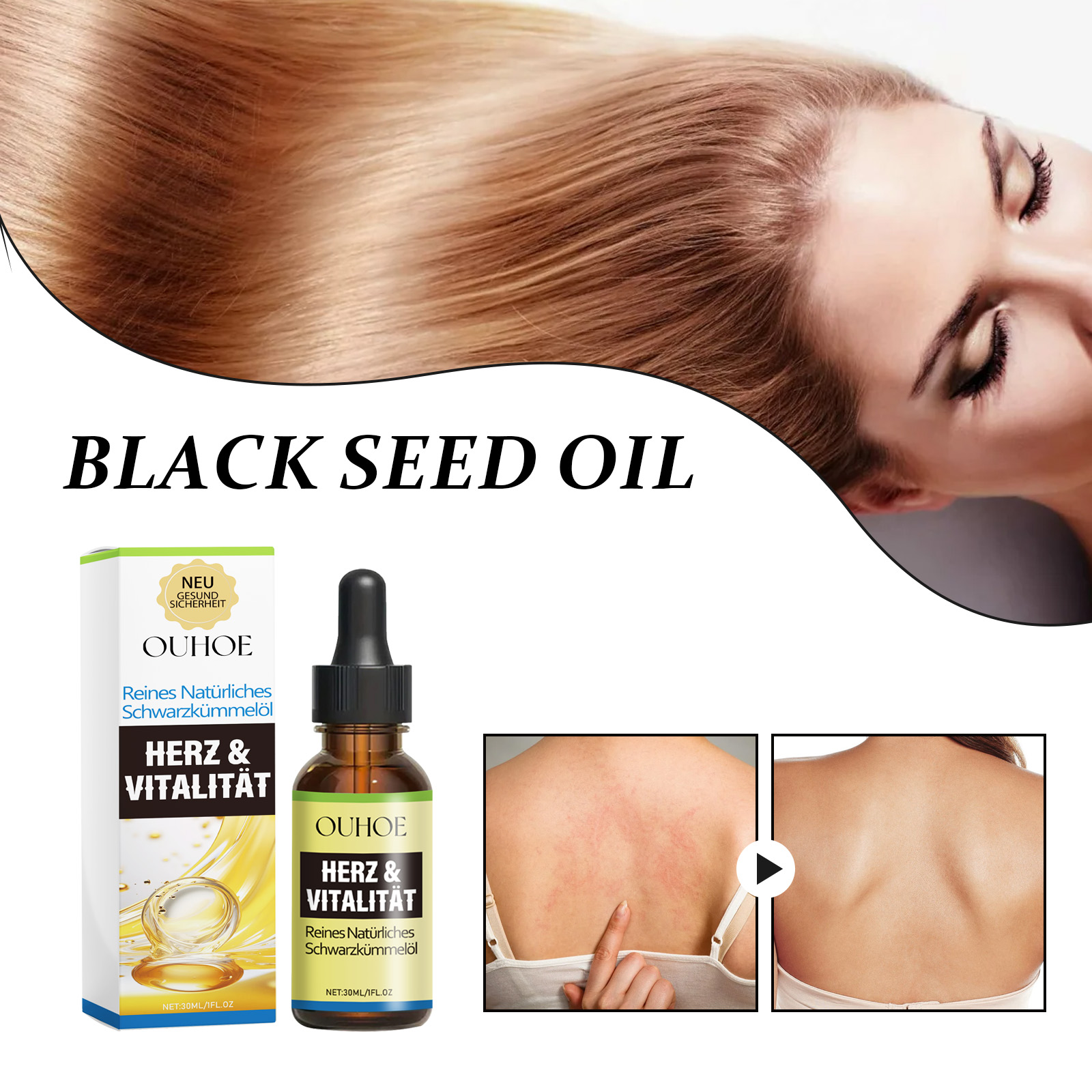 Our natural black seed oil contains castor seed oil, glycerin. It can effectively improve the skin of the body, promote hair growth, help reduce acne scars, and adjust the body condition. Its use method is very simple: after cleaning the skin or hair of the body, apply an appropriate amount of essential oil on the skin or hair of the body, gently massage until absorbed. It also moisturizes the scalp and body.