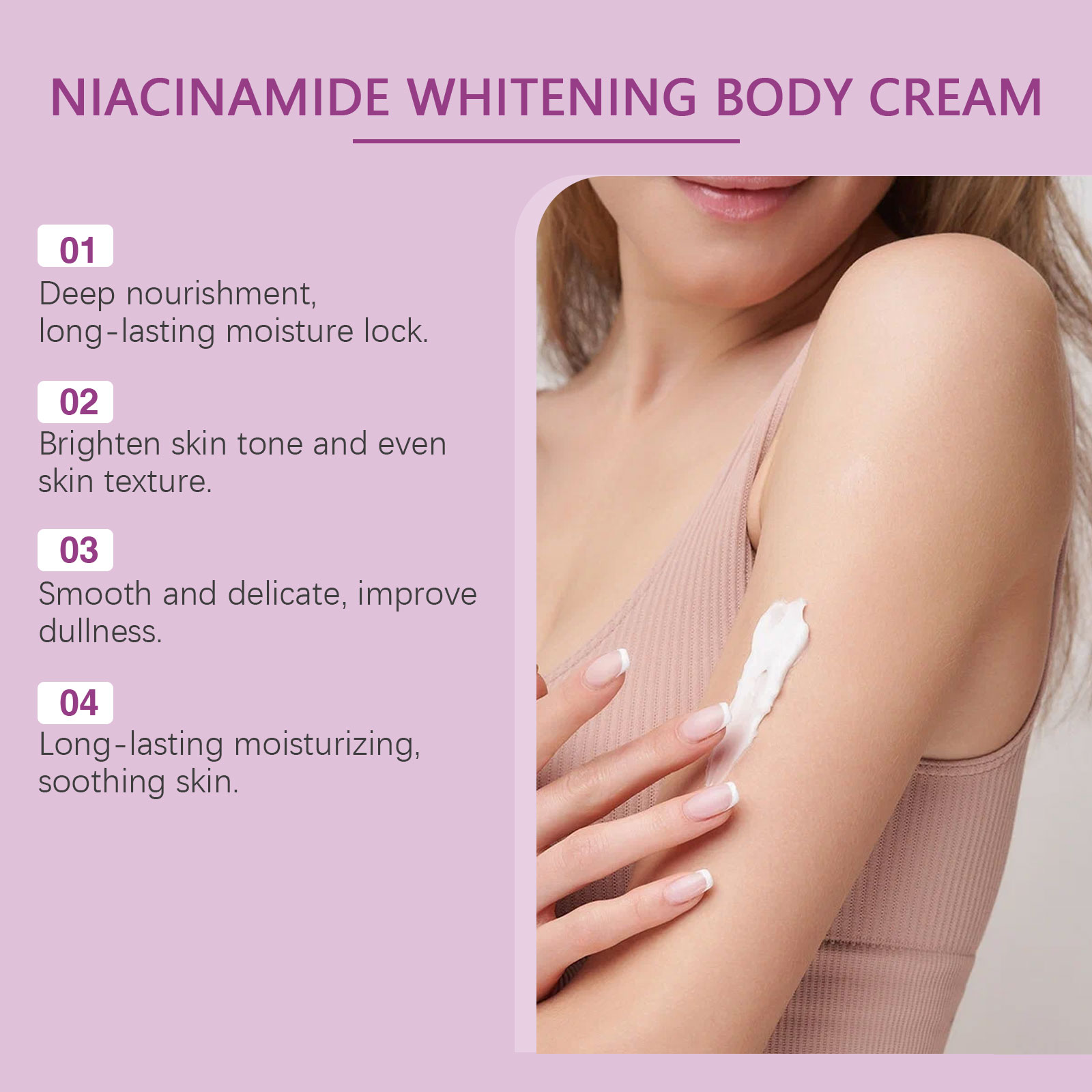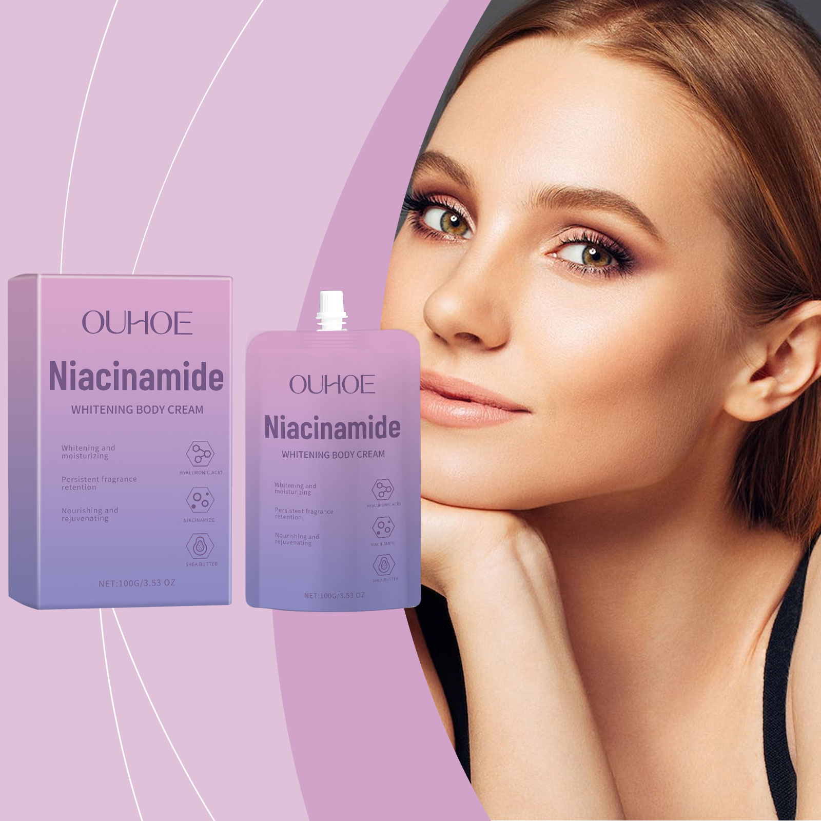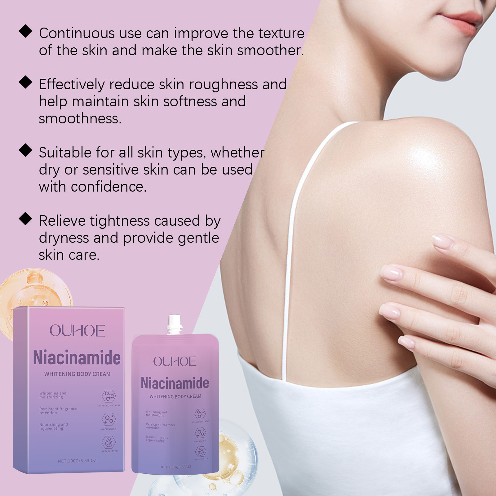 Our niacinamide brightening body cream contains hyaluronic acid, niacinamide and shea butter. It can improve skin elasticity and firmness and improve relaxation. Its use method is very simple: 1. Clean the body skin and keep it dry. 2. Take appropriate amount of this product and apply it to the body evenly on the skin. 3. Gently massage until completely absorbed. Continuous use can significantly improve skin tone, enhance skin glow, and make skin look younger.