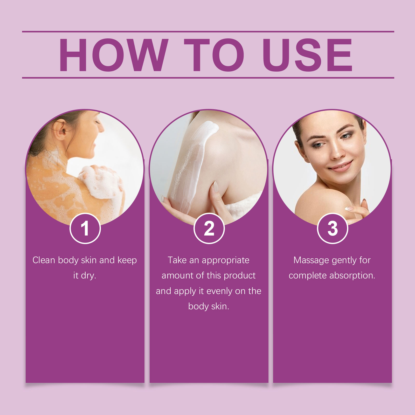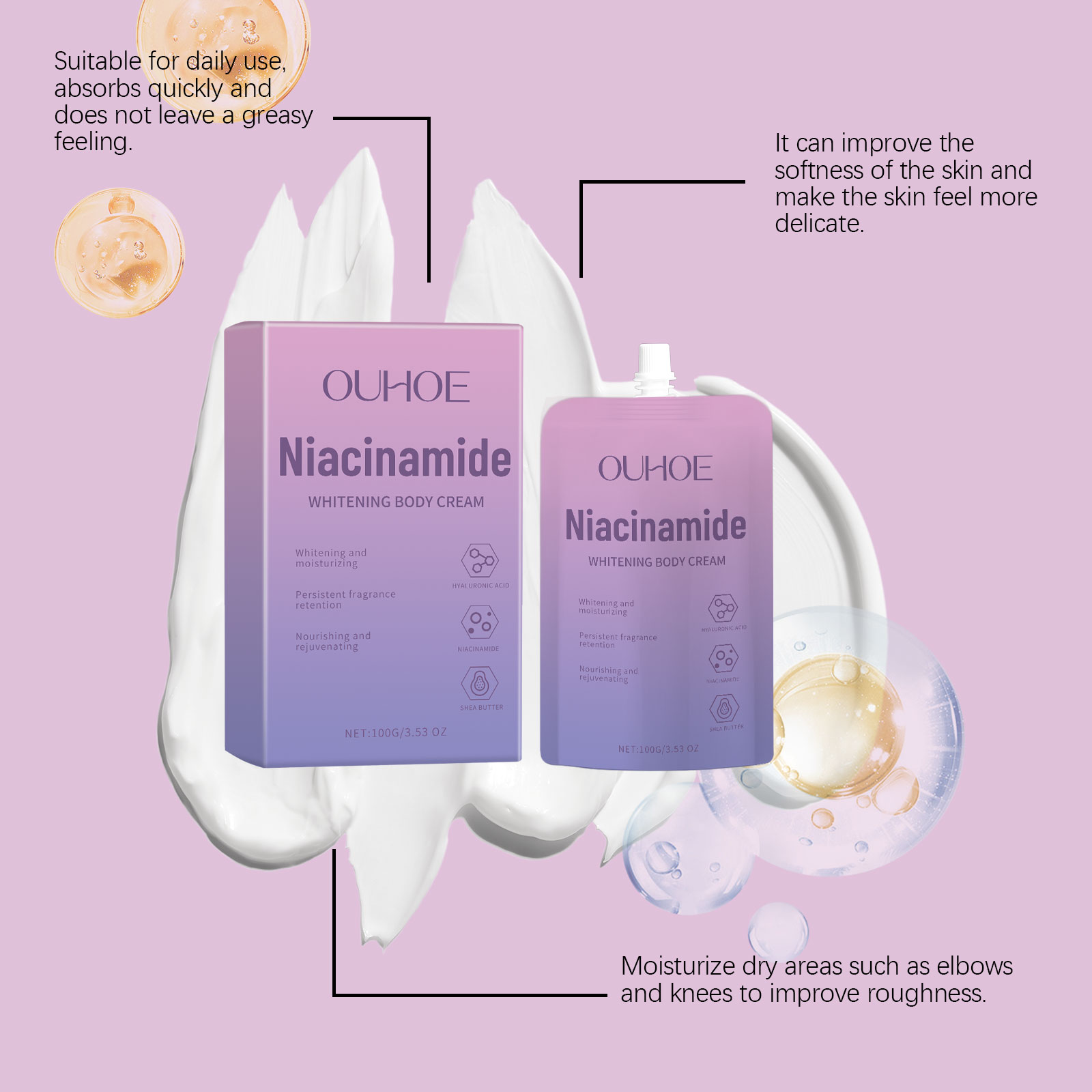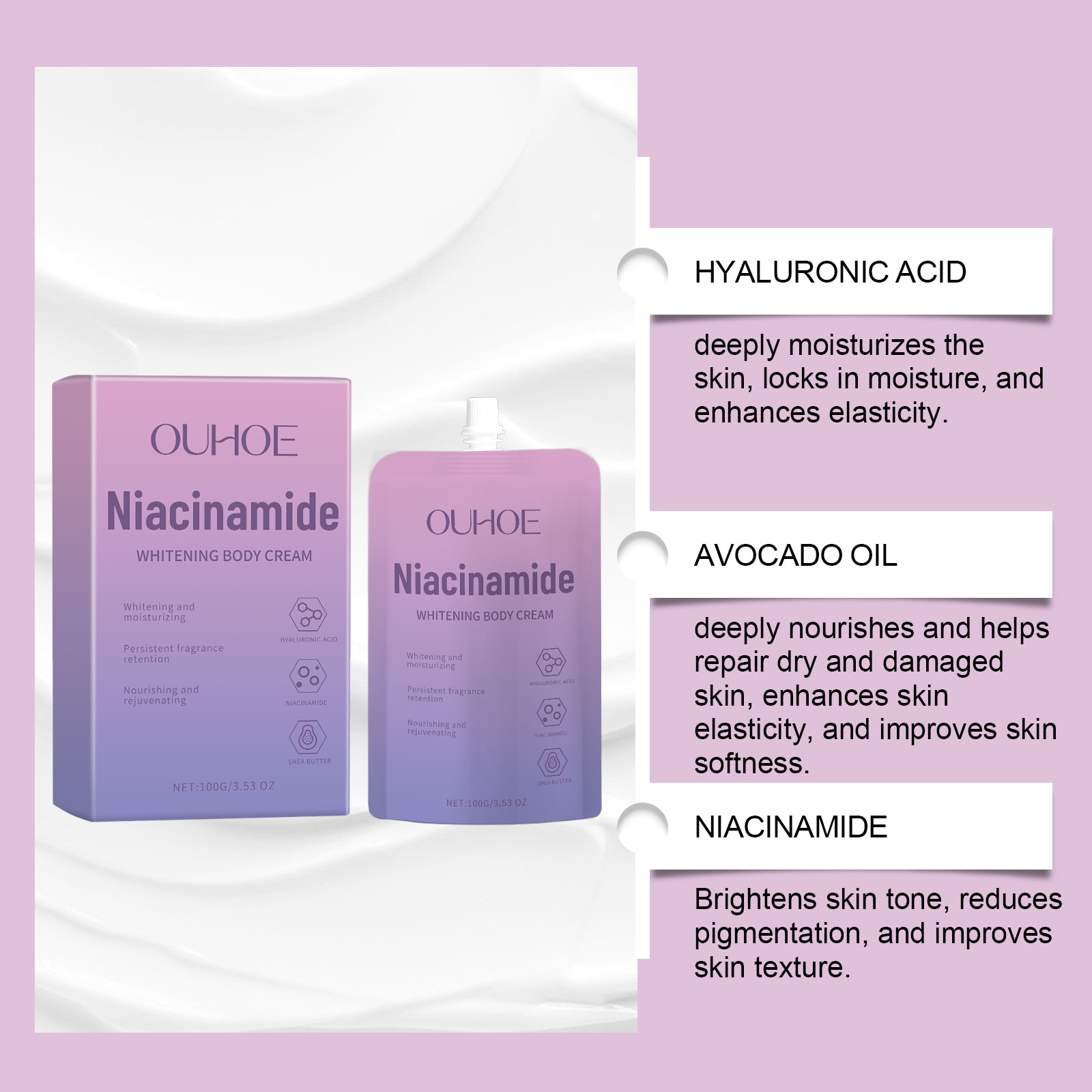 Our niacinamide brightening body cream contains hyaluronic acid, niacinamide and shea butter. It can improve skin elasticity and firmness and improve relaxation. Its use method is very simple: 1. Clean the body skin and keep it dry. 2. Take appropriate amount of this product and apply it to the body evenly on the skin. 3. Gently massage until completely absorbed. Continuous use can significantly improve skin tone, enhance skin glow, and make skin look younger.
