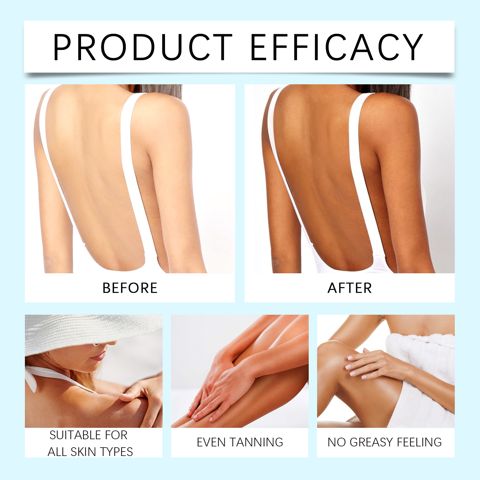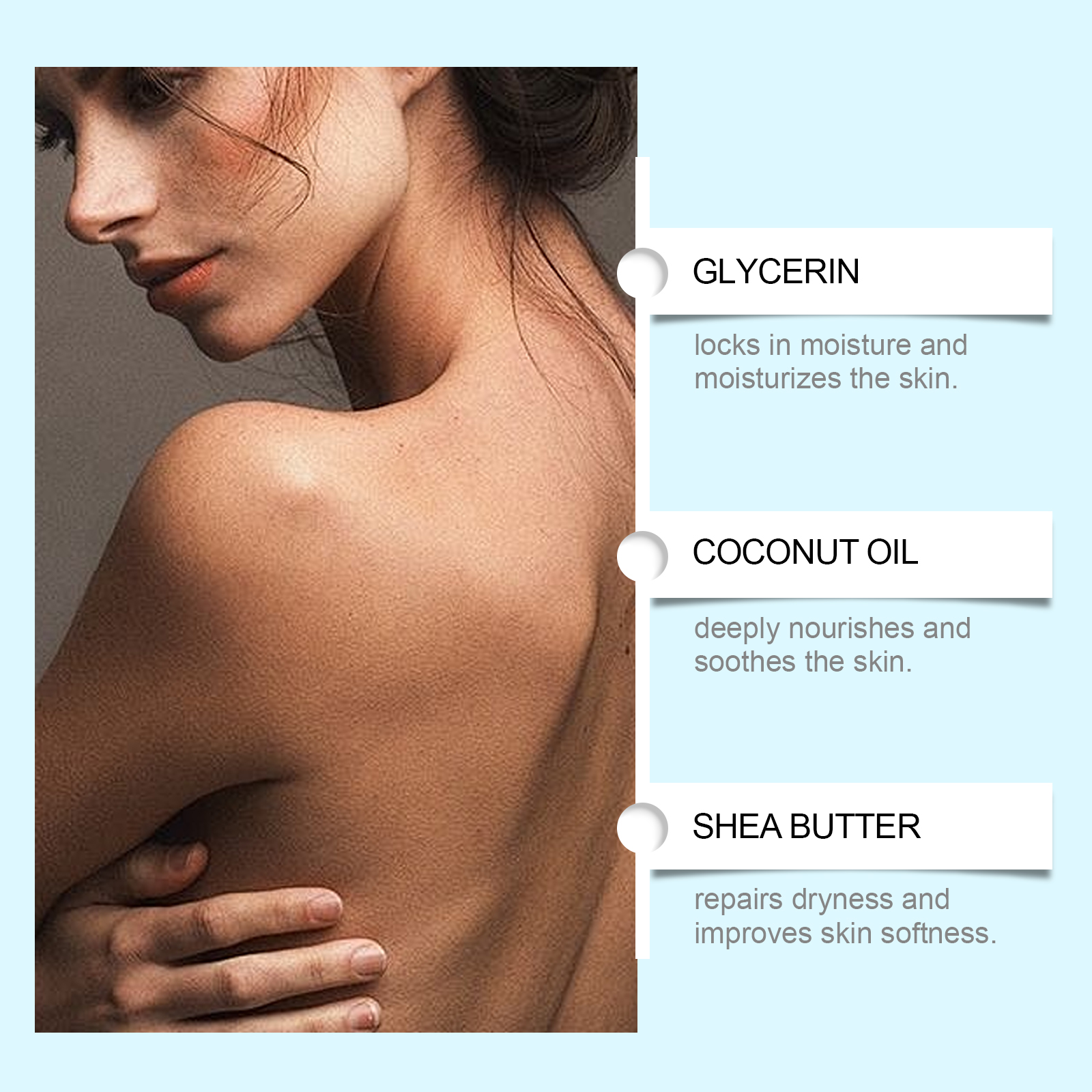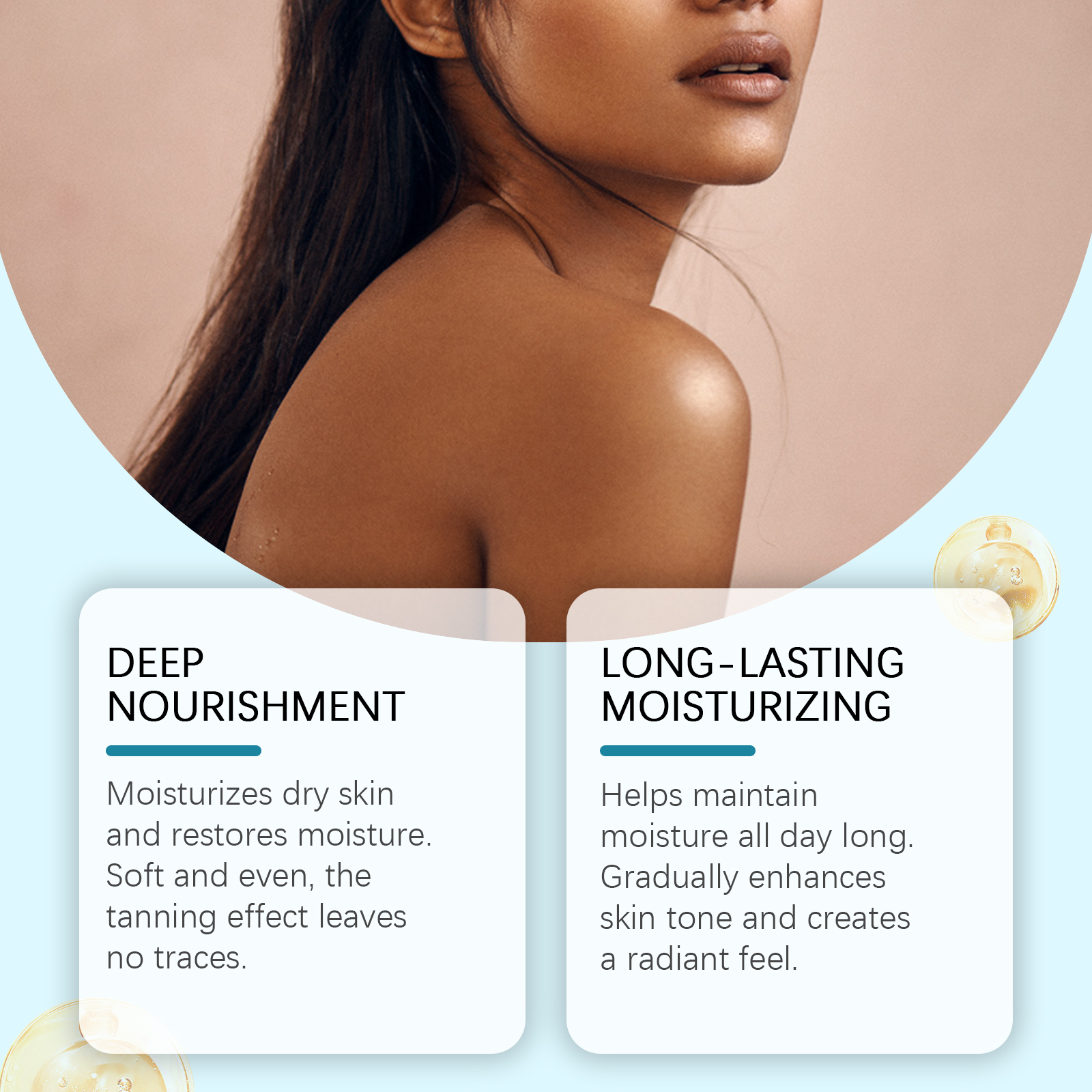 Our skin nourishing cream contains triethanolamine, coconut oil, shea butter. It can moisturize dry skin, restore skin moisture, soft and even, and leave no trace of tanning effect. The way to use it is simple: clean and dry your skin. Apply evenly to face and body and gently massage until absorbed. It also helps to retain moisture throughout the day, gradually elevating skin tone and creating a radiant feeling.