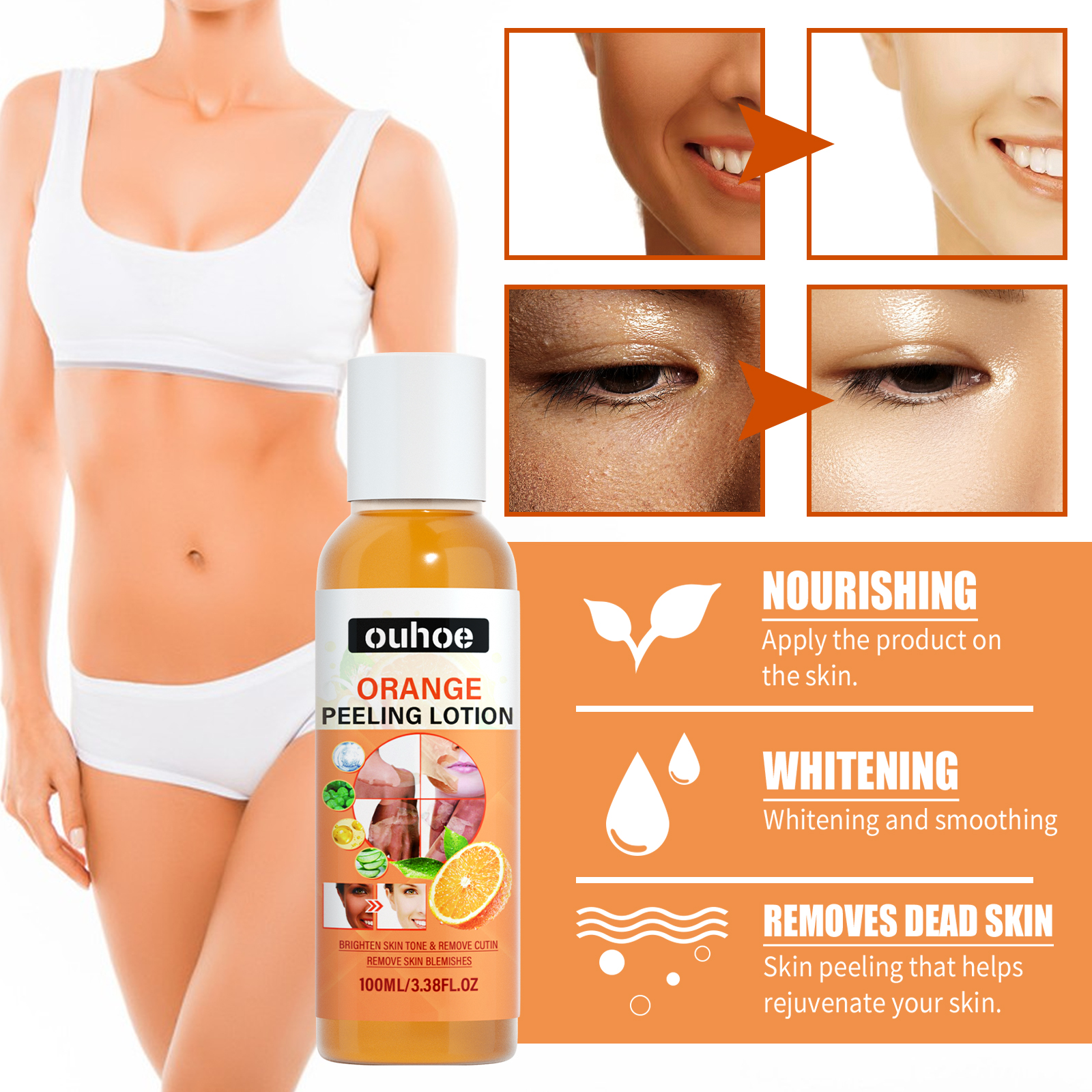 Our Orange peel body lotion contains vitamin C, hyaluronic acid, and Centella asiatica extract. It can lighten dark spots and remove skin blemishes. Exfoliate dead skin, moisturize skin, lighten skin tone and increase skin elasticity. Whiten the skin. Its use is very simple: first of all, evenly apply the product on the skin, wait for 15 minutes, rinse with water repeatedly and then tear off, use 3 times a day, pay attention to sun protection measures, dead skin will fall off after 3-4 days, please let it fall off naturally. It is recommended to use with whitening, moisturizing cream and other products for better effect. After use, it can effectively dilute pigmentation, reduce skin melanin, replenish skin moisture, relieve skin dryness, and make skin more elastic and whitening.
