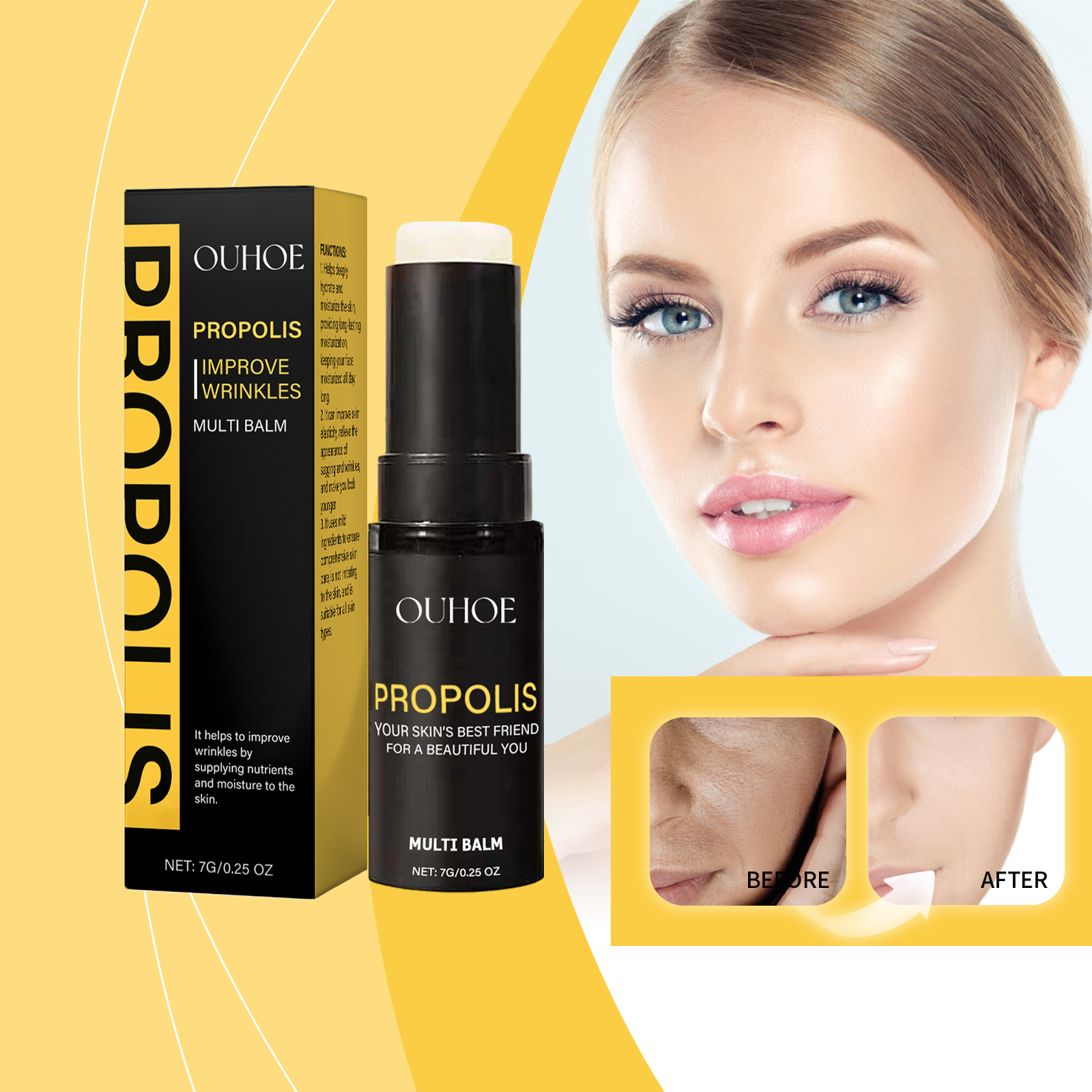 Our propolis eye moisturizer bar contains argan kernel oil and tocopherol. It keeps your skin hydrated for a long time. Its application method is simple: clean facial skin, keep smooth, open the bottle cap, screw on the product, apply directly to facial skin, gently massage until fully absorbed. And can provide lasting nutrition for the skin.
