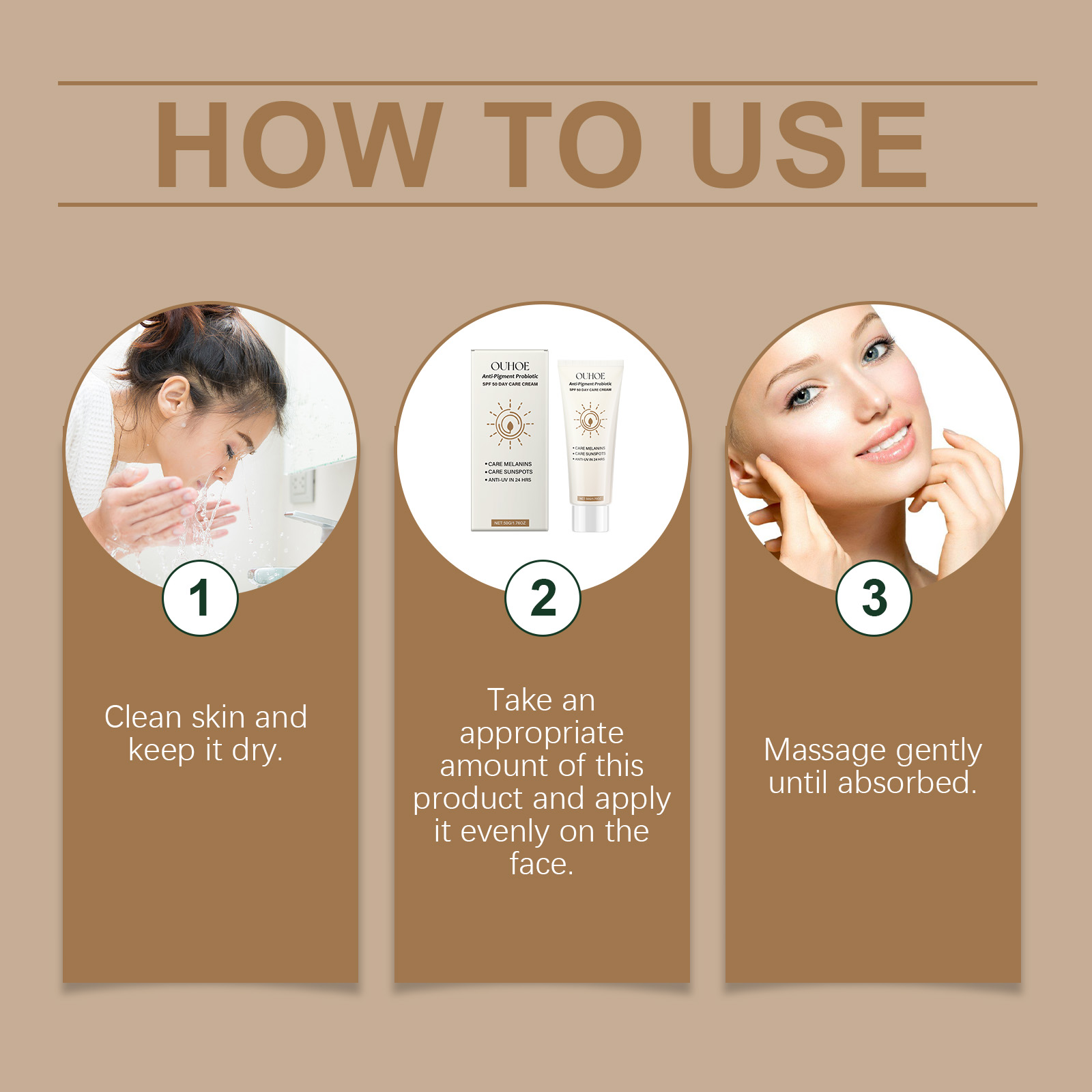 Our protective moisturizing cream contains peppermint extract, titanium dioxide. It can effectively inhibit melanin production, help reduce pigmentation and improve uneven skin tone. Its application method is very simple: clean the skin, keep the skin dry, apply appropriate amount of this product evenly on the face, gently massage until absorbed. It can also help to lighten existing pigmentation, brighten the complexion, and make your skin look more even and brighter.