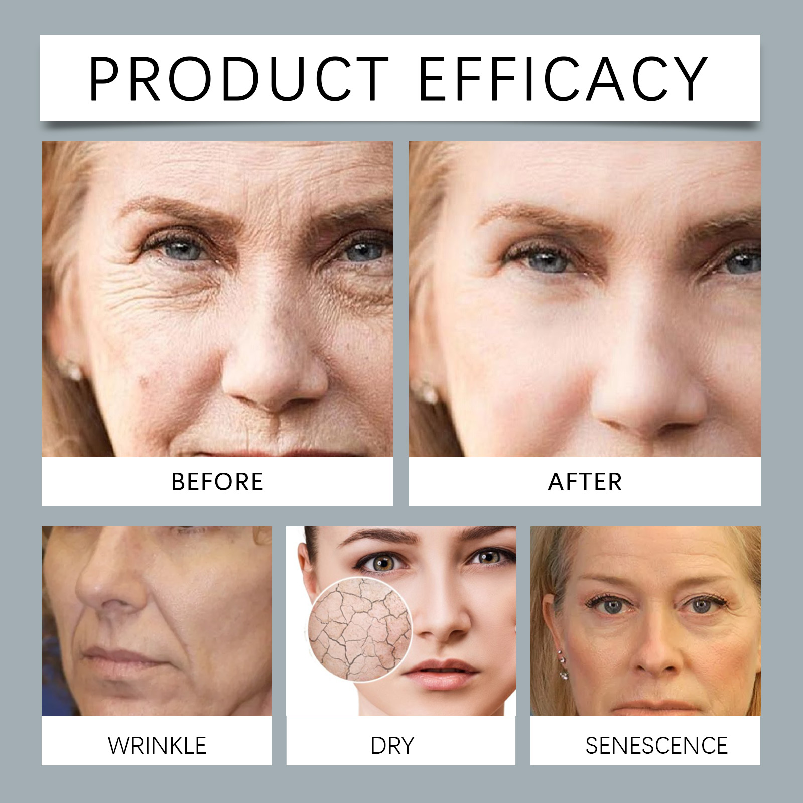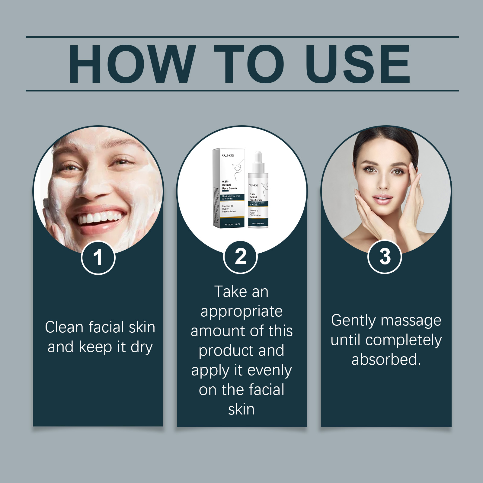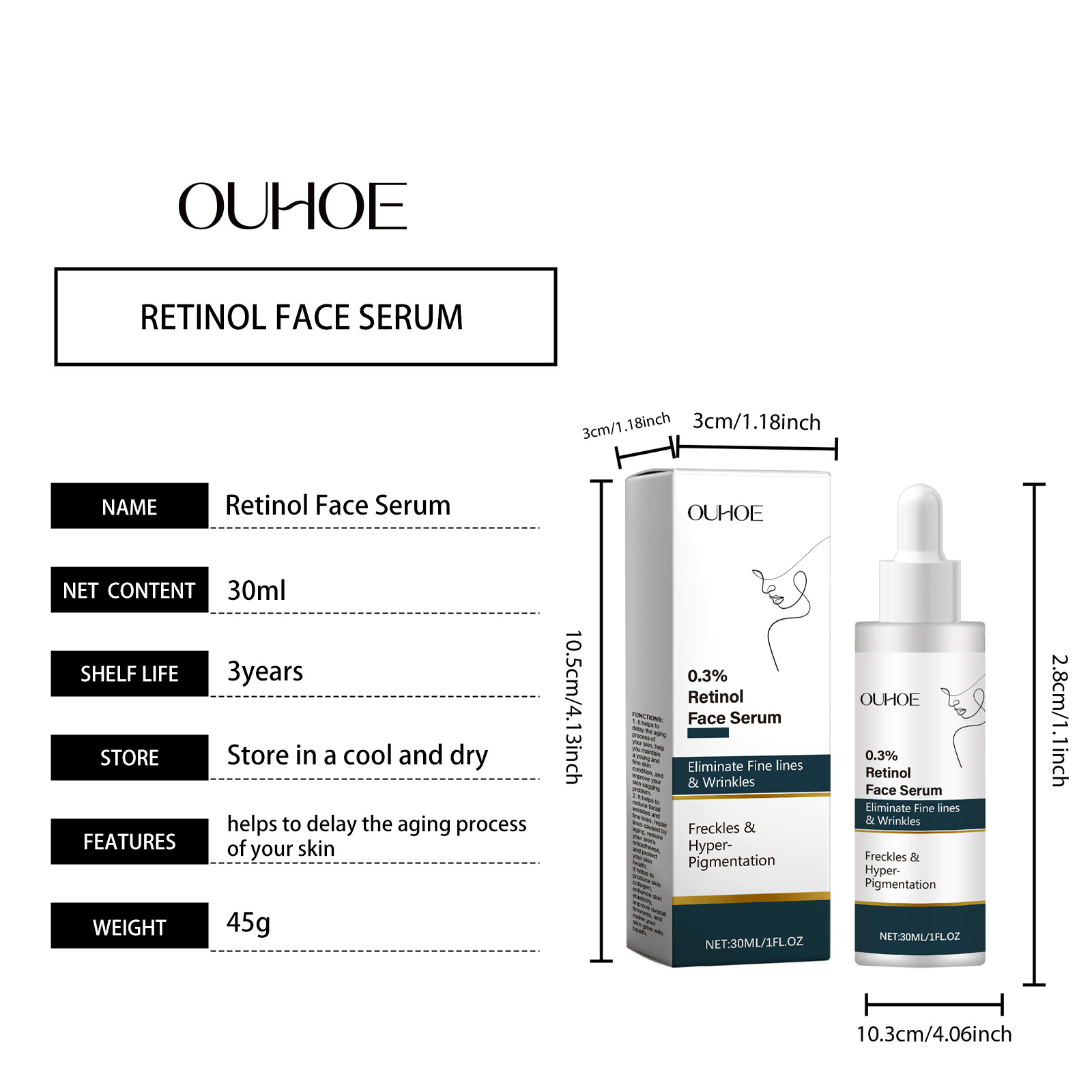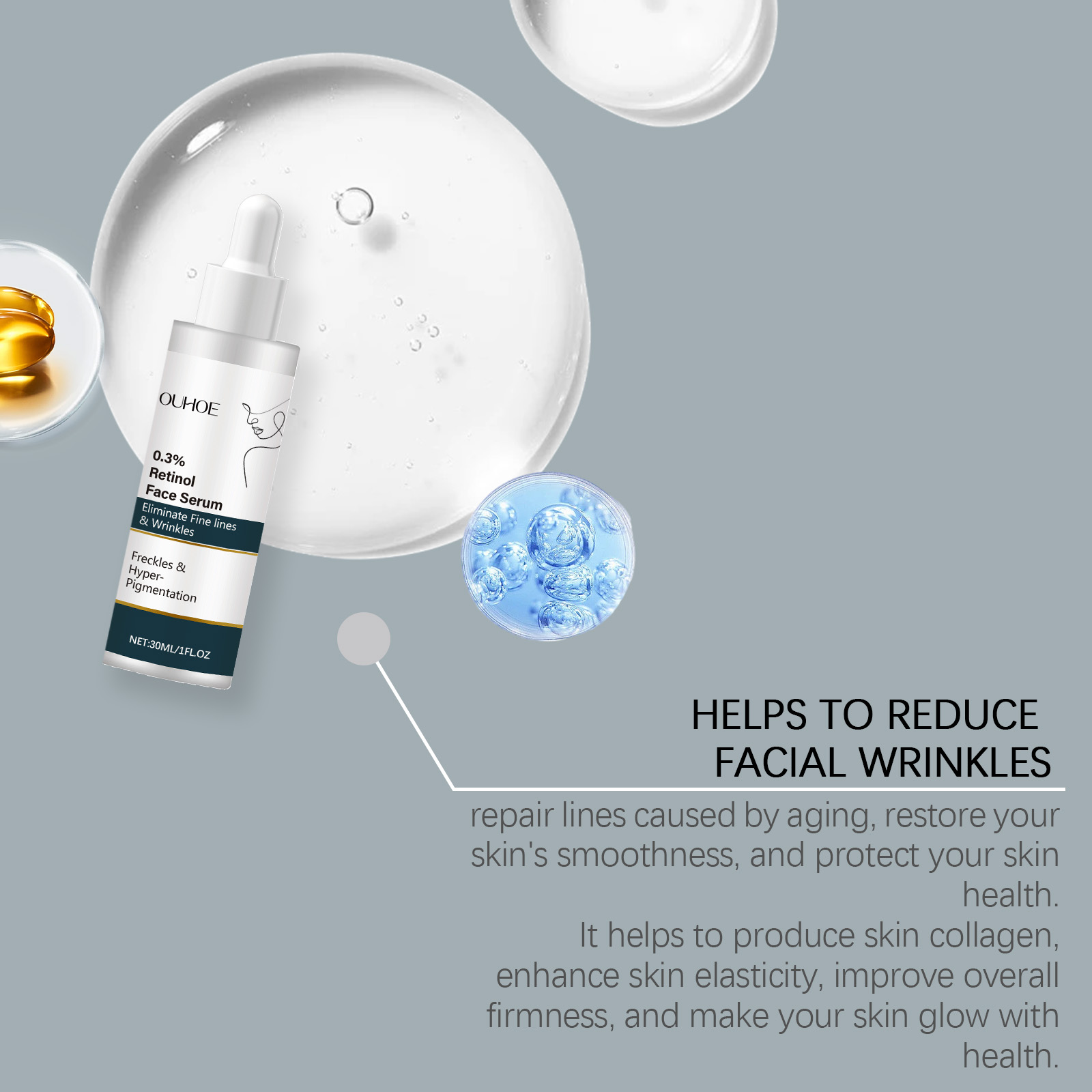 Our retinol face serum contains glycerin, vitamin E (tocopherol). It can improve skin texture, restore skin shine and healthy elasticity. The way to use it is simple: clean the face and keep the skin dry. Apply appropriate amount of this product evenly on the face. Gently massage until absorbed. It can also enhance the skin's barrier function, help repair damaged skin cells, reduce fine lines caused by dryness, and improve skin elasticity and firmness.
