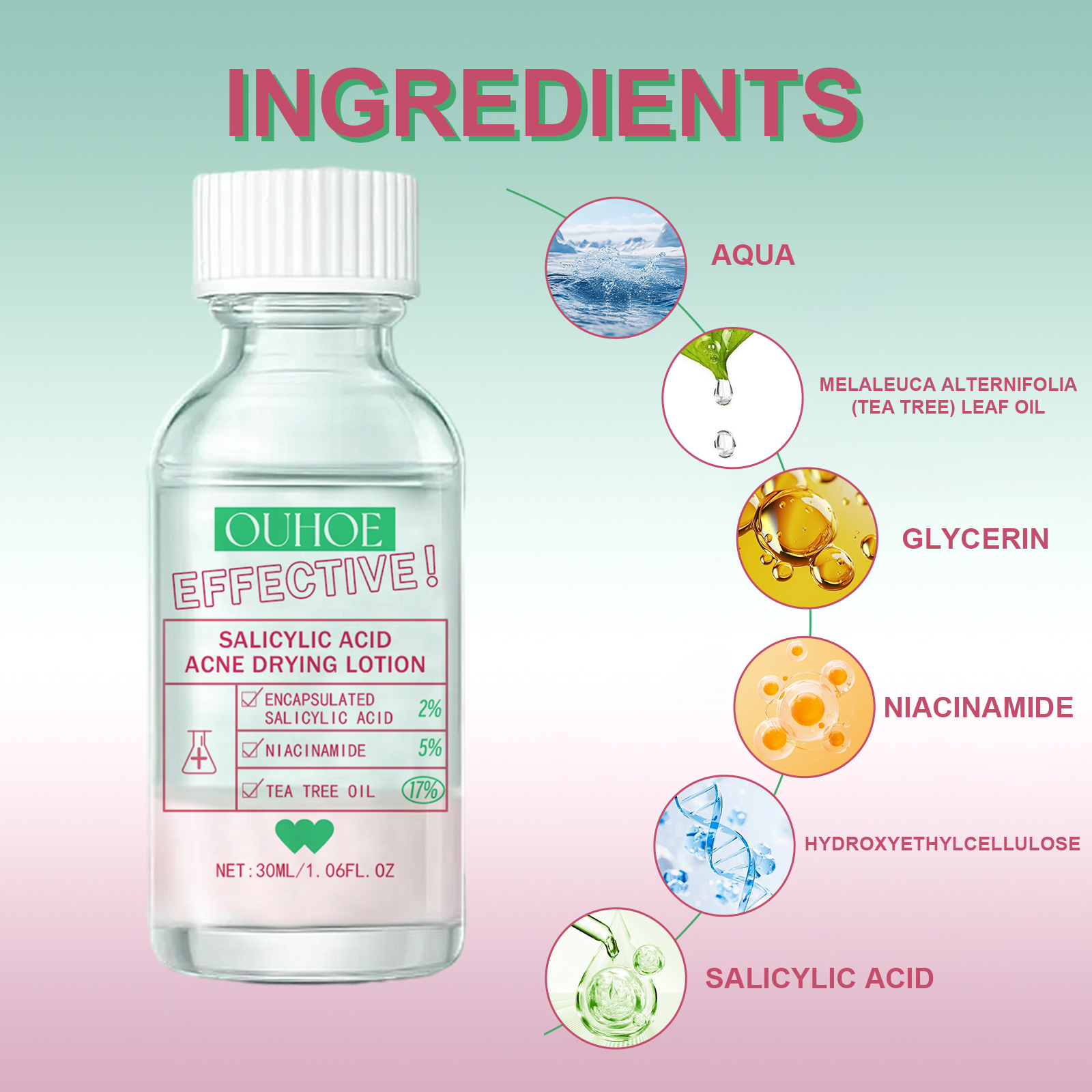Our salicylic acid acne lotion contains interleaved eucalyptus leaf oil and glycerin. It can effectively prevent the increase of acne, improve skin quality, make the skin whiter and more radiant, moisturize the skin, provide long-lasting moisturizing effects, and make the skin healthier and more radiant. Its usage is very simple: Clean the facial skin. Take this product with a clean cotton swab, apply it to the desired area, leave it overnight, and then rinse it off with clean water. It can retain moisture, brighten the skin, repair acne-prone skin and refine pores.