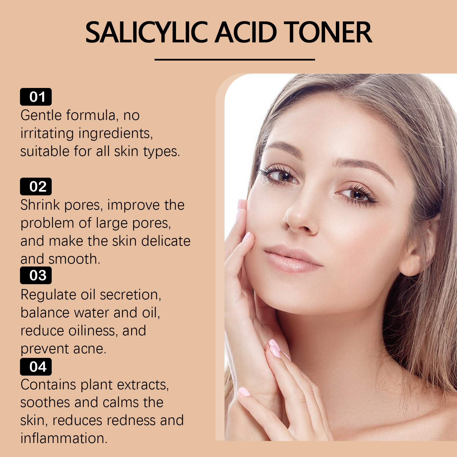 Our salicylic acid pore care toner contains salicylic acid, Centella asiatica extract, papaya extract. It can effectively remove acne and acne, improve skin roughness; Helps remove excess impurities and cleanse the skin. Its application method is simple: 1. Thoroughly clean and dry the skin; 2. Apply appropriate amount of the product evenly on the face; 3. Massage gently to promote full absorption. Effectively remove closed pimples and acne, leaving skin smoother. It gently exfoliates the skin while moisturizing it so that your skin doesn't feel tight.