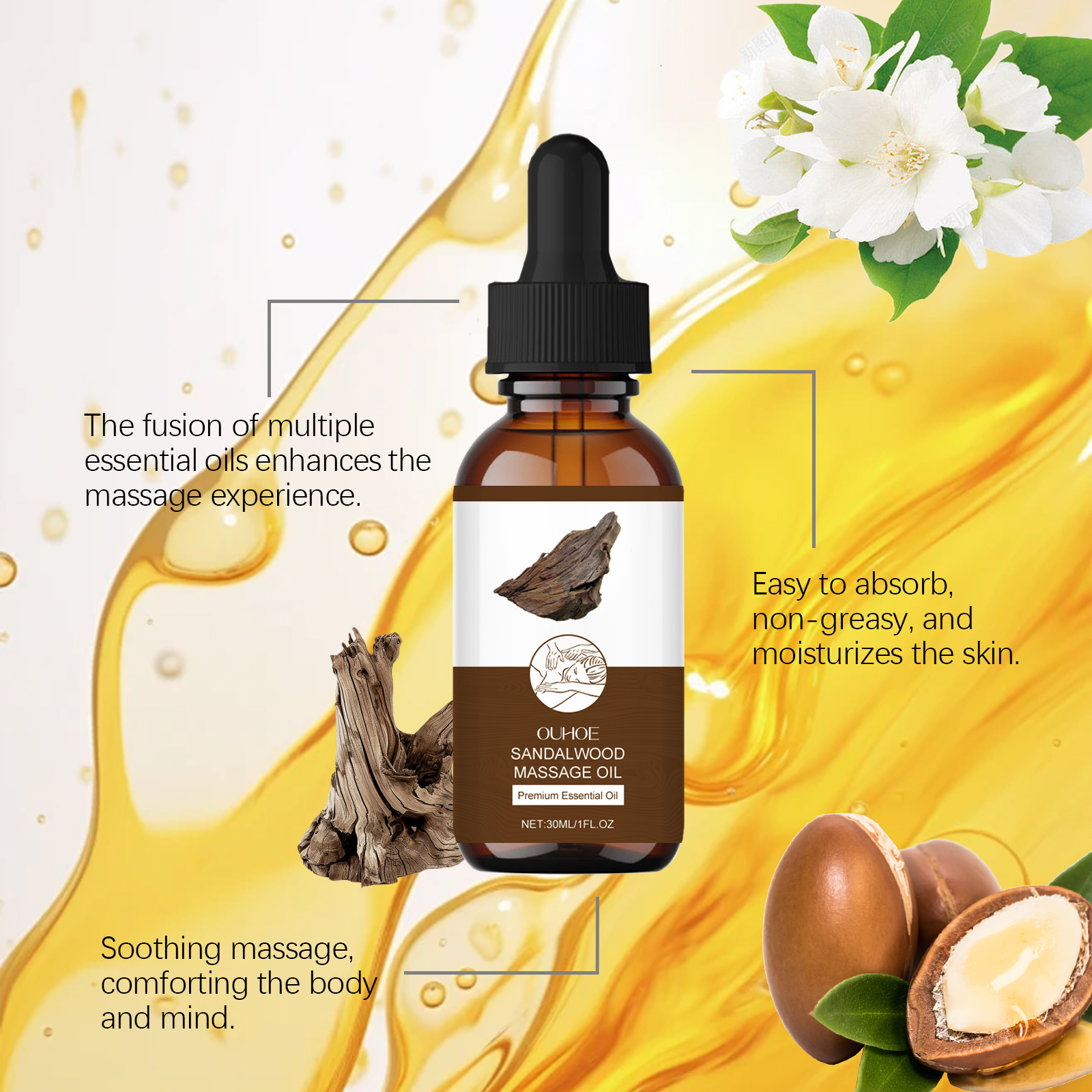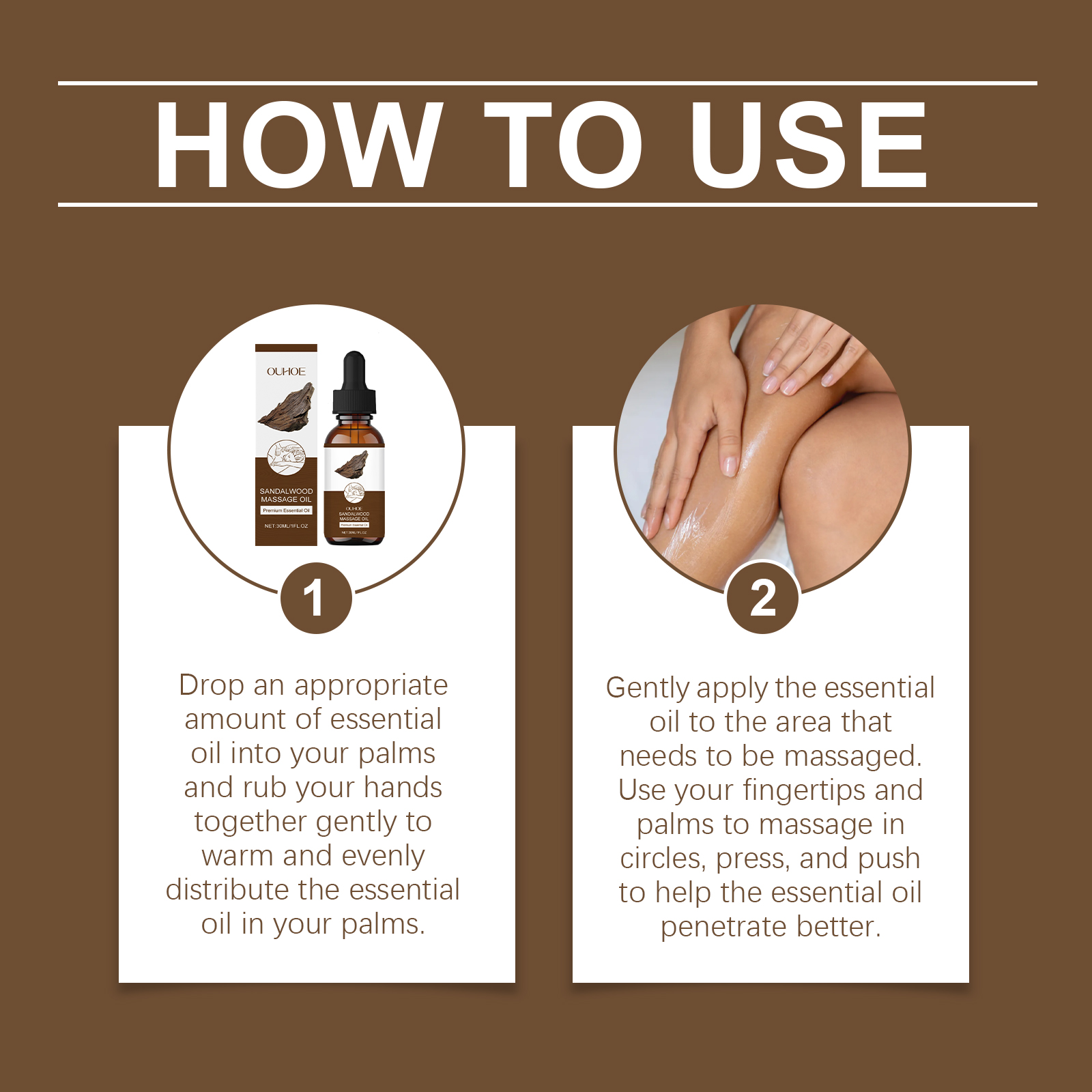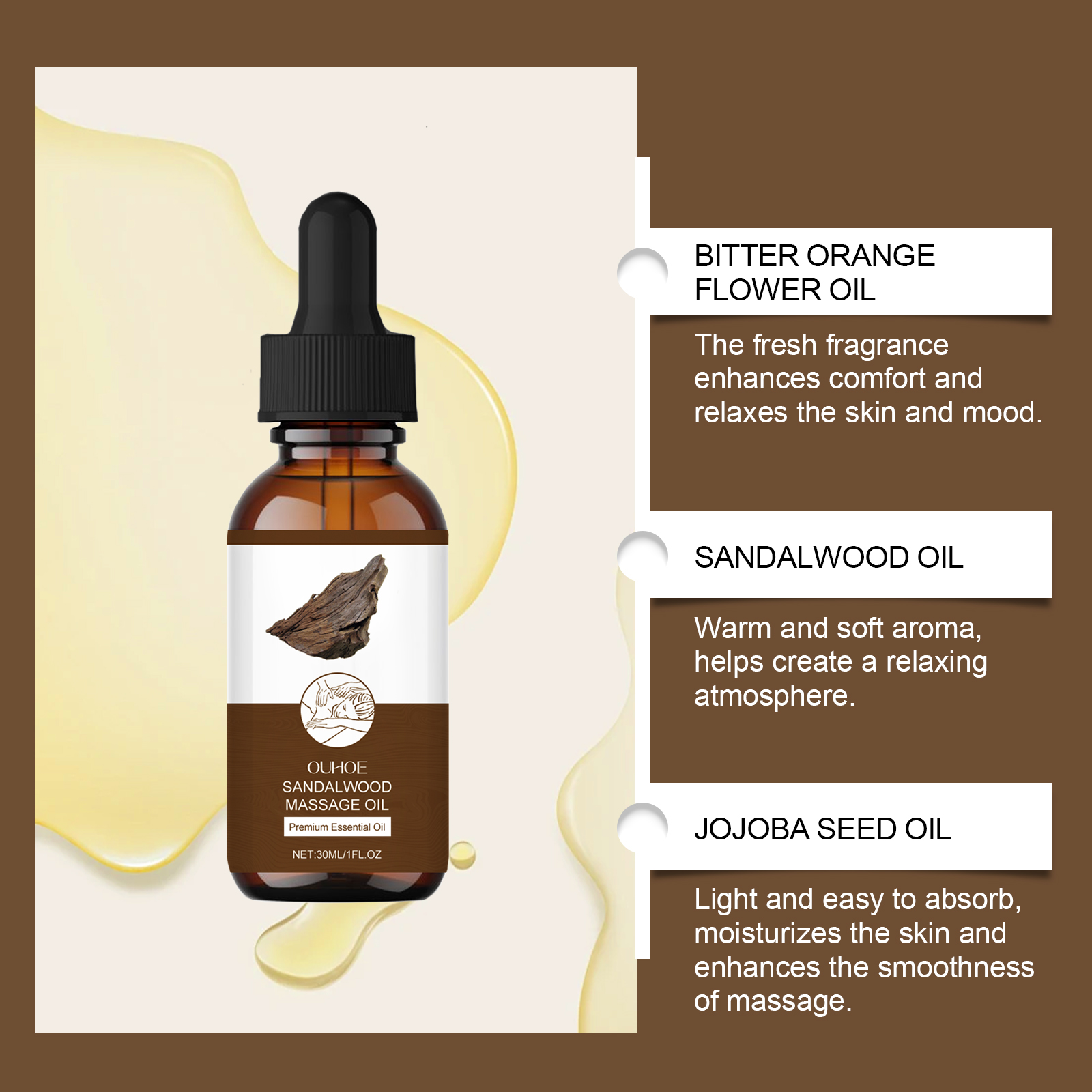 Our sandalwood massage oil contains jasmine extract, neroli oil, sandalwood oil. It can help reduce stress and bring about a relaxing experience. The essential oil formula deeply moisturizes the skin, leaving it smooth and not dry after massage. Its use method is very simple: 1. Drop an appropriate amount of essential oil into the palm of your hand and gently rub your hands to make it warm and evenly distributed on the palm of your hand. 2. Gently apply the essential oil to the area that needs to be massaged, massaging with your fingertips and palms, pressing, and pushing to help the essential oil penetrate better. The warm aroma of sandalwood oil helps to relax the body and mind for a comfortable massage experience; Jojoba seed oil ingredients deeply moisturize and help skin stay smooth and shiny after massage.
