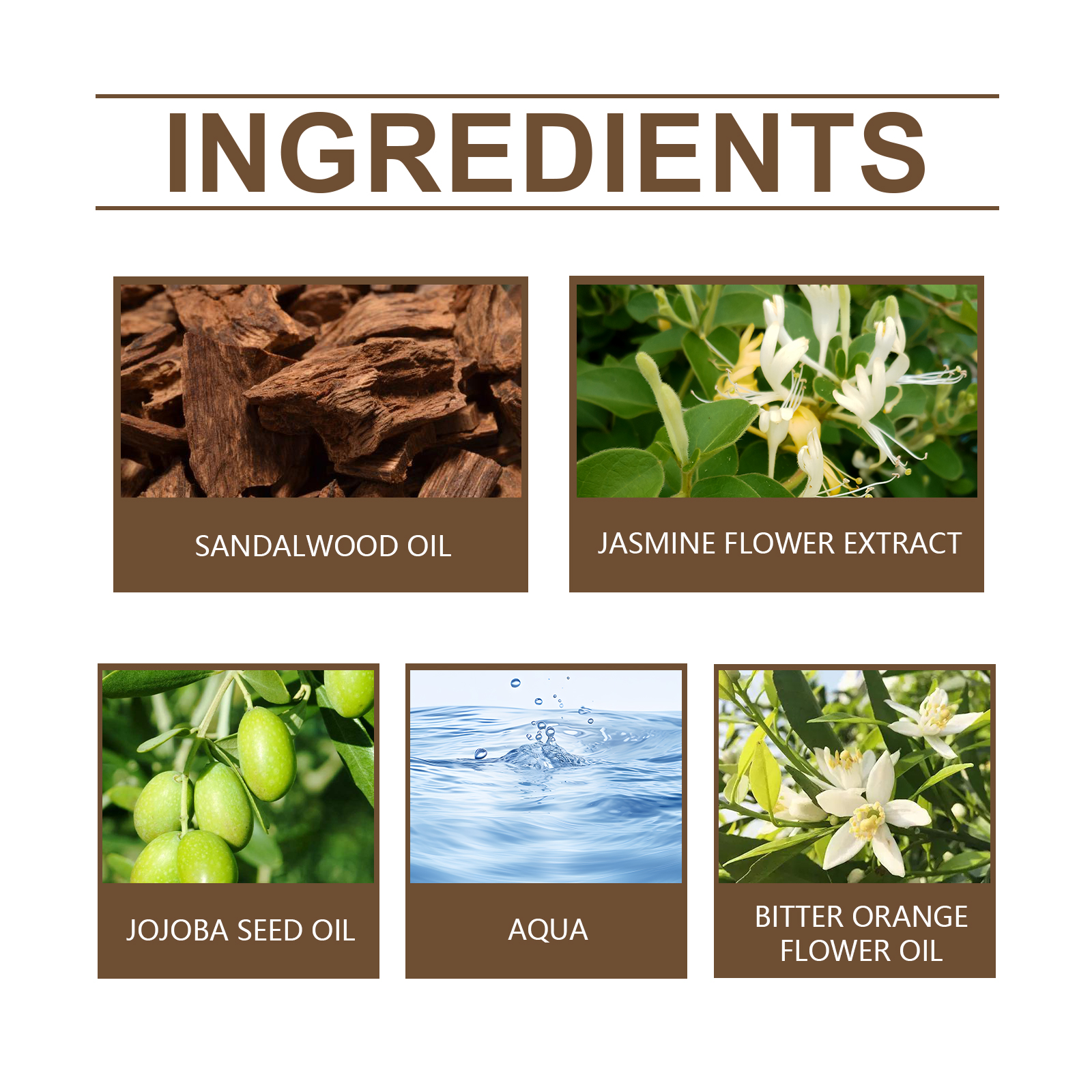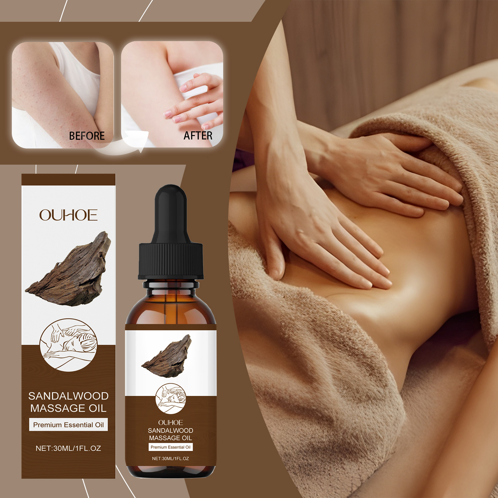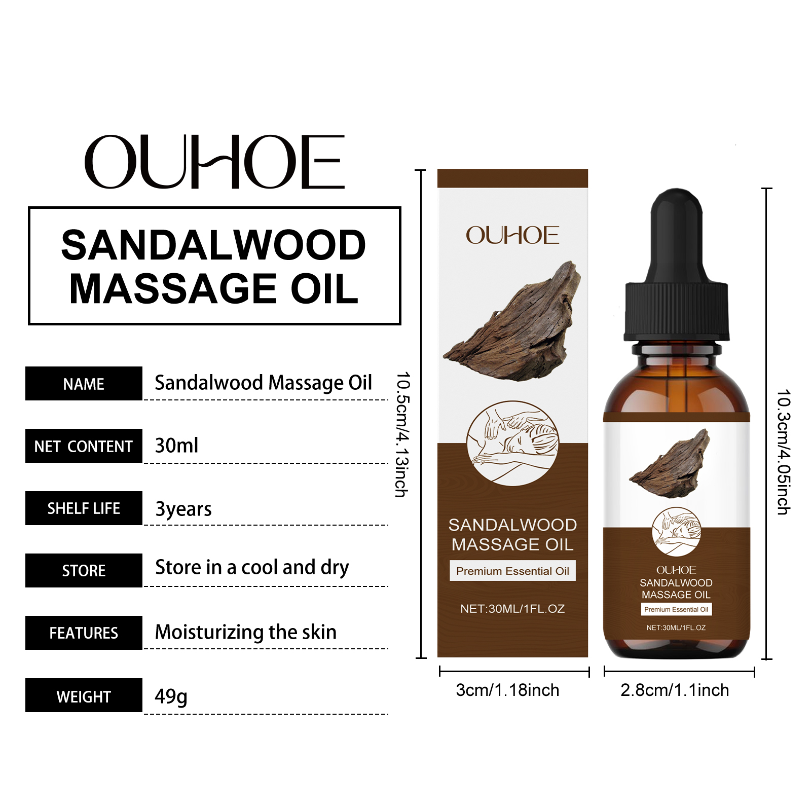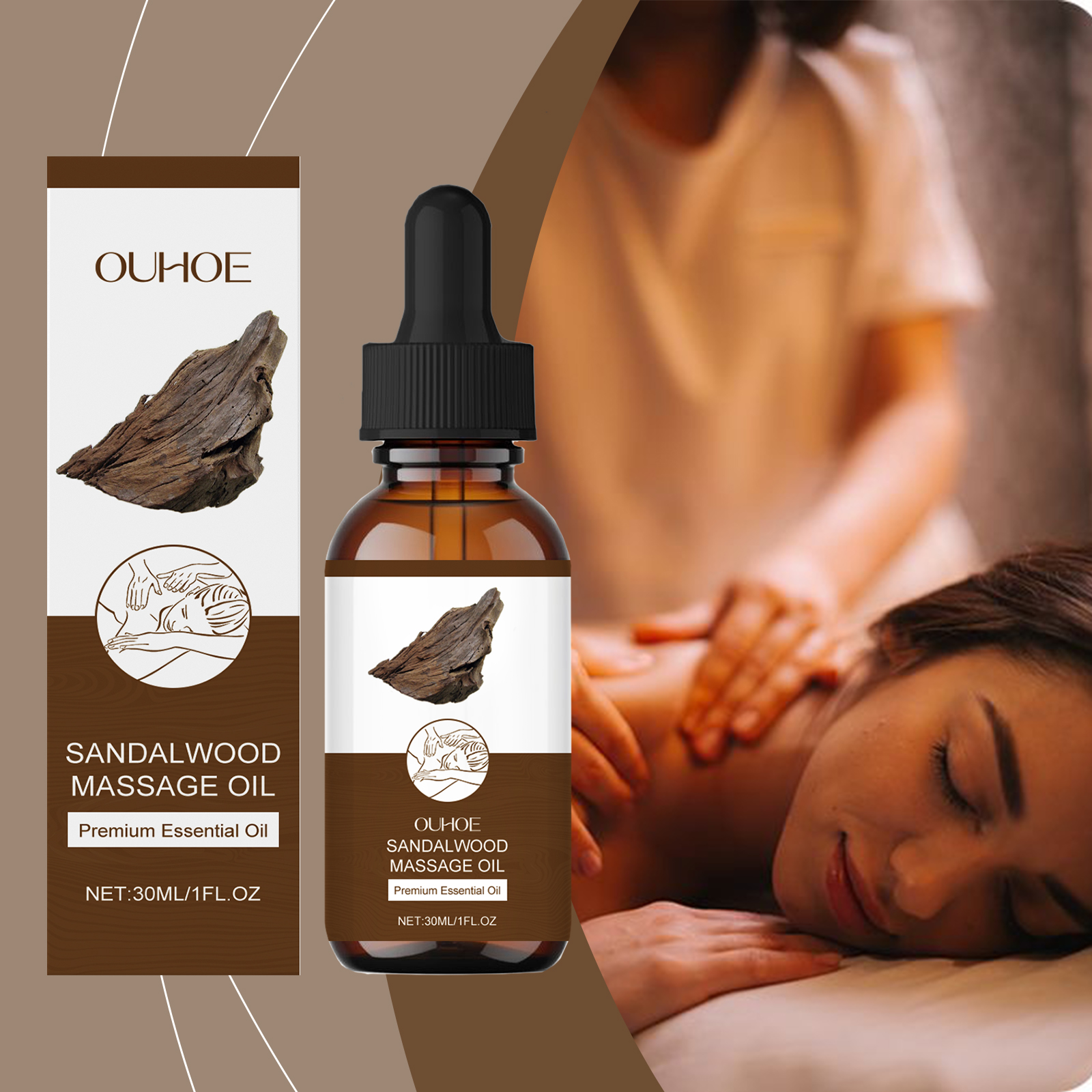 Our sandalwood massage oil contains jasmine extract, neroli oil, sandalwood oil. It can help reduce stress and bring about a relaxing experience. The essential oil formula deeply moisturizes the skin, leaving it smooth and not dry after massage. Its use method is very simple: 1. Drop an appropriate amount of essential oil into the palm of your hand and gently rub your hands to make it warm and evenly distributed on the palm of your hand. 2. Gently apply the essential oil to the area that needs to be massaged, massaging with your fingertips and palms, pressing, and pushing to help the essential oil penetrate better. The warm aroma of sandalwood oil helps to relax the body and mind for a comfortable massage experience; Jojoba seed oil ingredients deeply moisturize and help skin stay smooth and shiny after massage.
