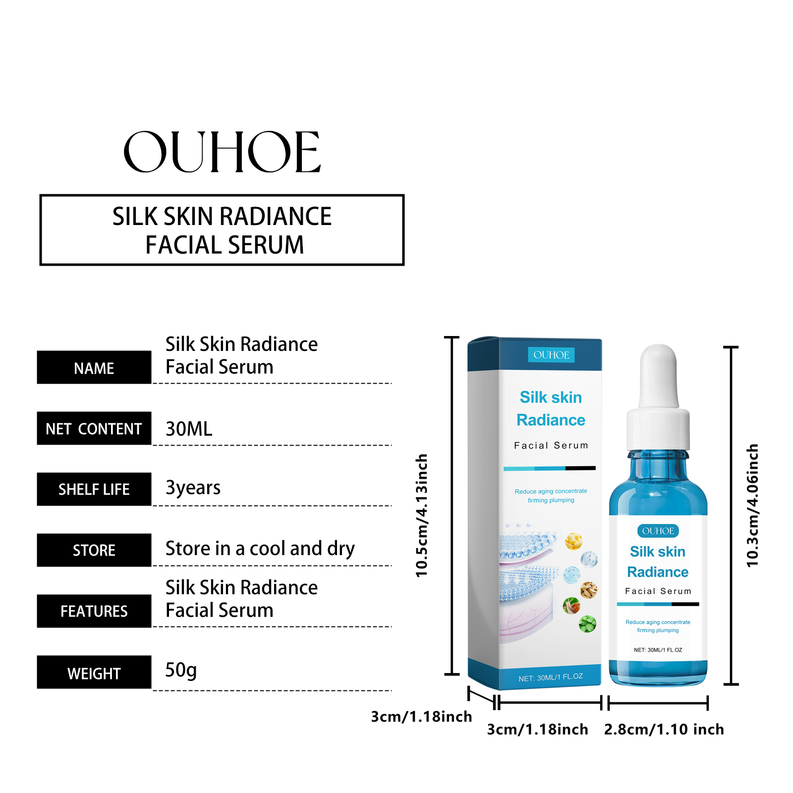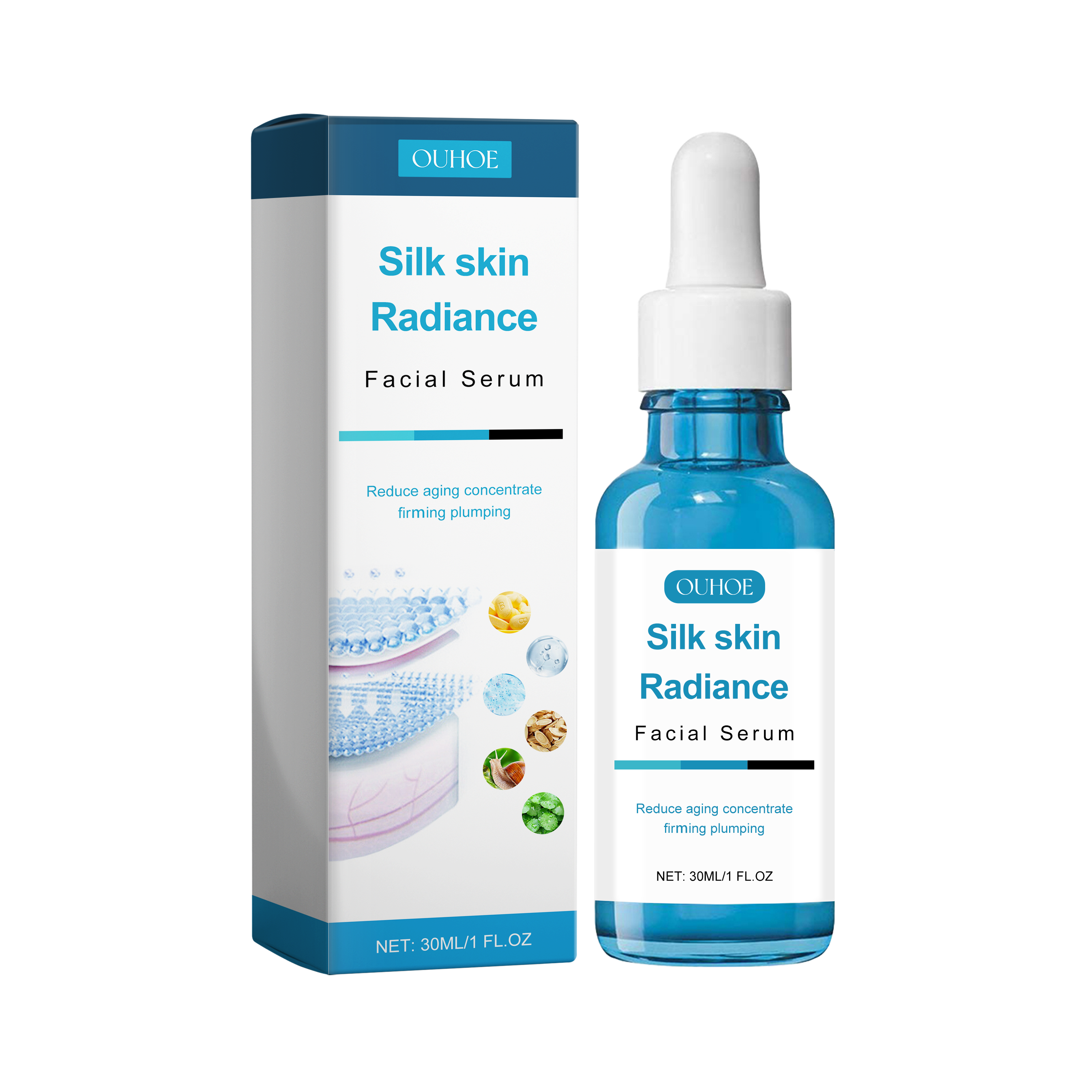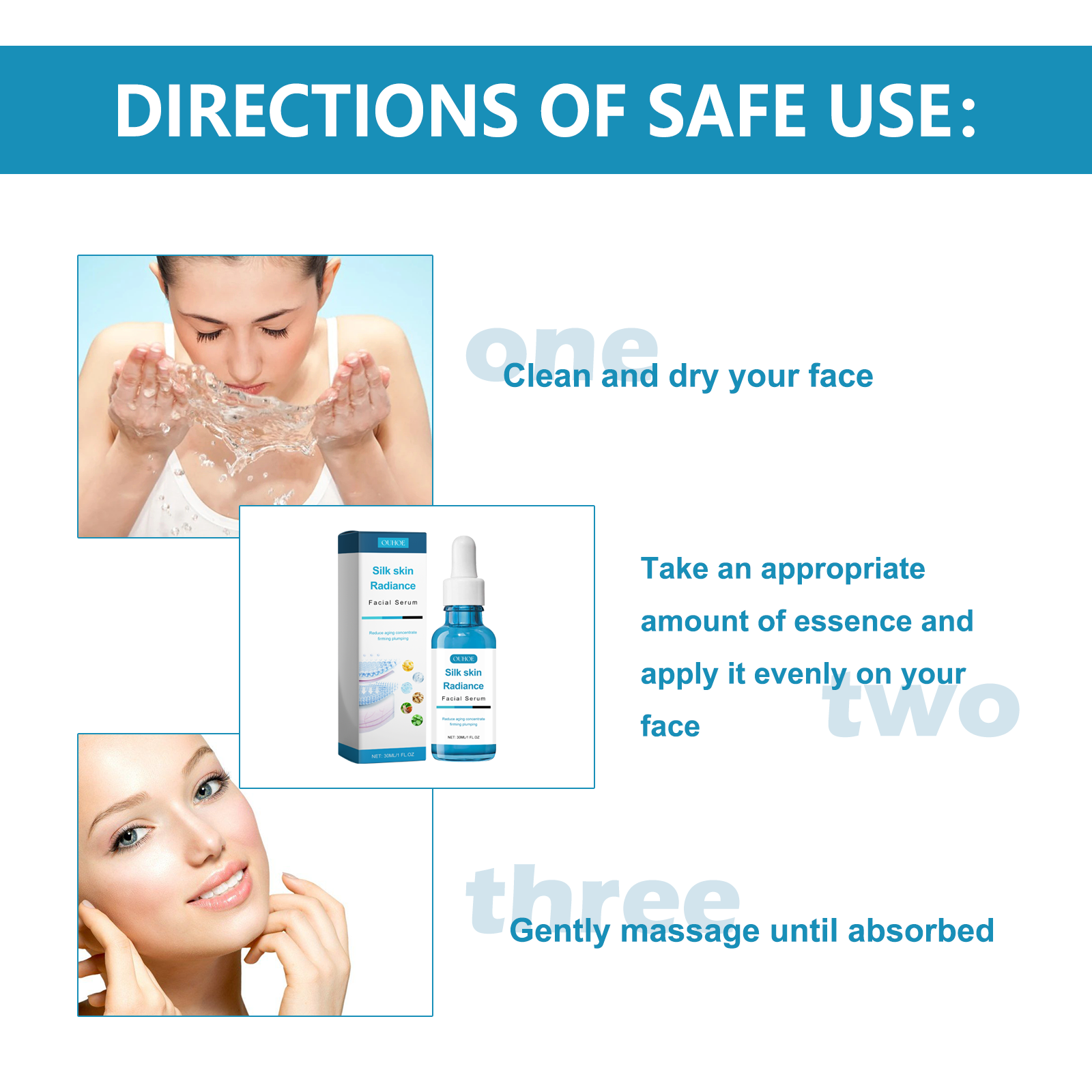 Our Silk Skin Radiance Facial Serum contains Centella Asiatica Extract, Hyaluronic Acid, Niacinamide. It can reshape young skin, fade fine lines, make skin firmer, reduce dullness, glow, instantly moisturize, deeply nourish, make skin soft and delicate, keep water locked for a long time, and maintain skin moisturizing state. Its use method is very simple: clean and dry the face, take the appropriate amount of essence evenly spread on the face, gently massage until absorbed. It can balance skin oil secretion, improve skin quality, even skin tone, and make skin bright and clear.