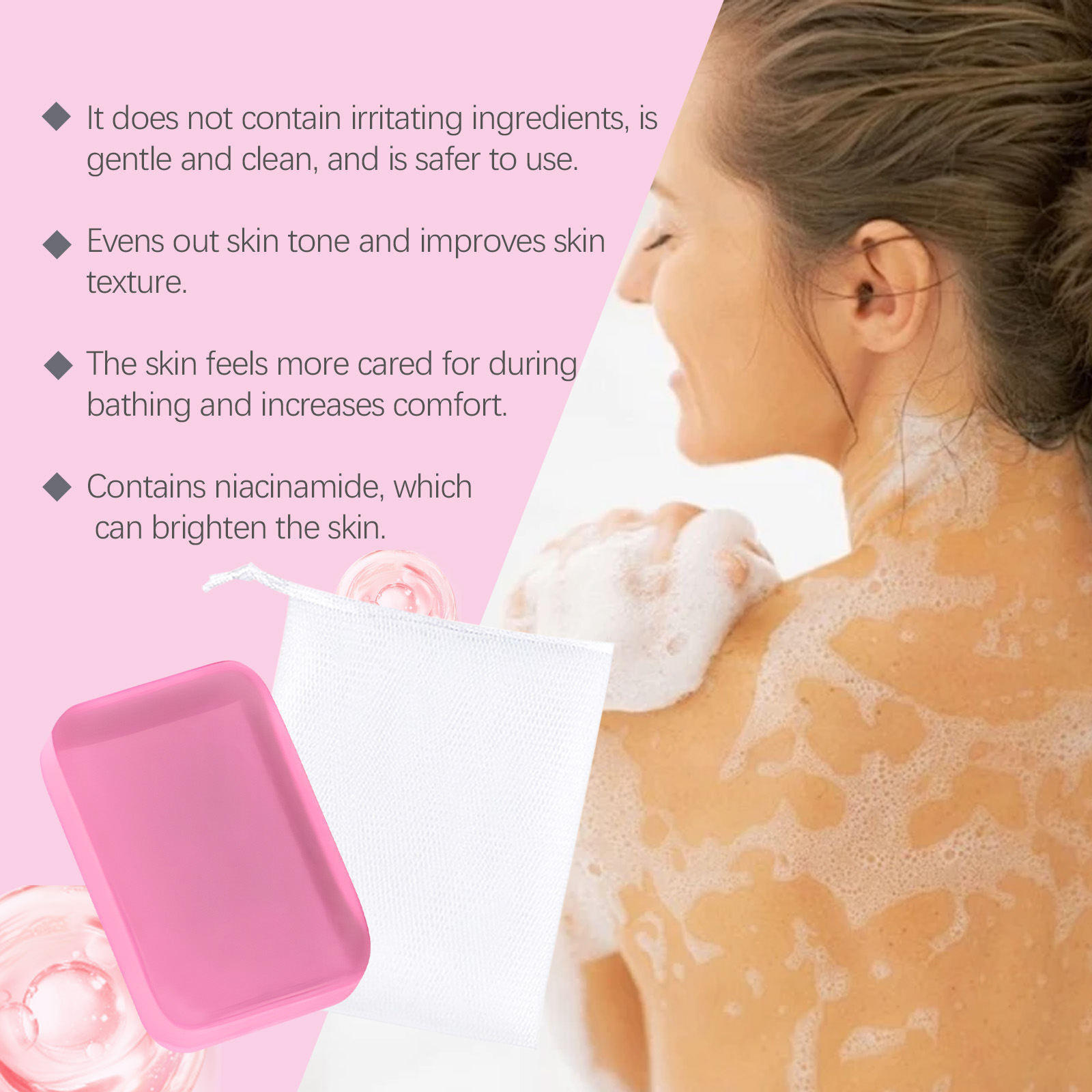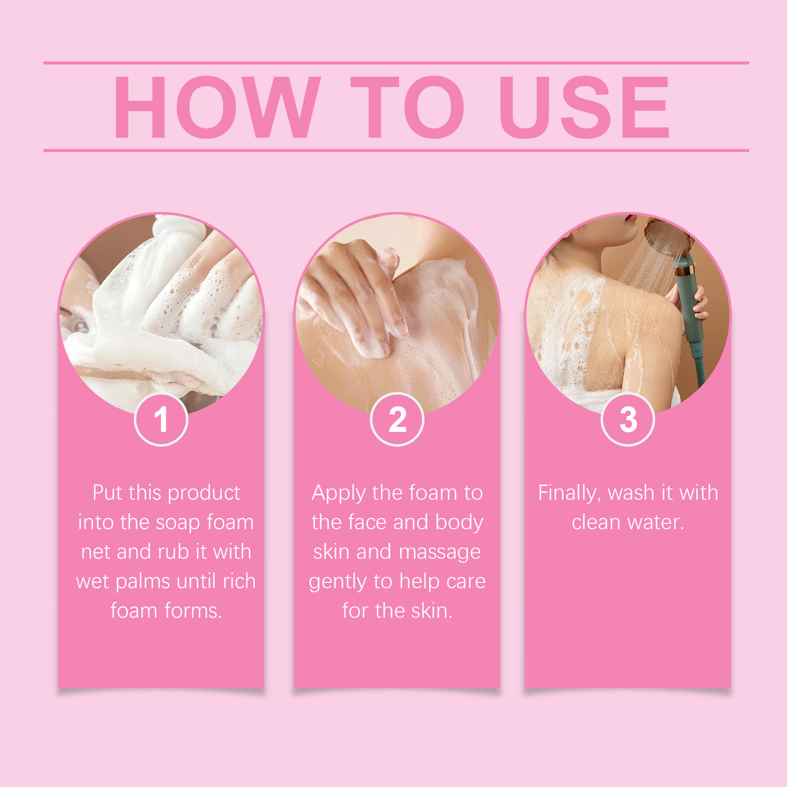 Our skin care soap contains sodium palmitate and glycerin. It can foam delicate and rich, easily cover the skin, bring cleansing enjoyment. It whitens and brightens the skin, making your skin whiter. Its application is simple: Place this product into a soap foam mesh and rub it with a wet palm until a rich foam forms. Apply the foam to the face and body skin and massage gently to help care for the skin. Finally, rinse with water. And the skin can feel smoother and more comfortable after use.