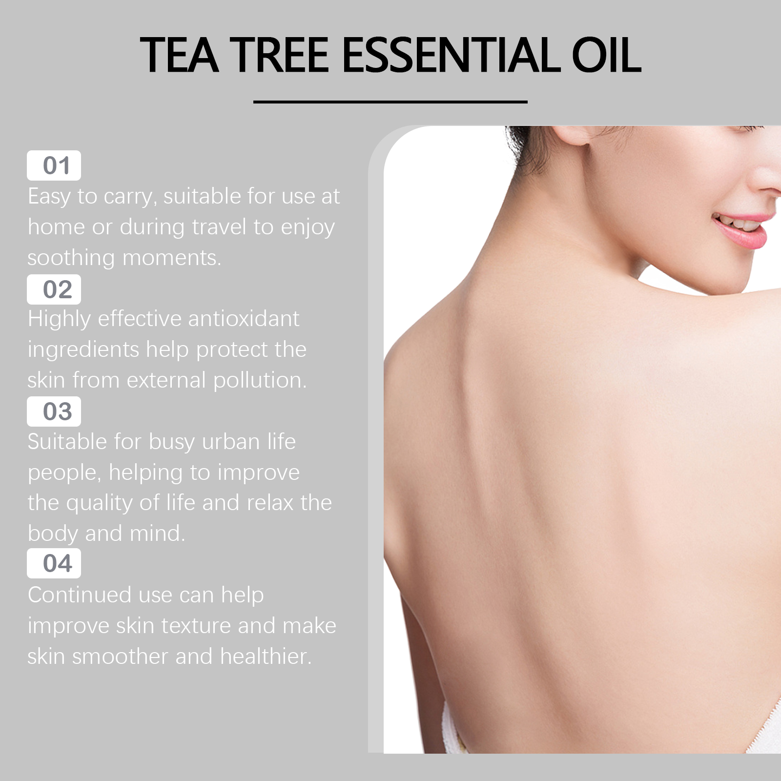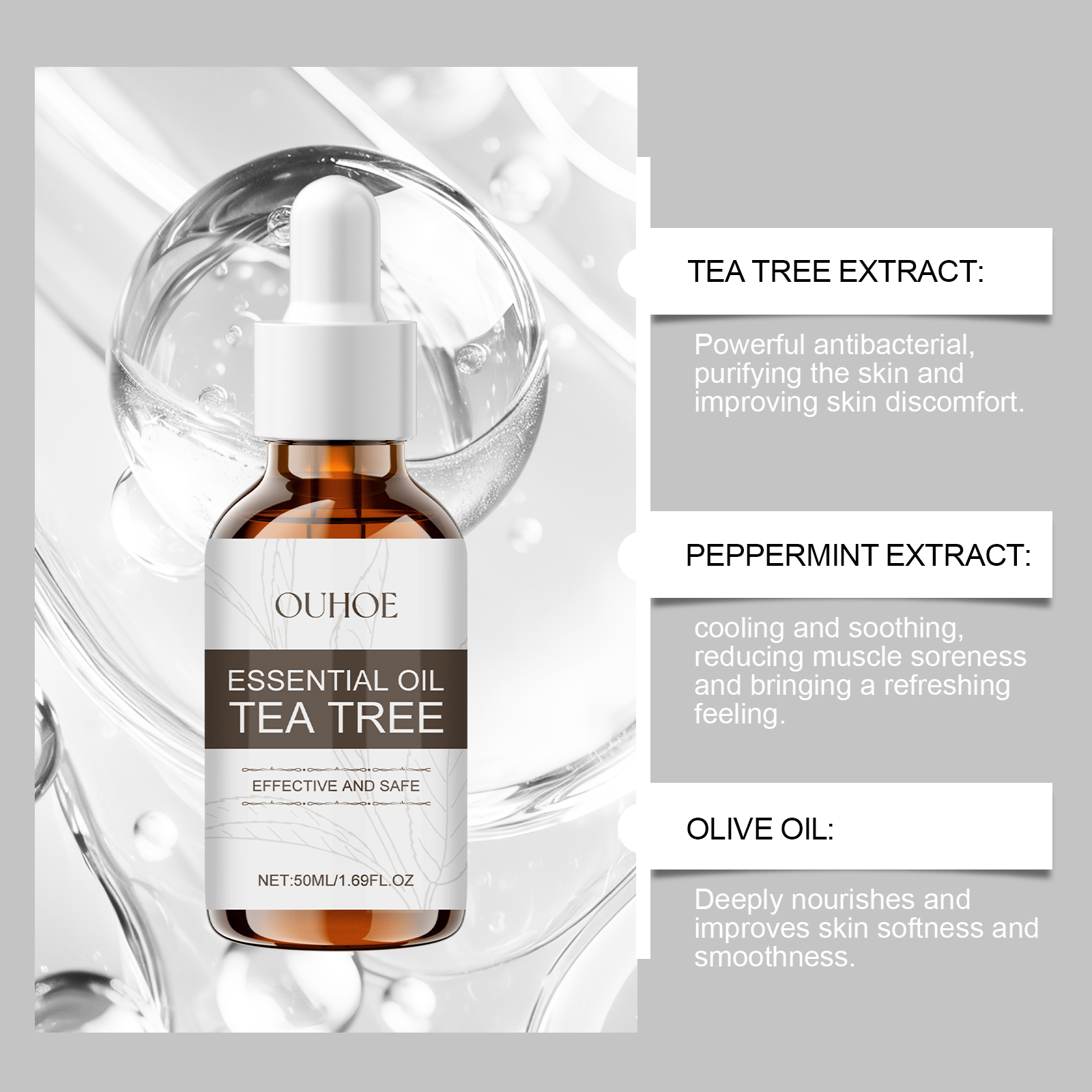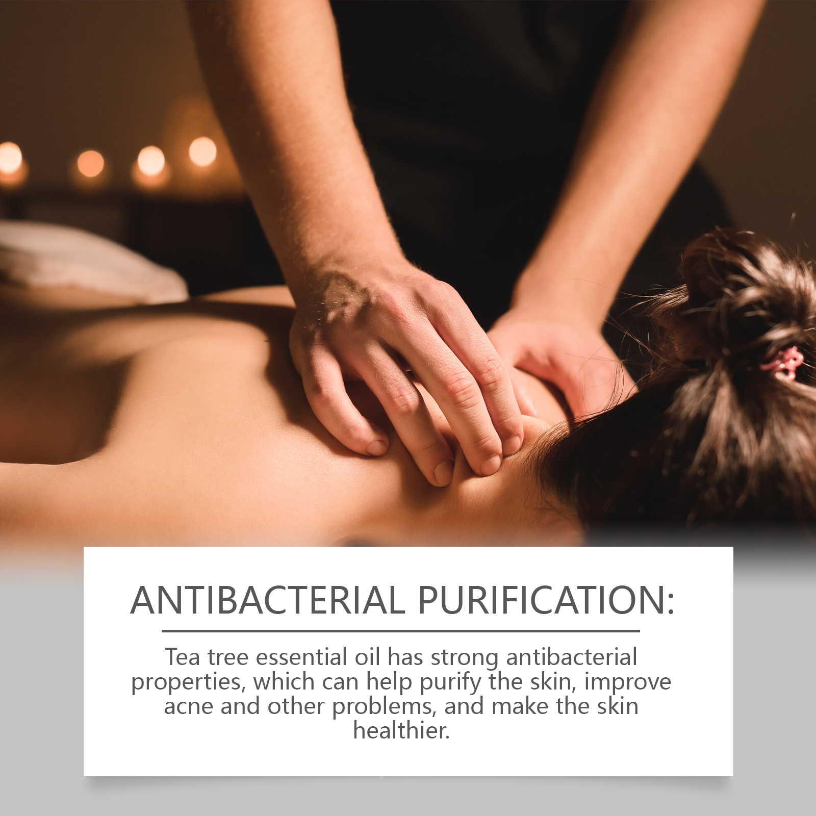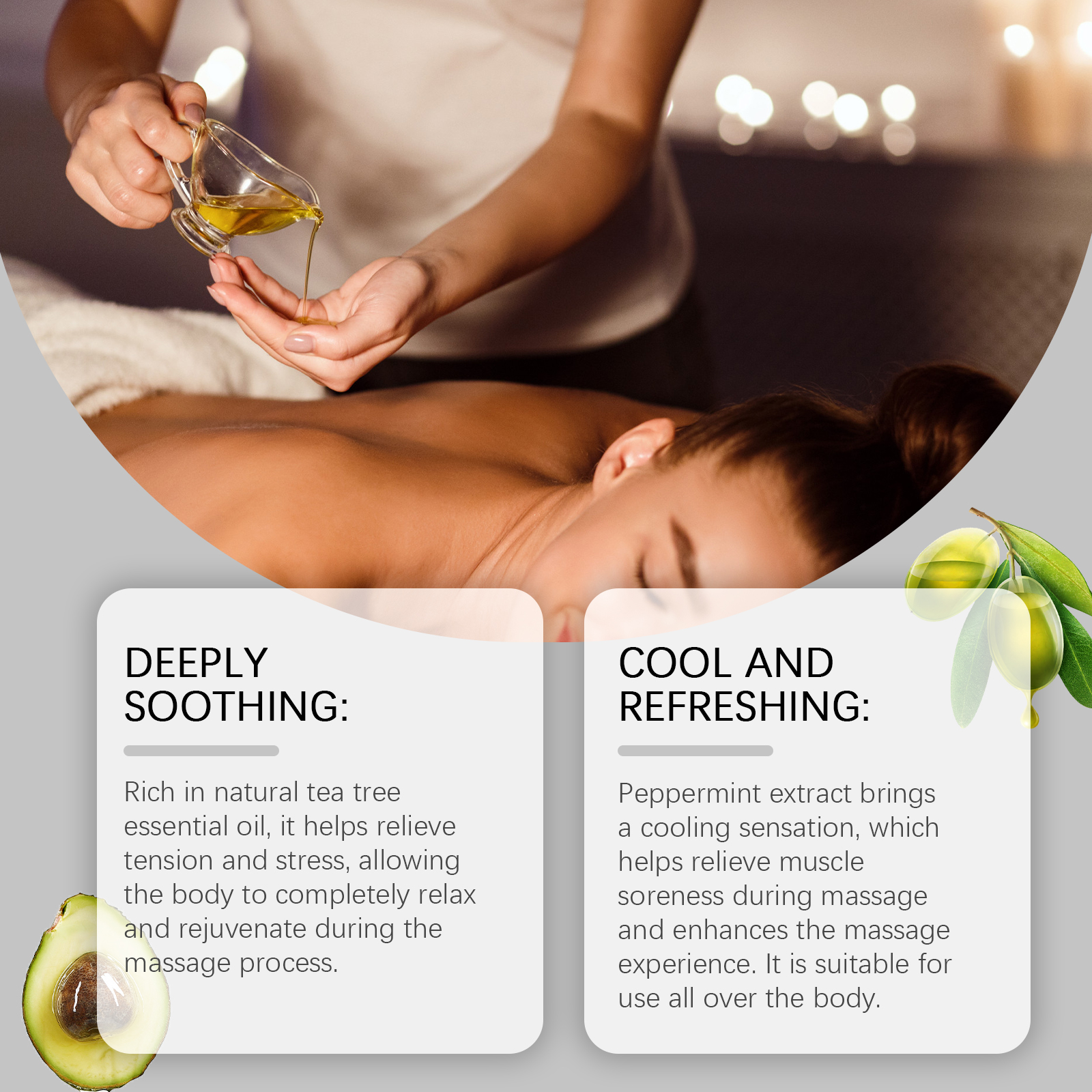 Our tea tree oil contains olive oil and shea butter. It can help purify the skin, improve acne and other problems, and make the skin healthier. Its application method is very simple: clean facial skin to keep skin dry, take appropriate amount of this product, apply to facial skin, gently massage until absorbed. And it can cool and soothe, reduce muscle soreness and bring a refreshing feeling.