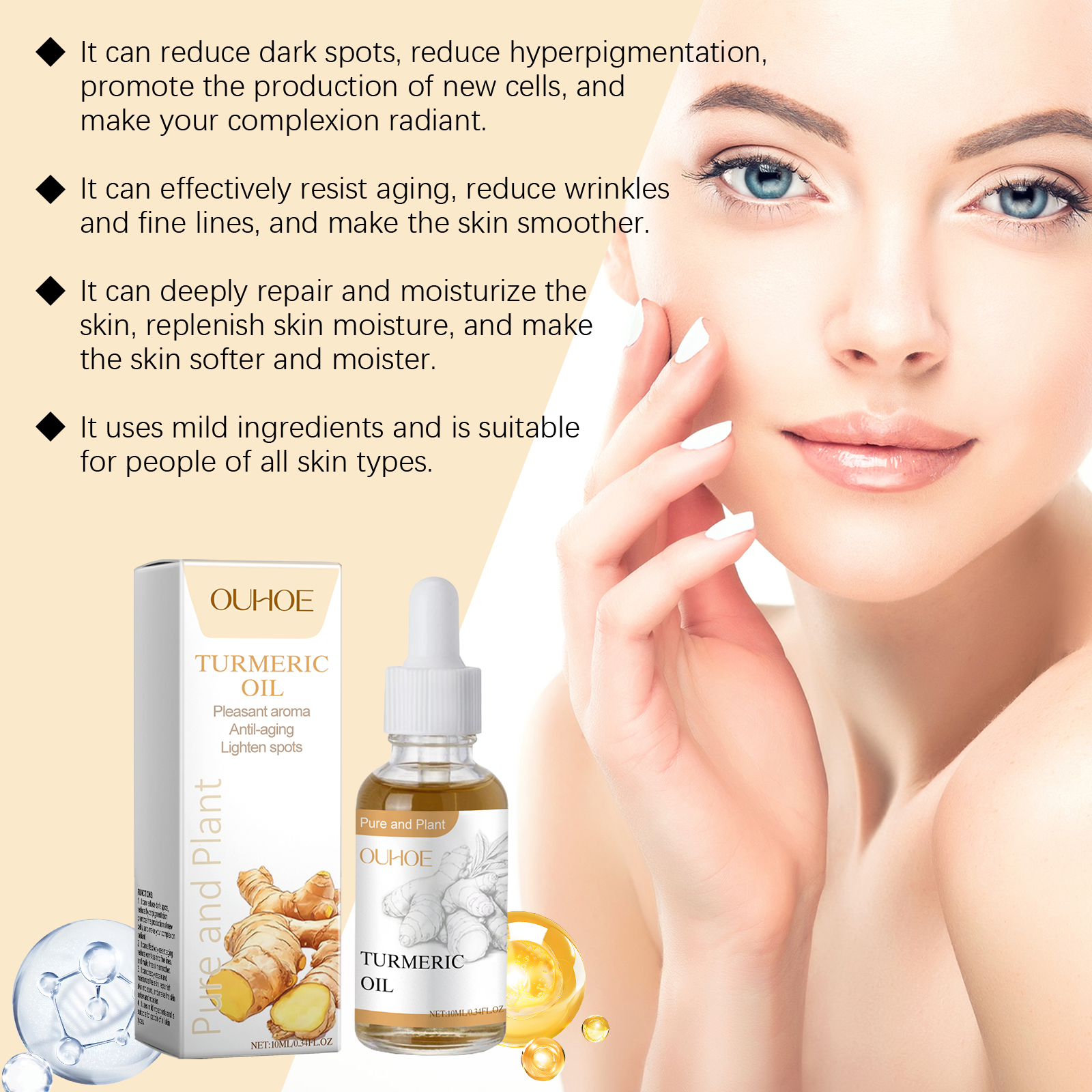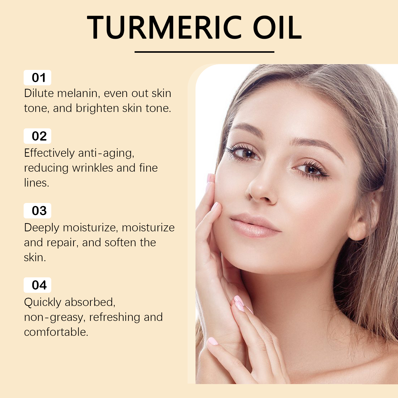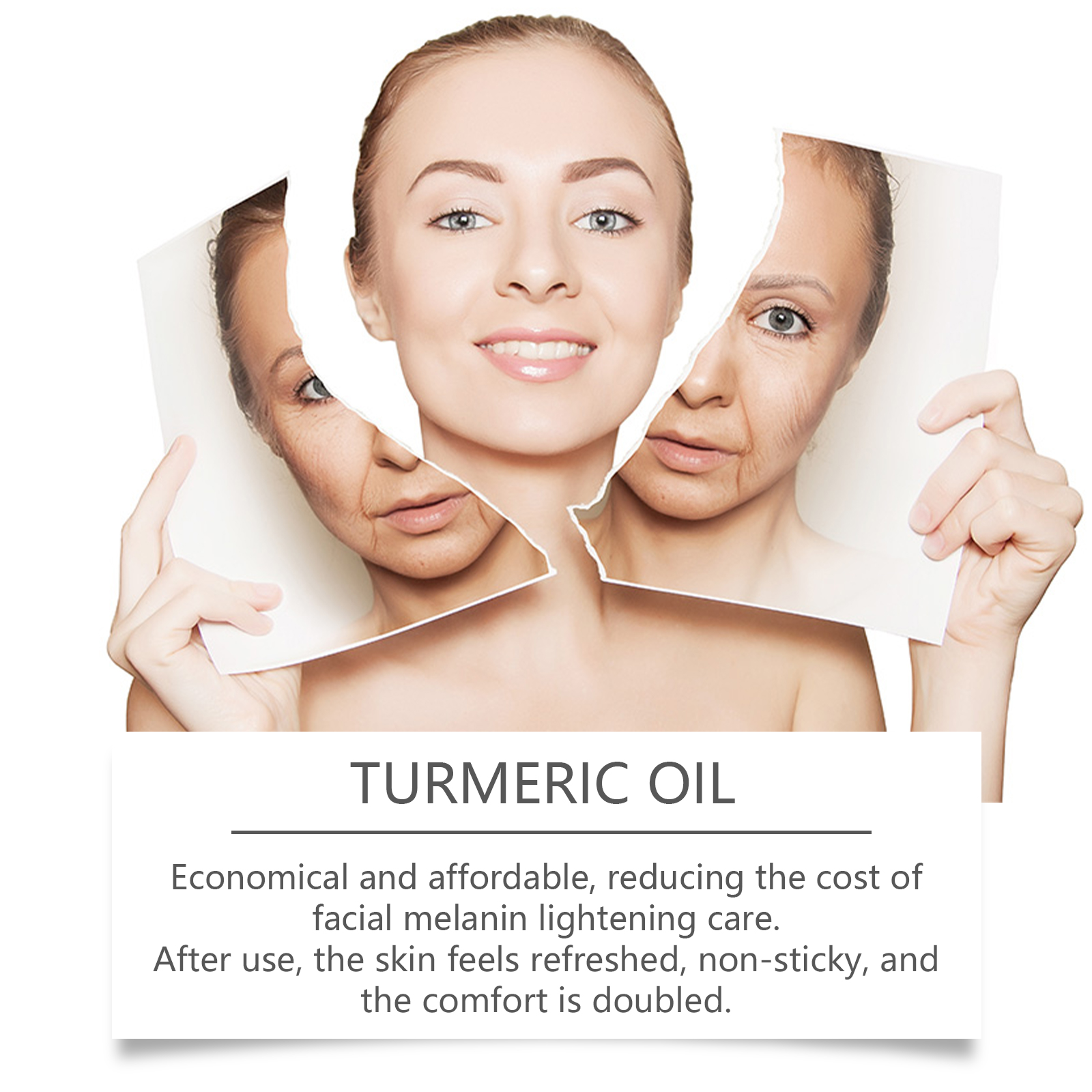 Our turmeric oil contains collagen and glycerin. It can improve the texture of the skin and make the skin more delicate and smooth. Its application is simple: clean your skin thoroughly and keep it dry. Apply appropriate amount of this product evenly on the face. Massage gently to promote absorption. And can effectively dilute melanin, even skin tone, restore skin luster.