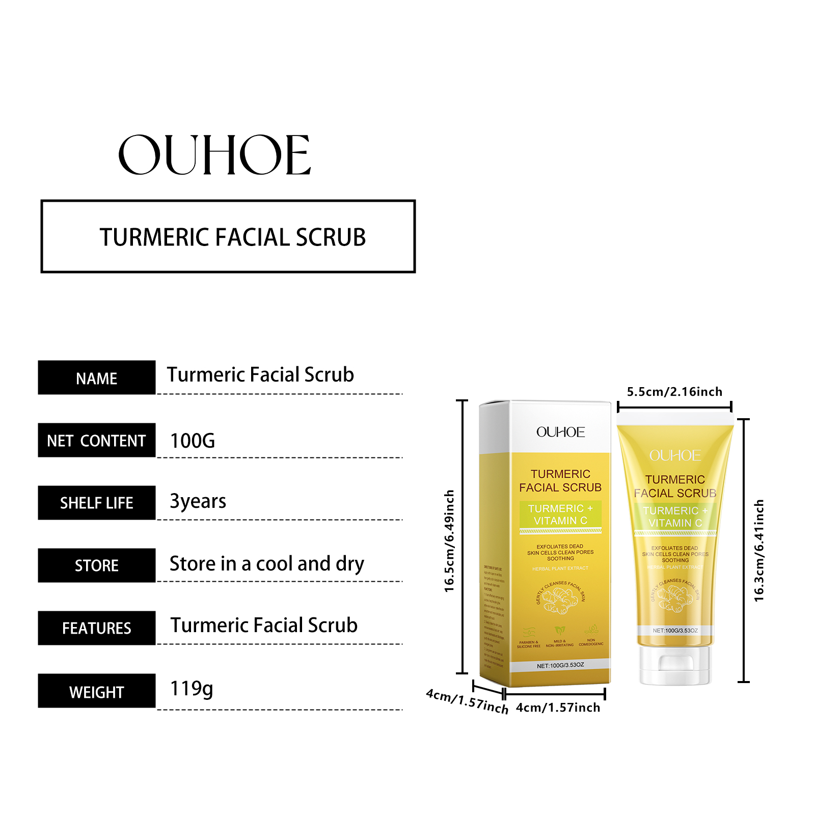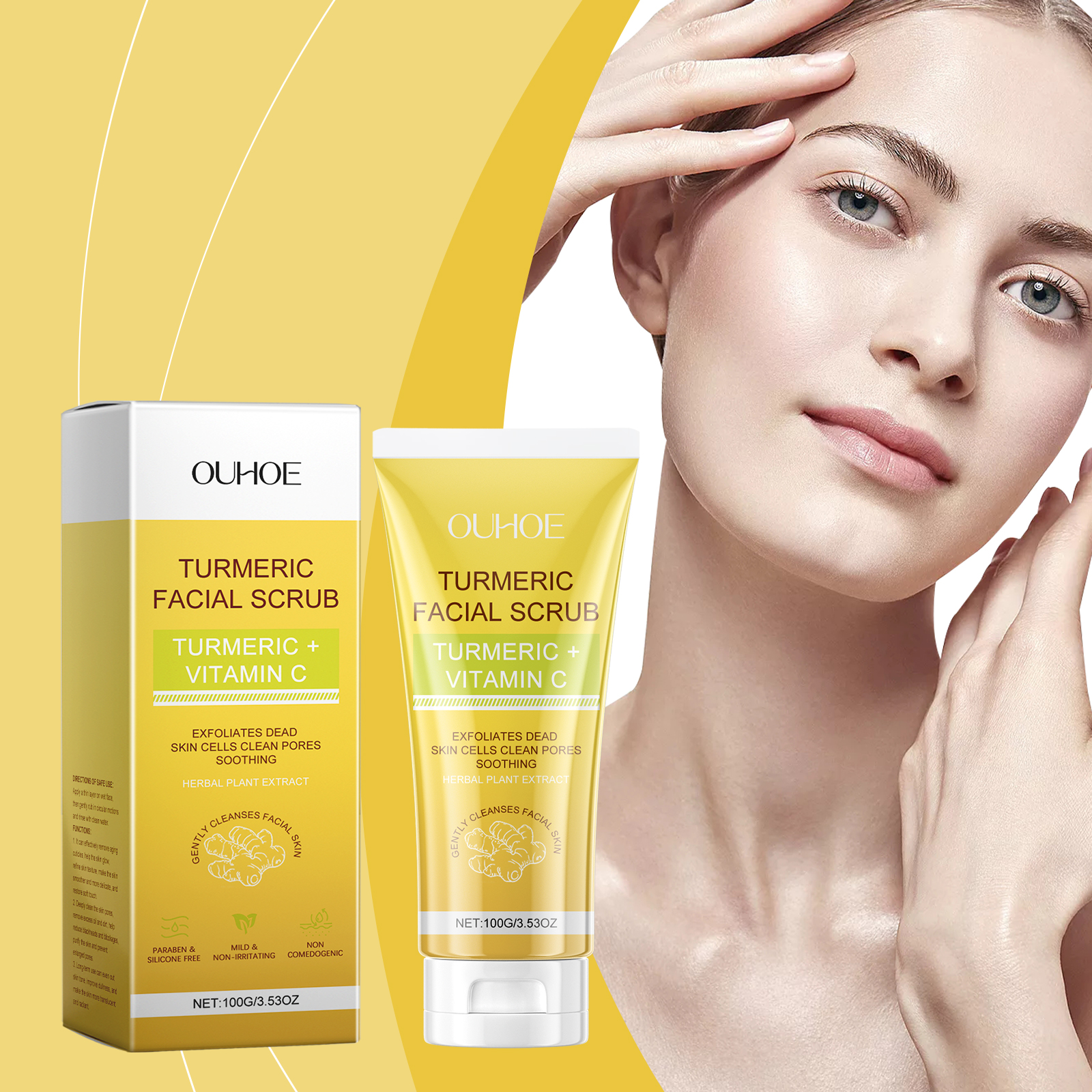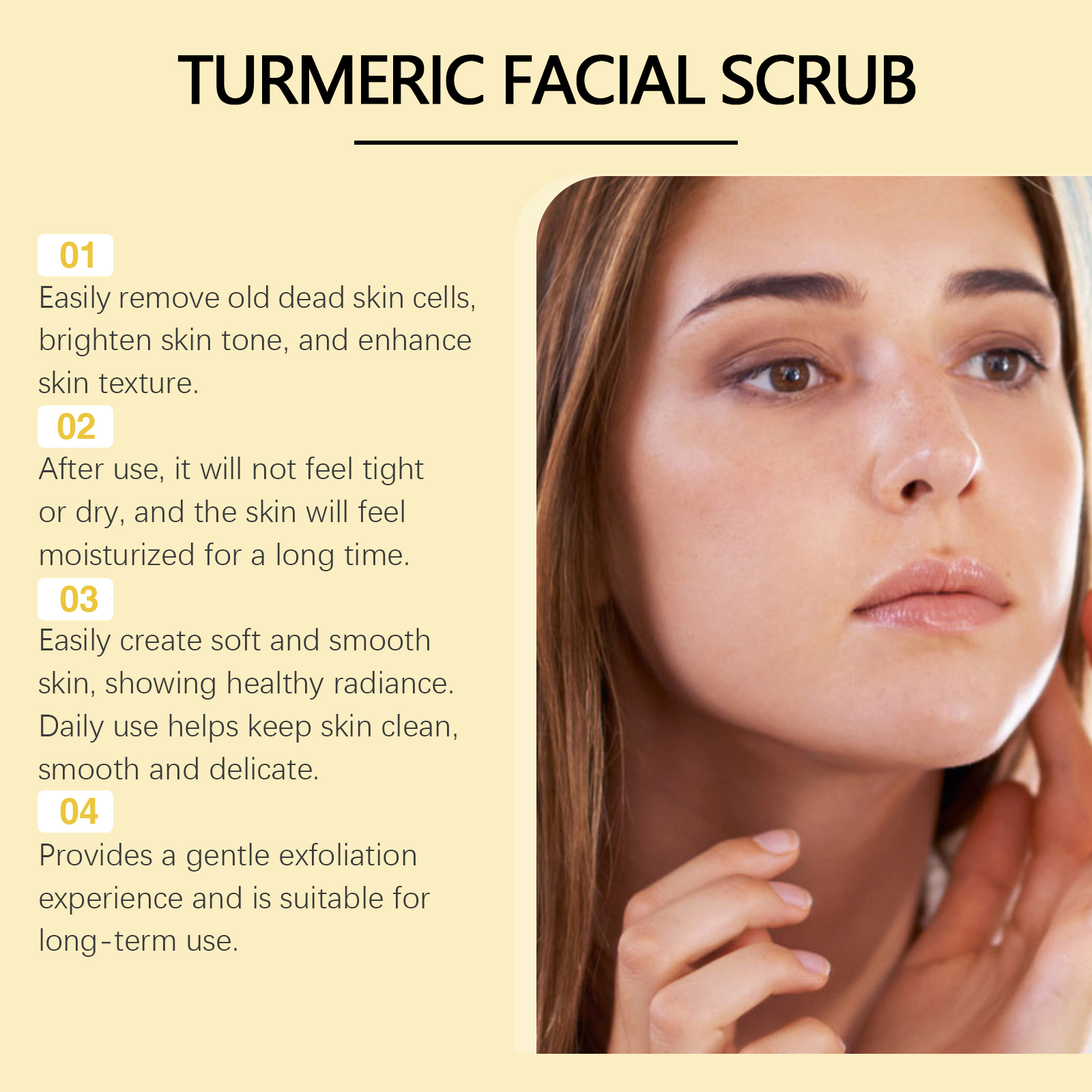 Our turmeric exfoliating facial scrub contains aloe vera leaf extract and walnut shell powder. It helps remove surface dirt and impurities, leaving skin feeling refreshed. The way to use it is simple: apply a thin layer to a wet face, then gently massage it in a circular motion and wash it off with clean water. And use a gentle massage formula to make the skin feel smooth and comfortable.