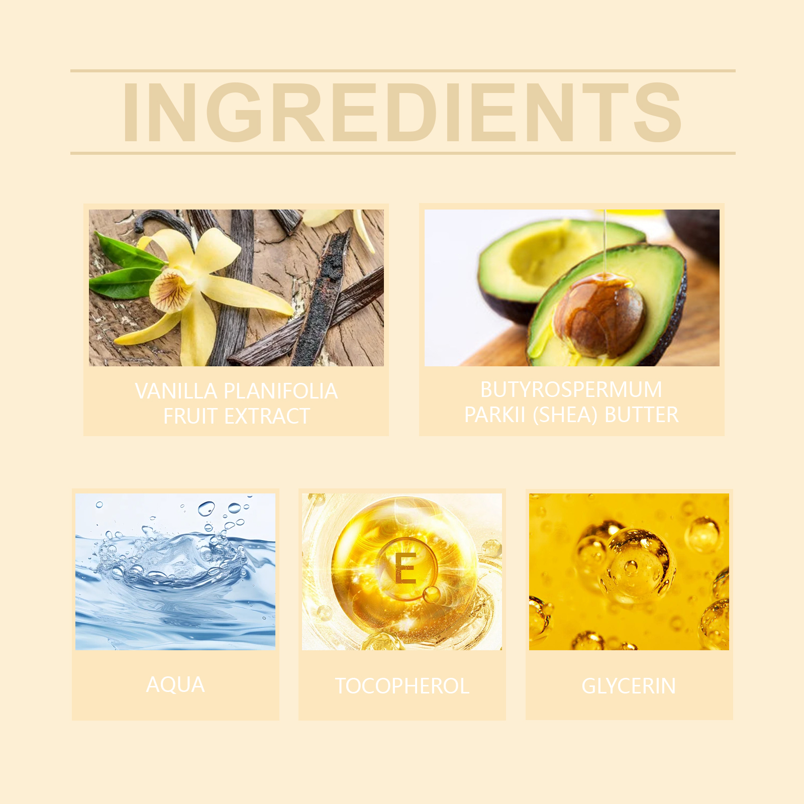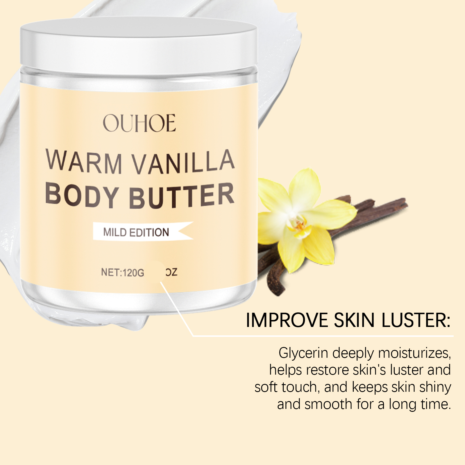Our vanilla body scrub contains glycerin, vitamin E (tocopherol). It deeply nourishes the skin, helps to lock in moisture, keeps skin soft and smooth, and effectively relieves dryness and tightness. Its application method is very simple: after moisturizing, apply appropriate amount of this product to the skin, massage in gentle circular motions for 3 minutes, rinse with warm water, and keep dry. It is mild and non-irritating, safe for daily use, and restores skin health.