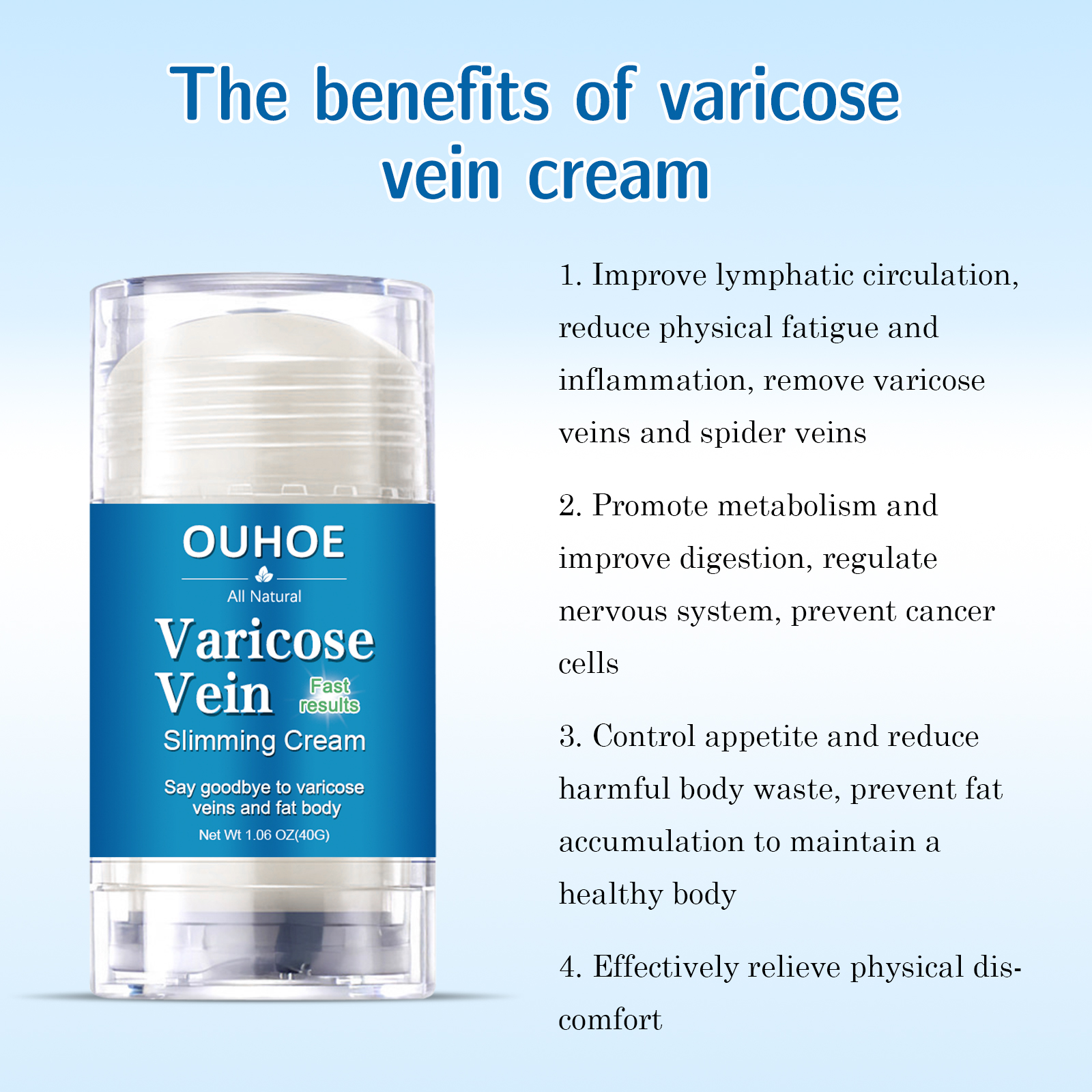 Our IV slimming cream contains black pepper and saffron. It can improve lymphatic circulation, reduce body fatigue and inflammation, and remove varicose veins and spider veins. Its use method is very simple: after cleaning the varicose area, apply an appropriate amount of soothing cream on varicose X, massage evenly to help the ointment absorb and penetrate, repeated use for 4-12 weeks, the effect will have a significant change. And it can control appetite, reduce harmful waste in the body, prevent fat accumulation, and maintain good health.