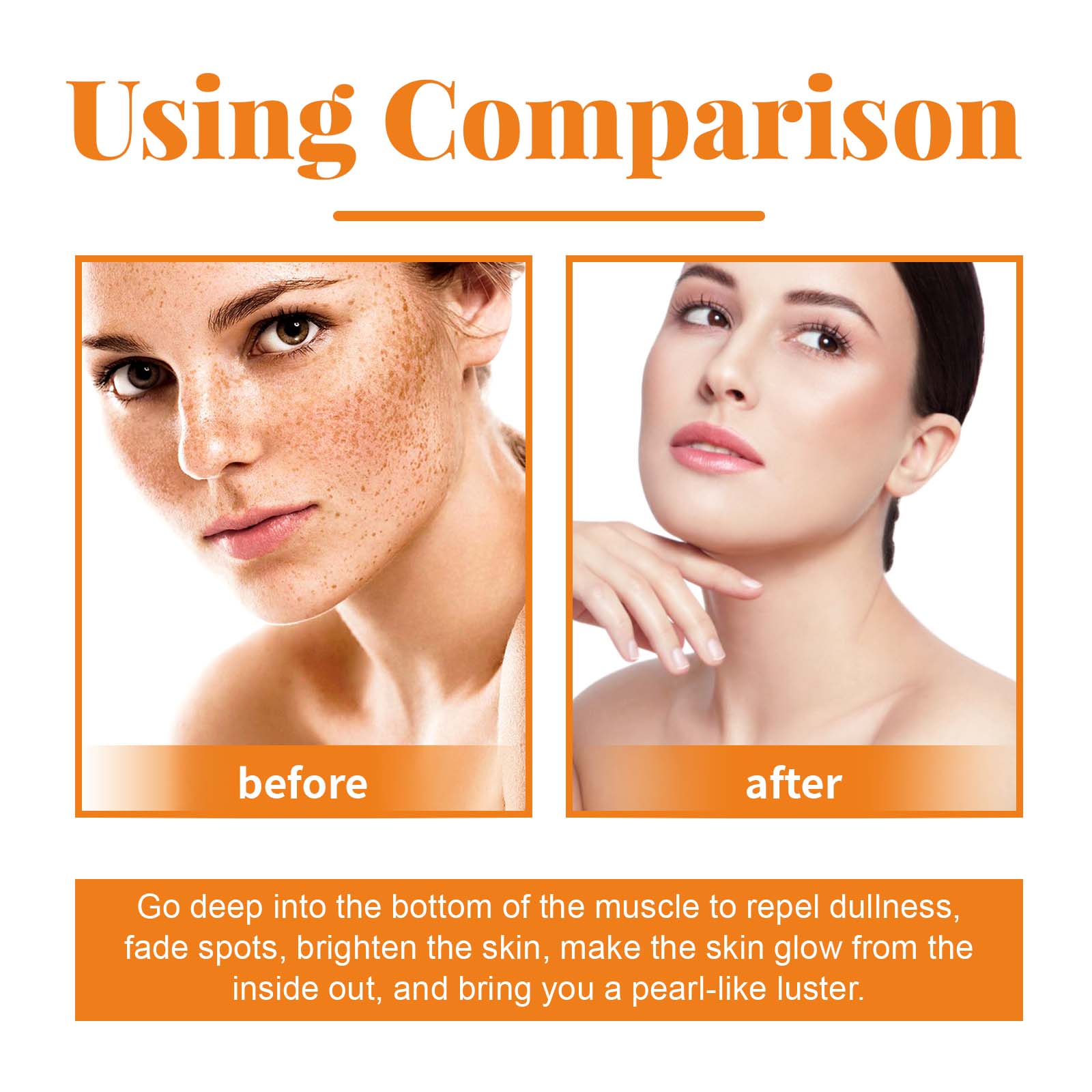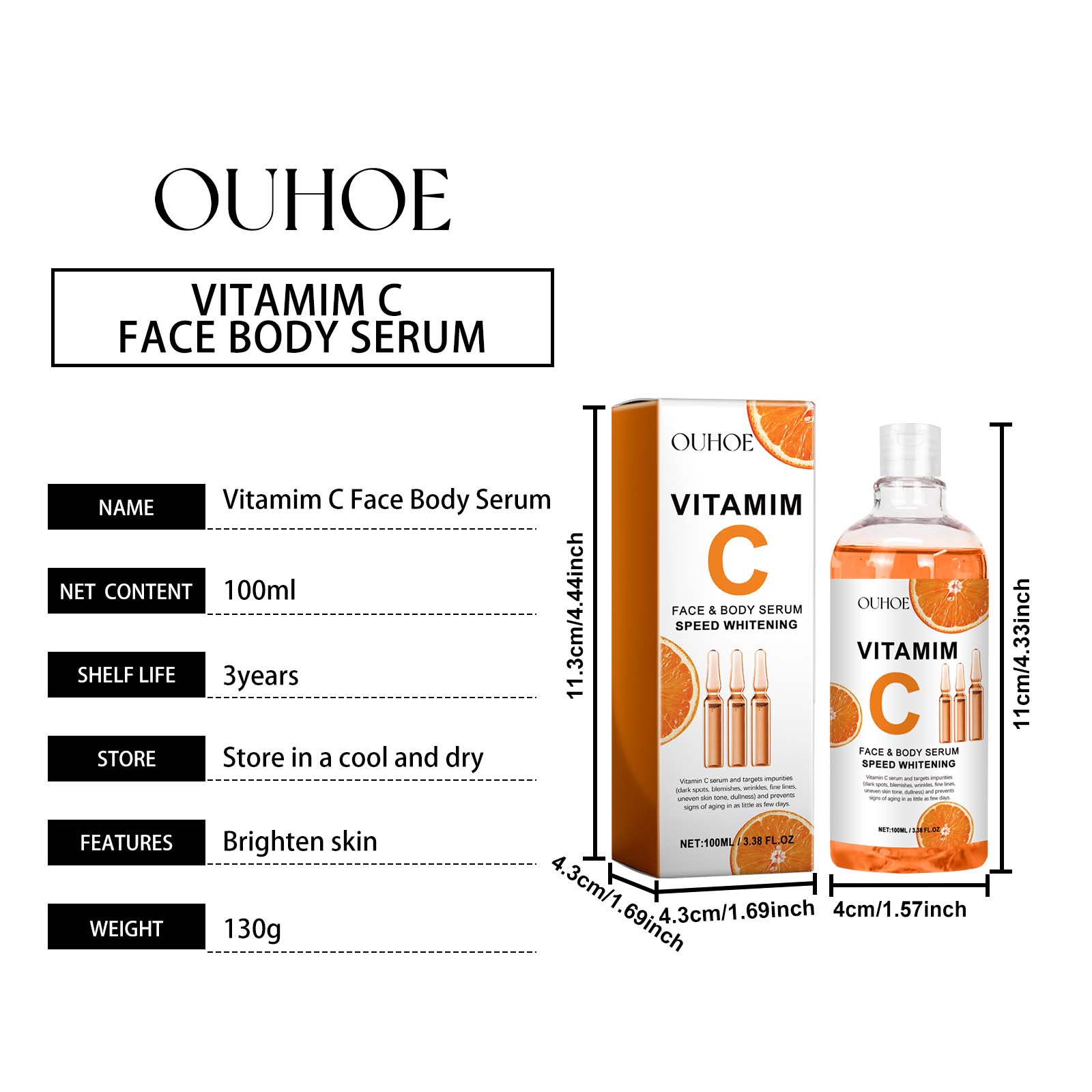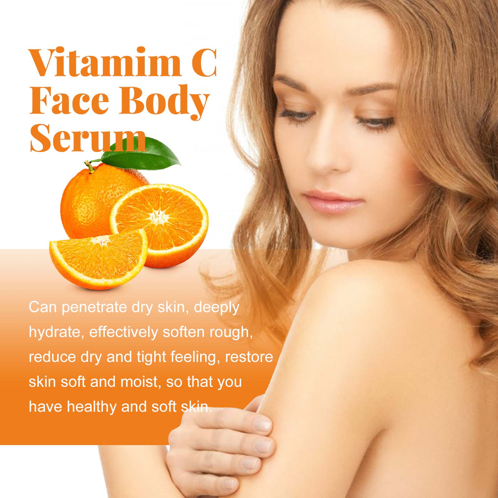 Our Vitamim C Face Body Serum contains vitamin C, tea extract, niacinamide. It can go deep into the bottom of the muscle to fight off dullness, fade spots, brighten the skin, make the skin glow from the inside out, bring you a pearl-like luster, improve skin elasticity and firmness, fight against slack, reshape the face and body line, and make you feel youthful and energetic. Its application method is very simple: clean and dry the skin of the face and body, apply an appropriate amount of serum evenly on the skin, and gently massage until absorbed. It can penetrate dry skin, deeply moisturize, effectively soften roughness, relieve dry and tight feeling, restore skin tenderness and moisture, so that you have healthy and soft skin.
