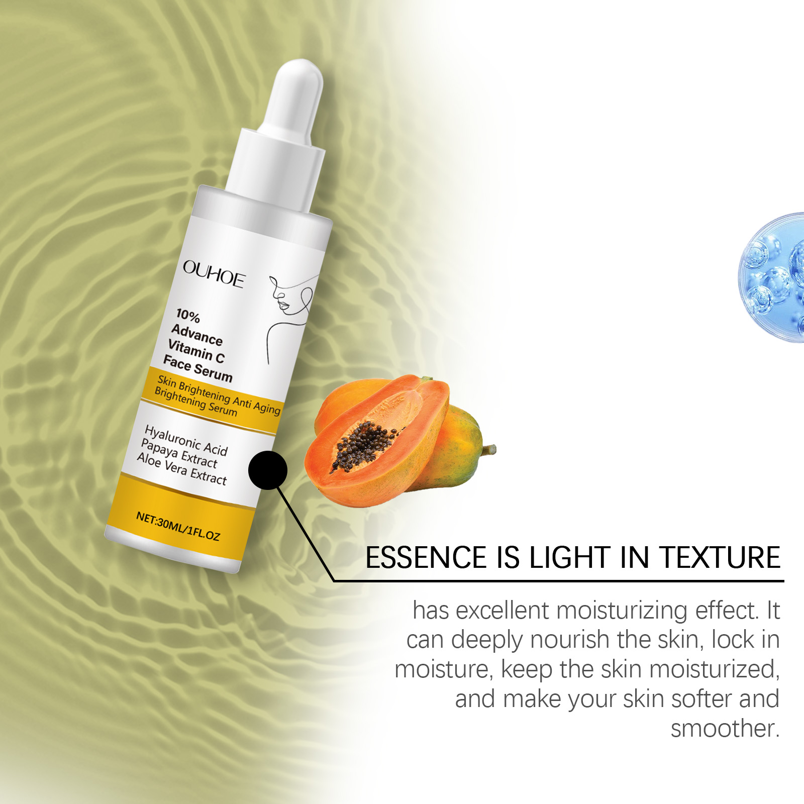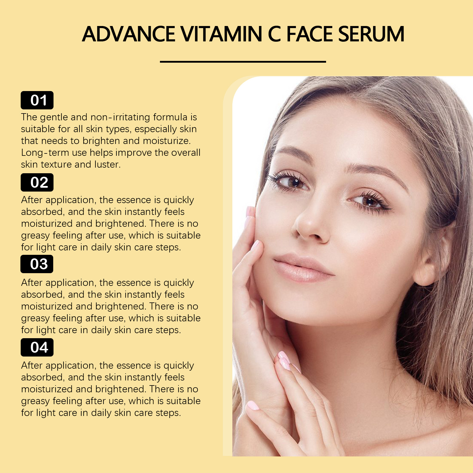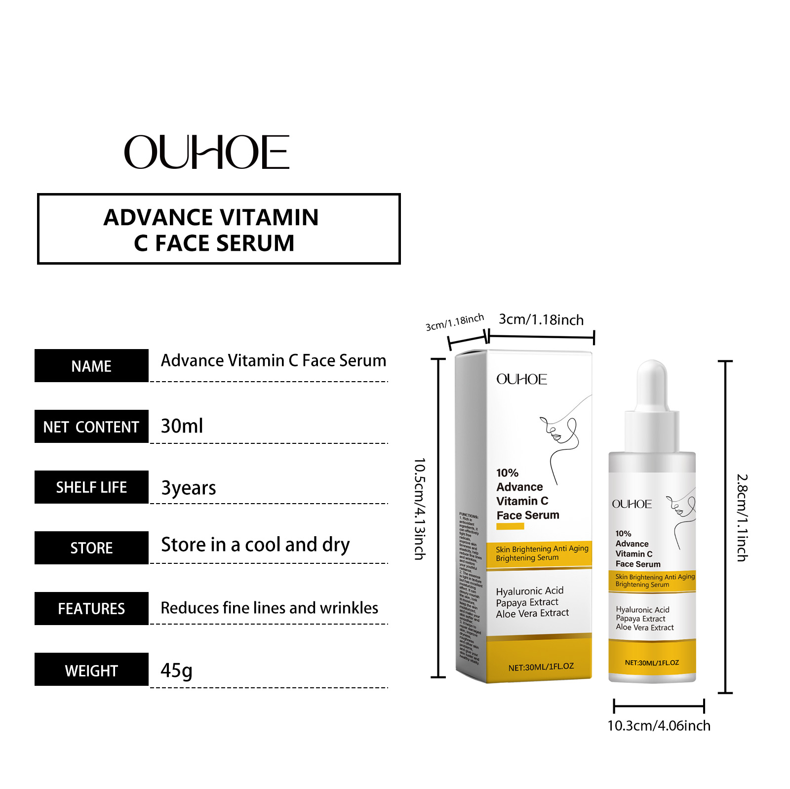 Our Vitamin C face serum contains papaya extract, aloe vera extract. It can lighten skin tone, improve dull skin tone, even skin tone, and make skin glow healthy. The way to use it is simple: clean the facial skin and keep the skin dry. Apply appropriate amount of this product evenly on the face. Gently massage until absorbed. It can also improve skin firmness and elasticity, help reduce fine lines and wrinkles, and restore your youthful glow.