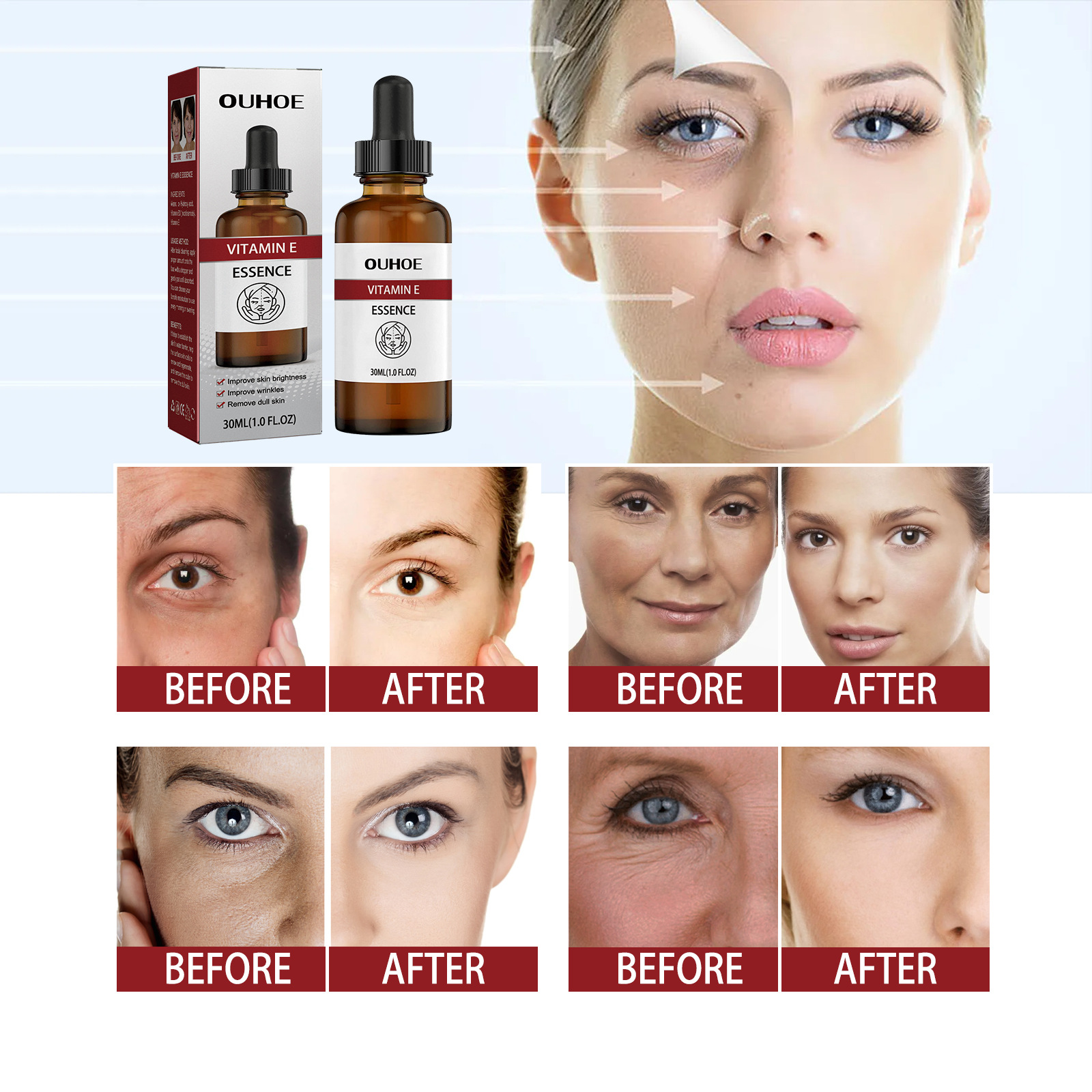 Our Vitamin E serum contains A-hydroxyacid, vitamin B3 nicotinamide, vitamin E. It can help build the skin's water barrier, help skin surface cells renew and regenerate, exfoliate and remove dull skin. Its use method is very simple: after cleansing, take an appropriate amount of this product with a suction cup gently pat until absorbed. You can choose your favorite moisturizer to use every morning or evening. Vitamin E serum improves skin shine, improves wrinkles, and removes dull skin.