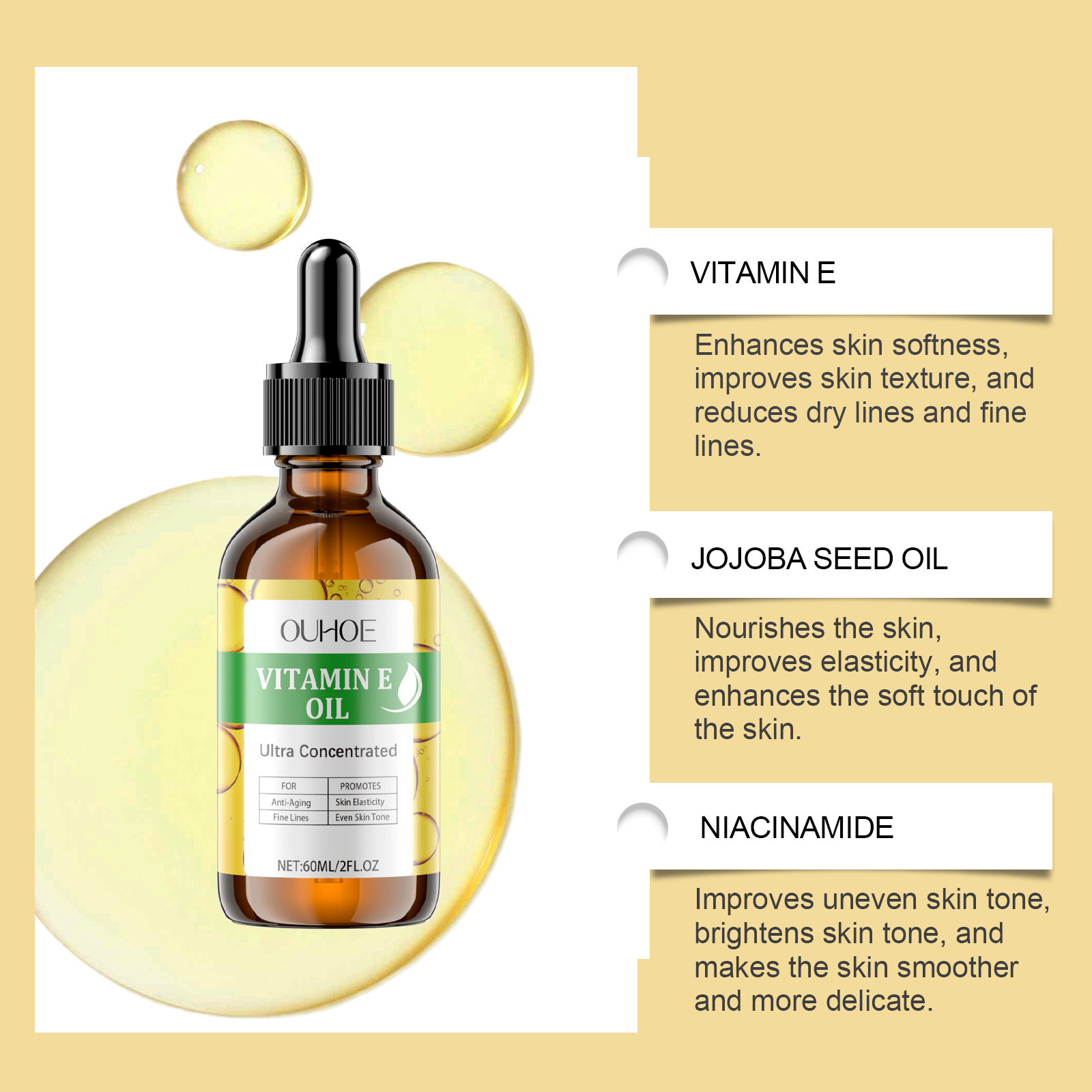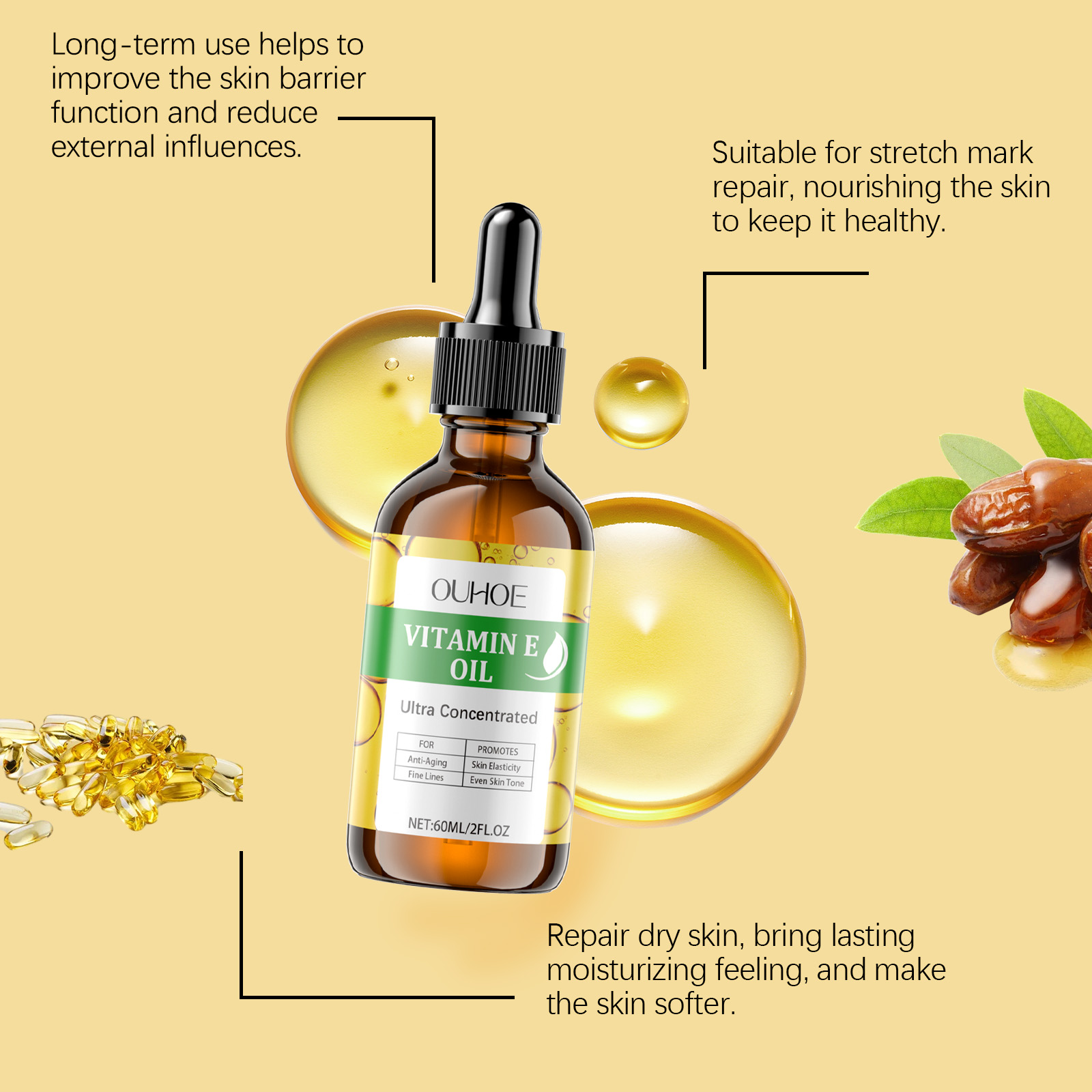 Our vitamin E essential oil contains mineral oil and vitamin E (tocopherol). It can be applied to all joints and is convenient and efficient to use. After use, the skin becomes smooth and firm, with improved roughness and enhanced luster. Its usage is very simple: Apply 2-3 drops of this product to the face, hands, feet, hair, nails or other required areas each time. Gently massage until fully absorbed. And it can remove stretch marks and blemishes, restoring the skin's fine and smooth texture.