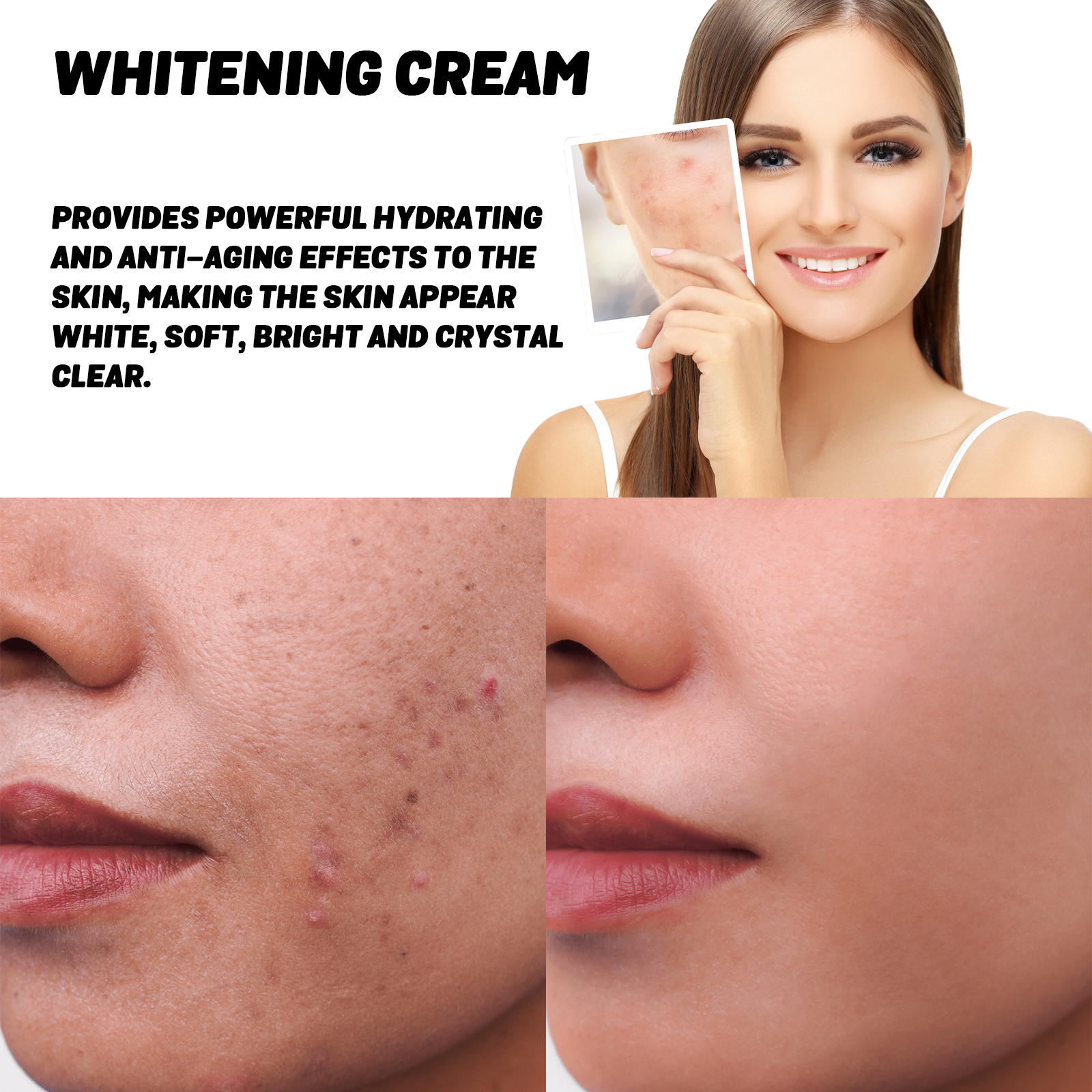 Our Whitening Cream contains niacinamide, allantoin, cocos nucifera (coconut) oil. It can quickly whiten and lighten spots, promote the production of collagen, and restore the skin's even skin tone. Its application is simple: Clean and dry skin.Take an appropriate amount of product and apply it on the skin. Gently massage until absorbed. Provides powerful hydrating and anti-aging effects to the skin, making the skin appear white, soft, bright and crystal clear.