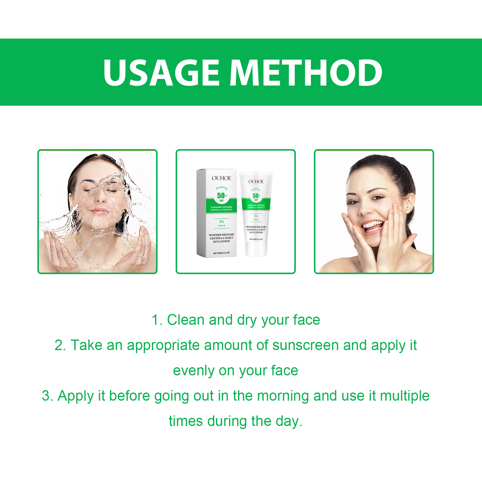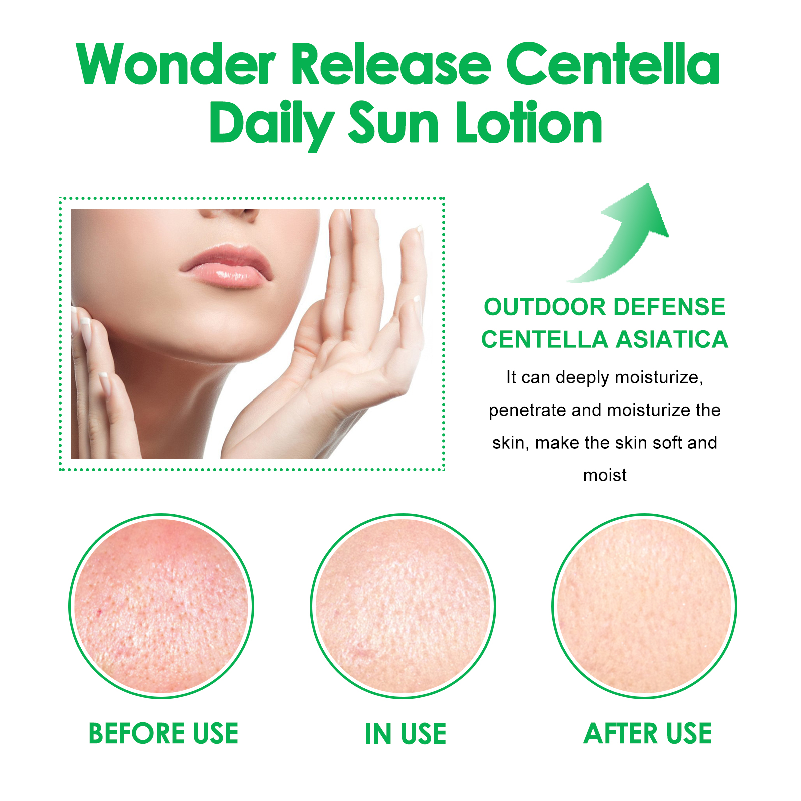 Our Wonder Release Centella Daily Sun Lotion contains Titanium Dioxide, Ceramide 1, Centella Asiatica Extract. It can effectively fight against ultraviolet rays. The ingredients in the product can reduce the problems of skin redness, dryness and sunburn after sunburn, comprehensively protect the skin, deeply moisturize the skin, penetrate and moisturize the skin, make the skin soft and moist, restore elasticity and luster. The way to apply it is simple: clean and dry your face, apply the appropriate amount of sunscreen evenly on your face, apply it in the morning before going out, and reapply it several times during the day. Prevents stains and wrinkles, leaving skin looking younger and firmer.