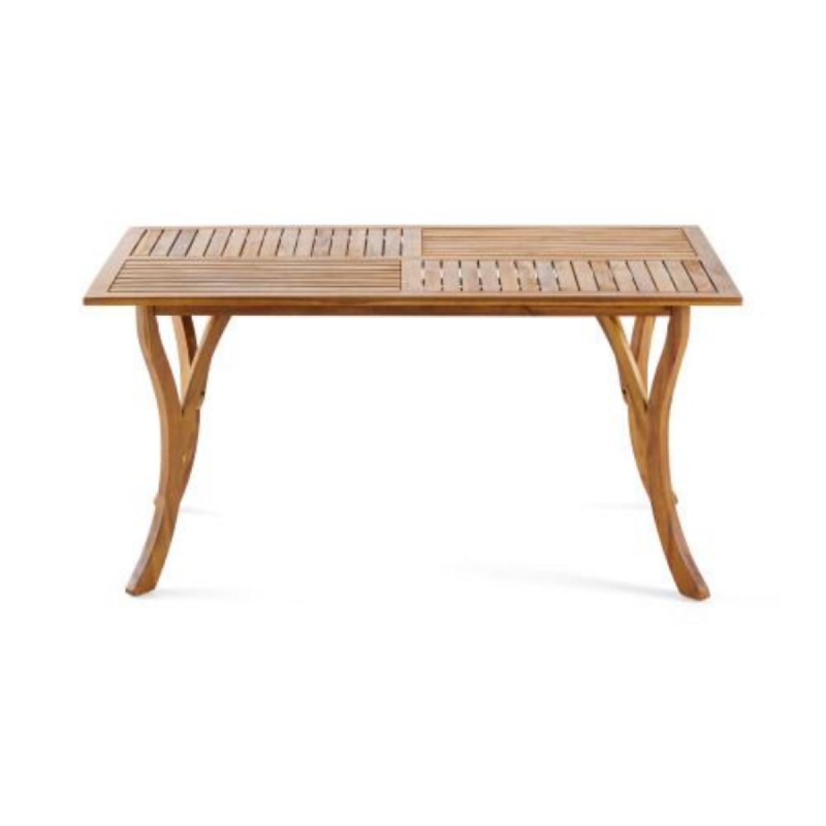 • The beautiful teak finish and slatted acacia wood design imbue this table with its seaside-styled look, while the gracefully curved legs add a touch of elegance.