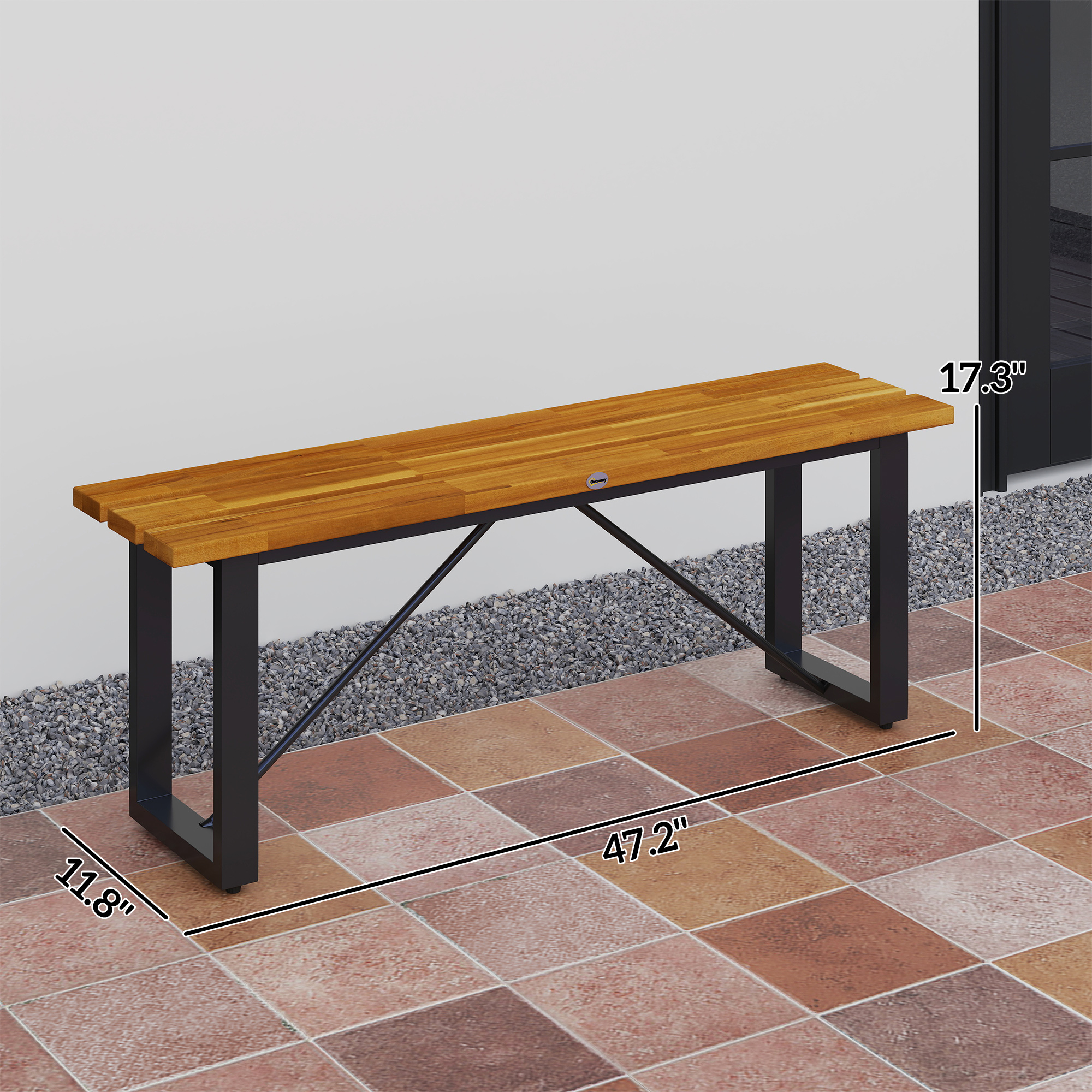 - Elegant Wood Top: This wooden patio bench features varnished acacia wood slats, showcasing a natural and refined texture that resists bending, corrosion, and water build-up for long-lasting outdoor use