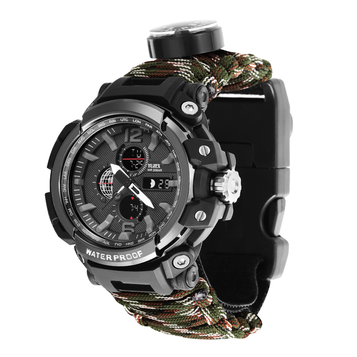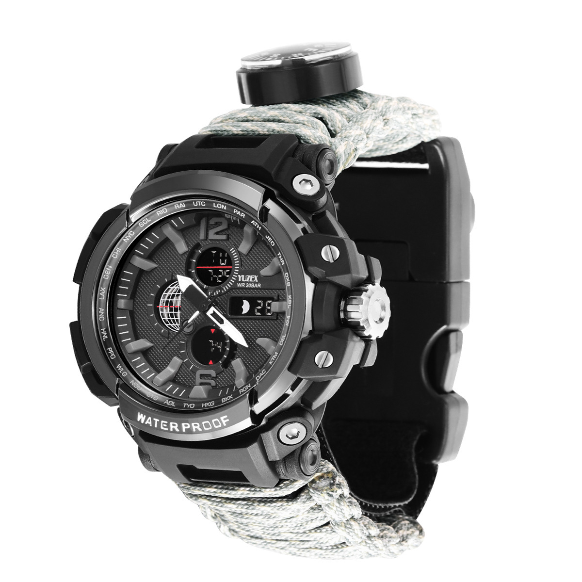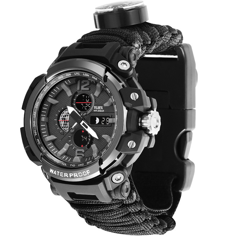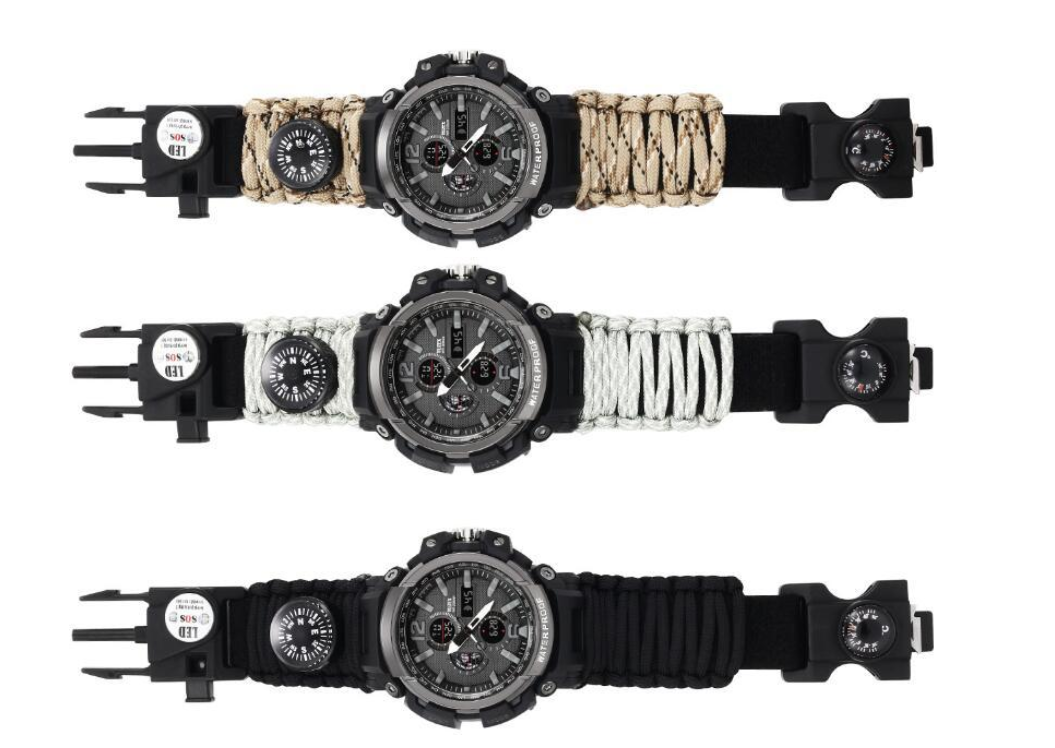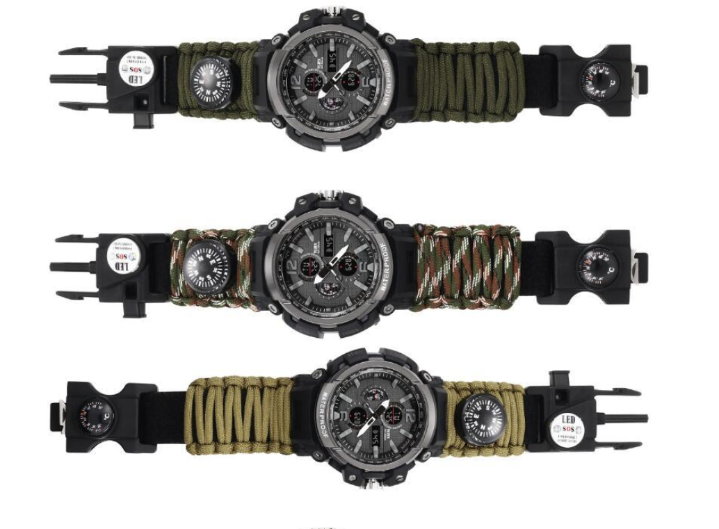 Functions: 1 LED light, 2 thermometer, 3 compass, 4 survival whistle, 5 card taking needle, 6 firecracker, 7 scraper, 8 umbrella rope, 9 time, 10t knife