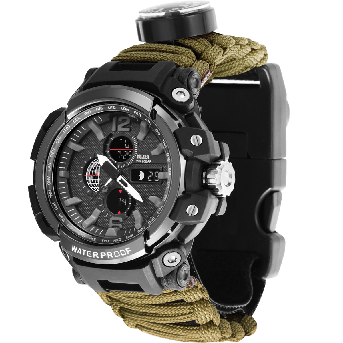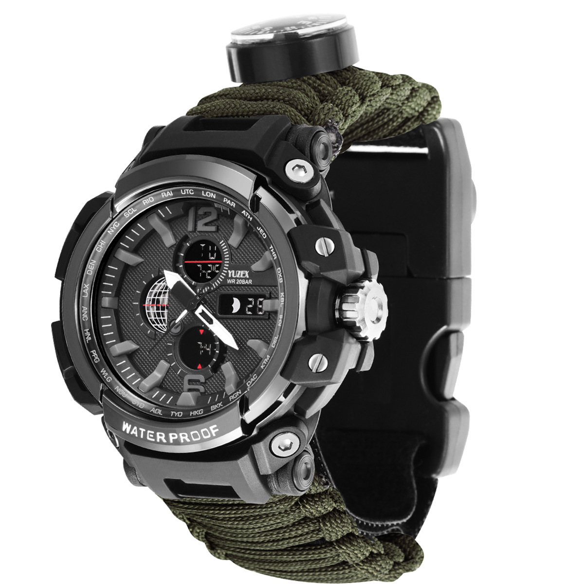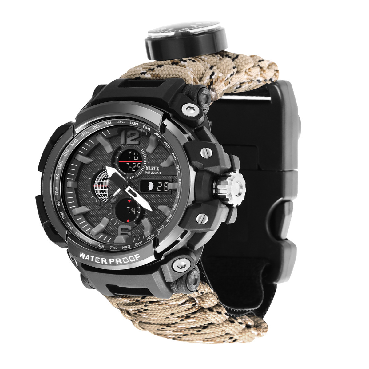 Functions: 1 LED light, 2 thermometer, 3 compass, 4 survival whistle, 5 card taking needle, 6 firecracker, 7 scraper, 8 umbrella rope, 9 time, 10t knife