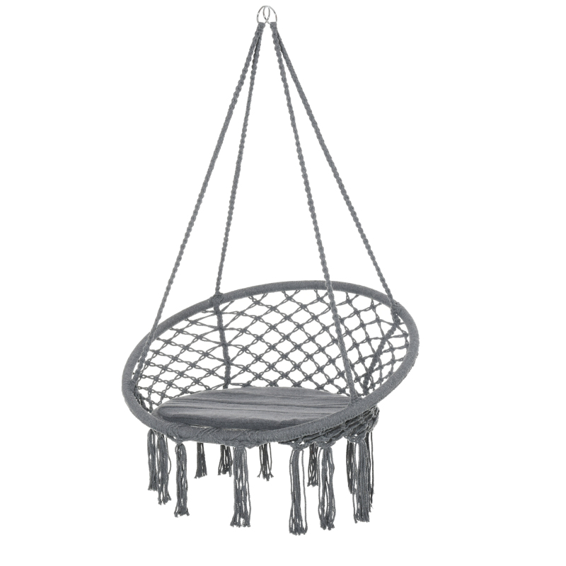 The bohemian hanging rope chair is a delightful piece to look at and lounge in on a lazy afternoon. Made from metal frame, so the garden hammock chair keeps in shape, with woven polycotton to hold you in place and the padded cushion for comfort. Four long strings to hold hang the chair up in place, our garden swing hammock is finished with tassels on the bottom for extra style.