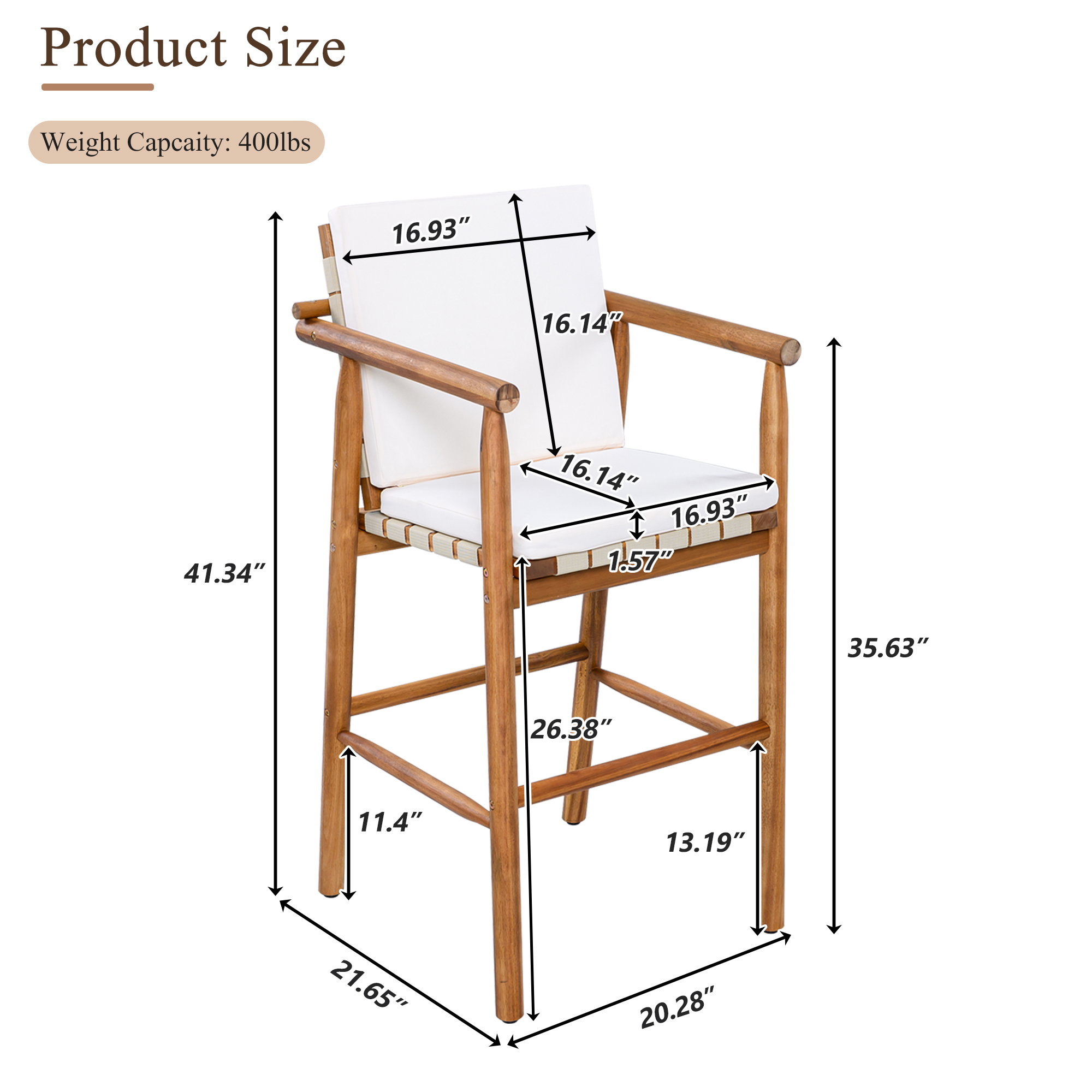 Product Name:Outdoor Counter Height Bar Stools Chair Set of 2, Modern Patio Acacia Wooden Stools with Backrest Arm and Webbing Seat, for Patio, Pool, Garden, Beige Cushions Included
