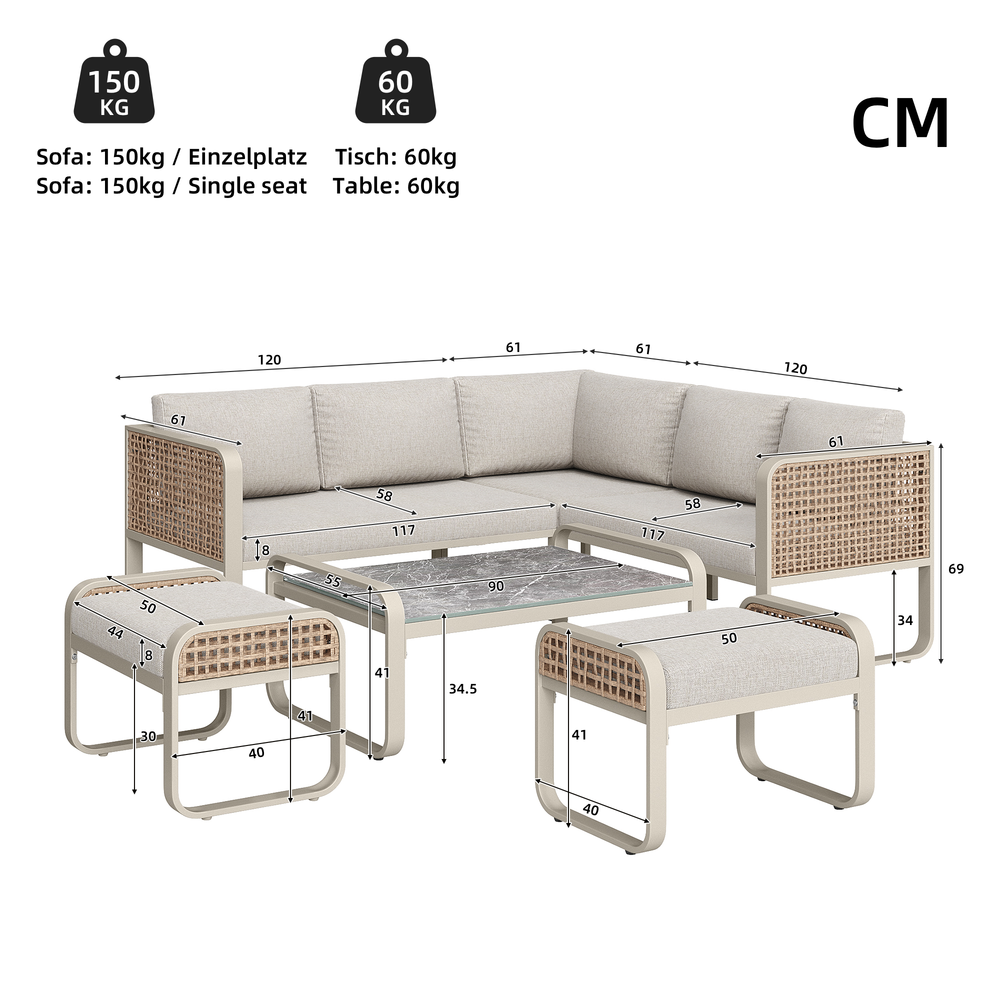 | Product Dimensions | Large sofa*2:120*61*69cm Small sofa*1:61*61*69cm Sofa bench:50*40*41cm Table:90*55*41cm |