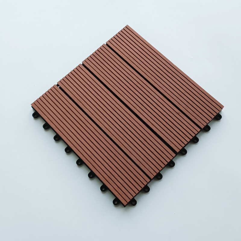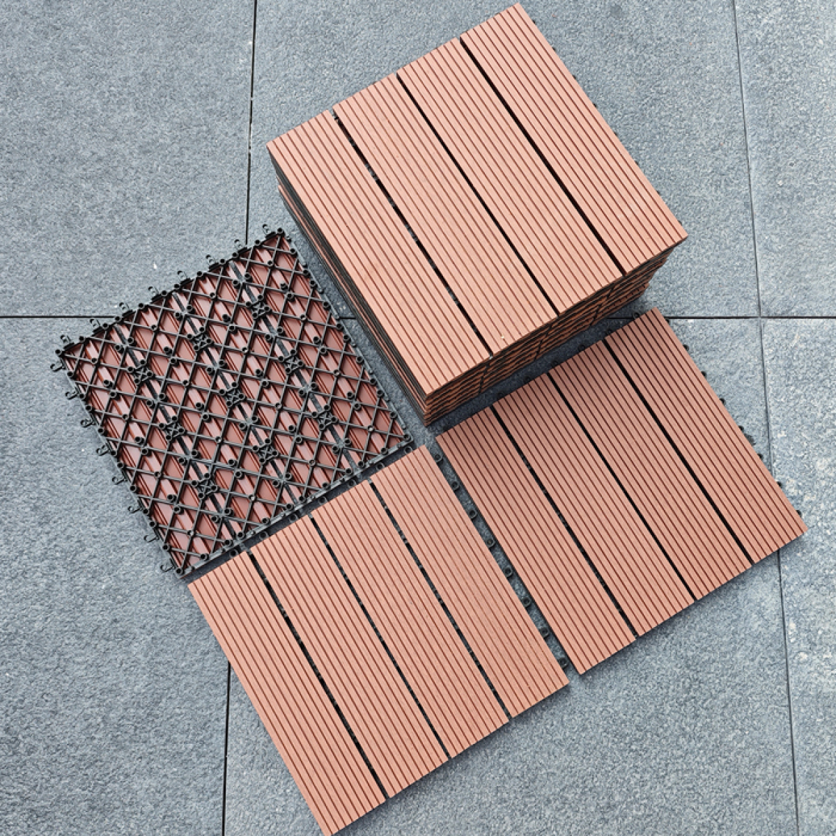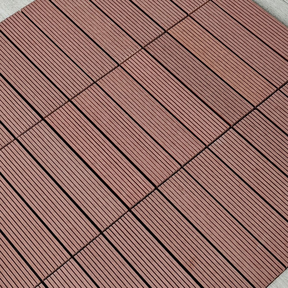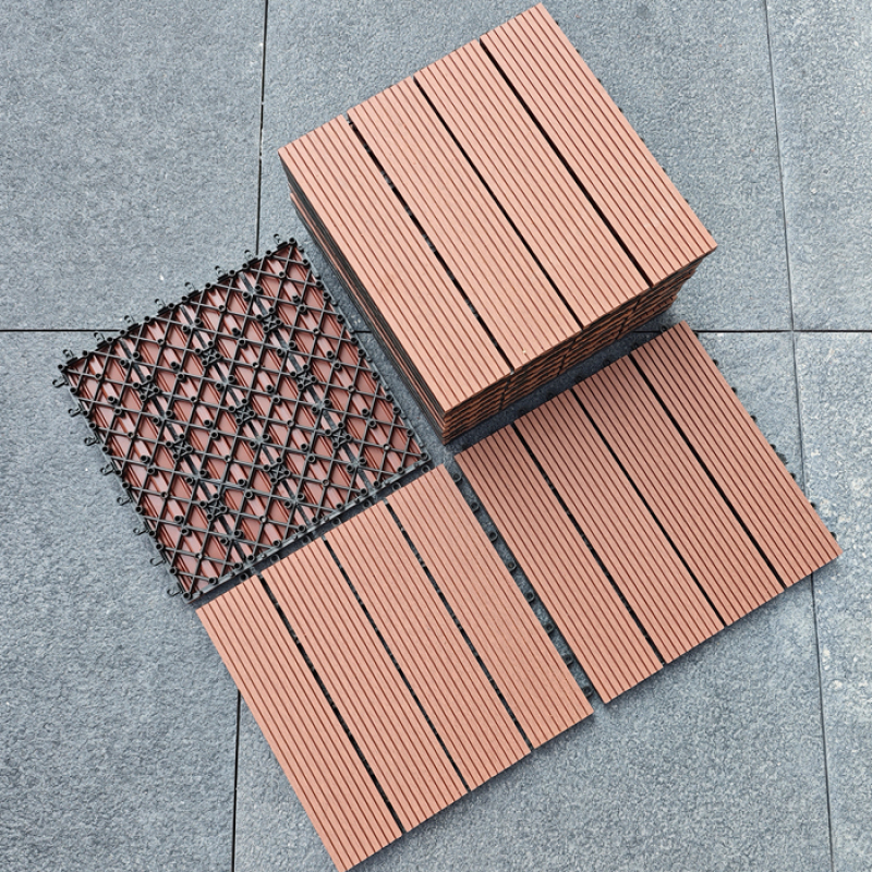 A box of 11 pieces, covering an area of 1 square meter, with a size of 300 * 300 * 22mm per piece, made of wood plastic composite material and plastic bottom plate, easy to install and assemble with snap fasteners to lay on the ground, corrosion-resistant and high temperature resistant, with a lifespan of over 15 years.