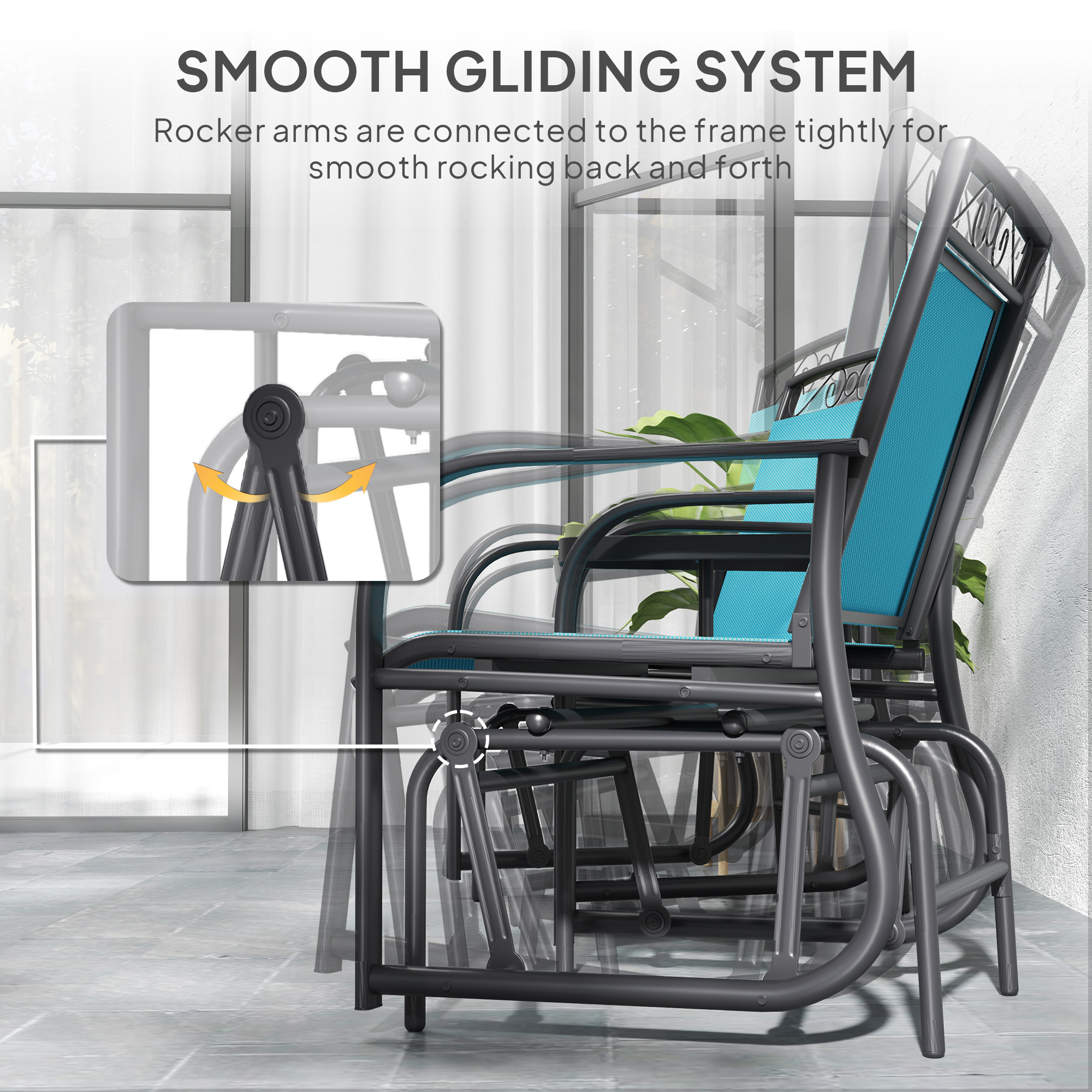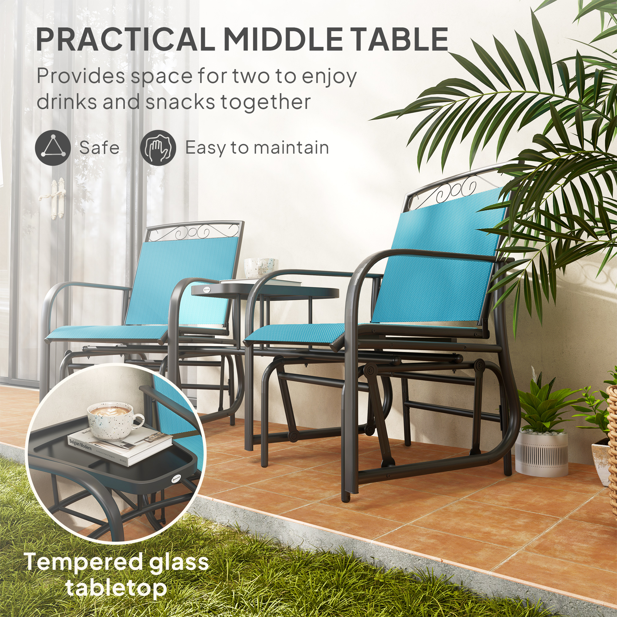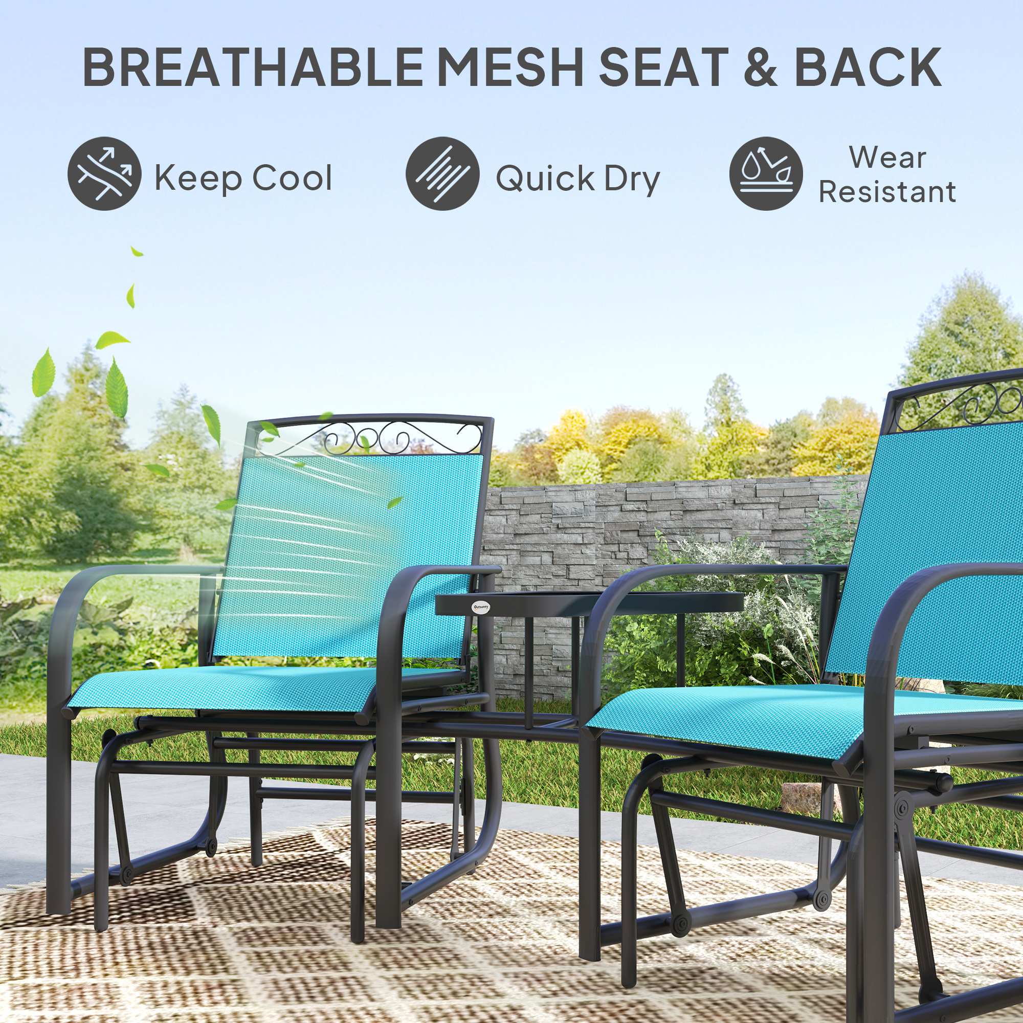 Outdoor Glider Chairs With Coffee Table, Patio 2-Seat Rocking Chair Swing With Breathable Sling For Backyard, Blue