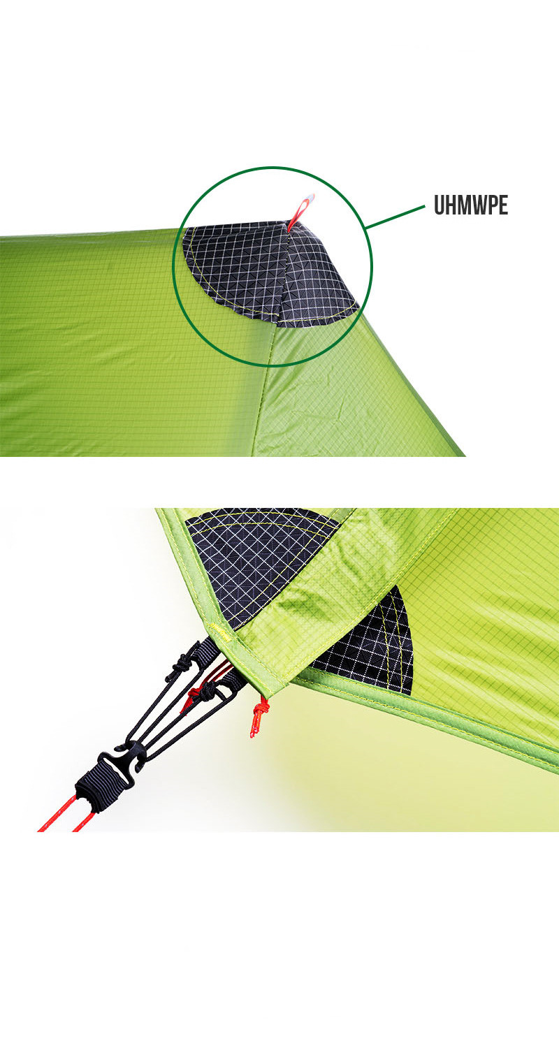 Outer tent material: 20D custom double-sided silicon coated fabric (waterproof index 2500mm)