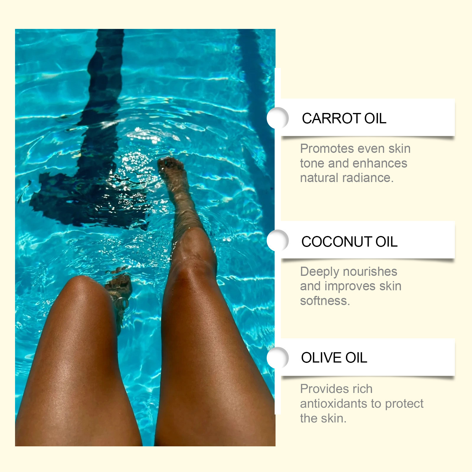 Product Ingredients: Water, Glycerol, Cetearyl Alcohol, Glycerol stearate, Carbopol, Triethanolamine, Carrot Oil, Coconut Oil, Olive